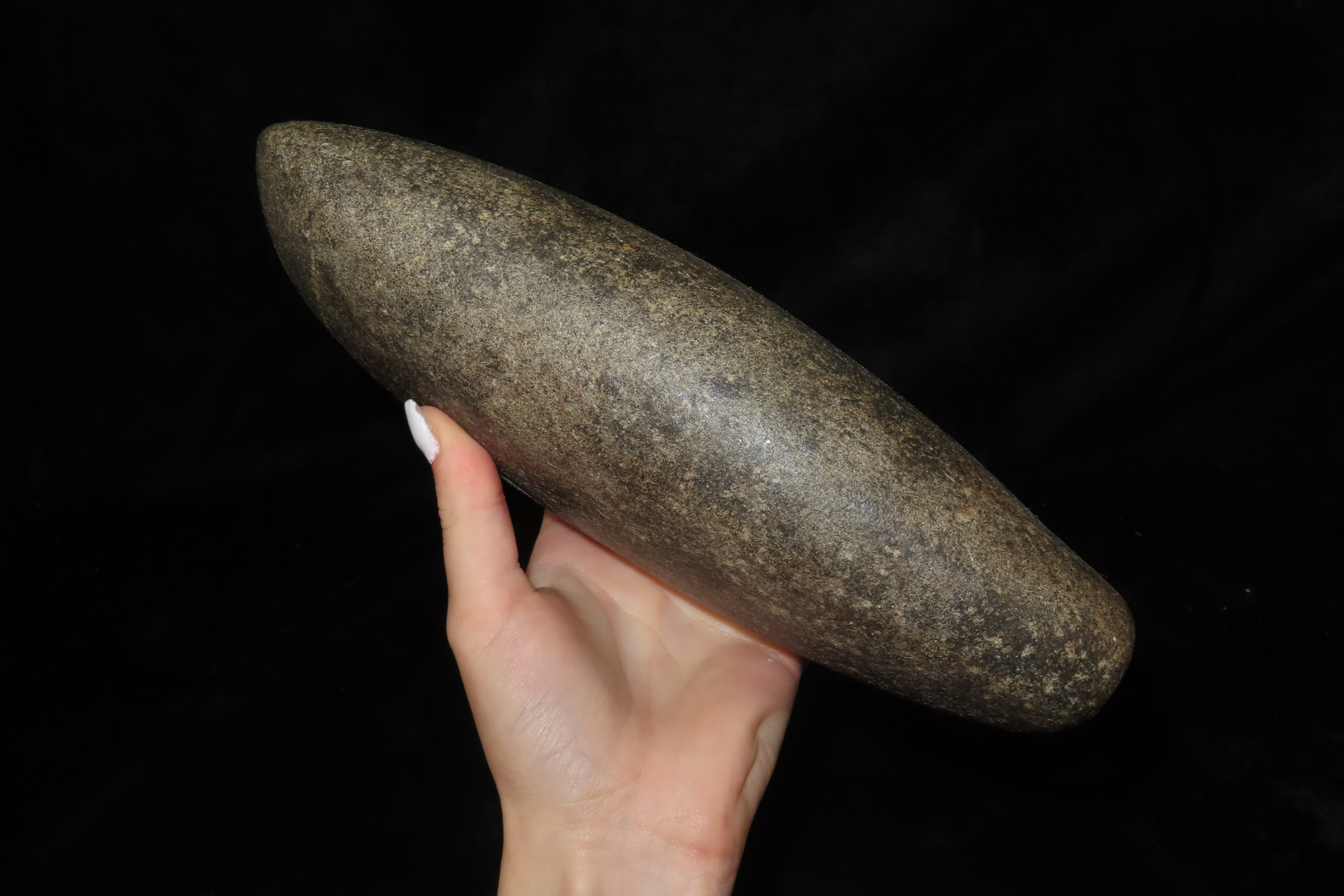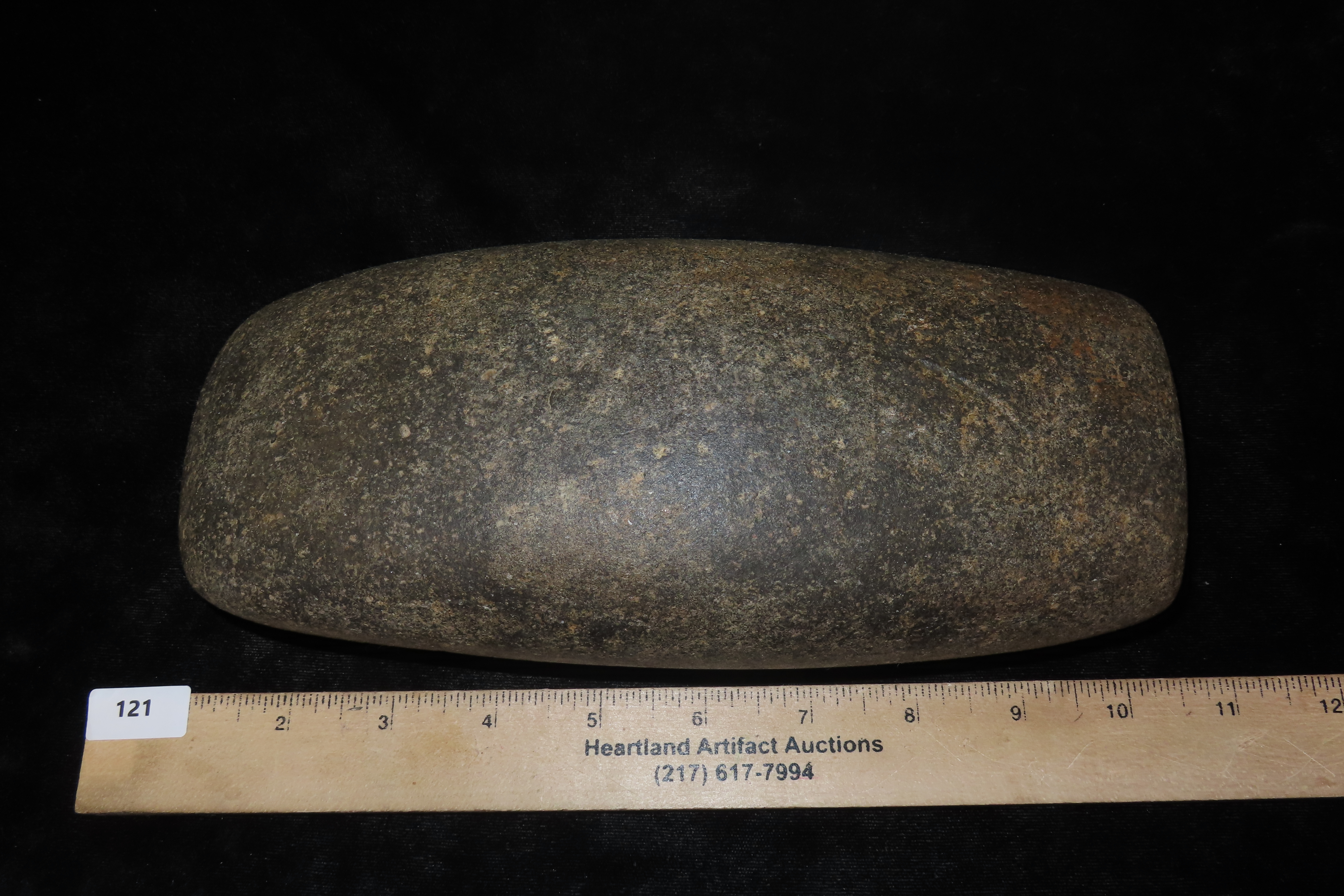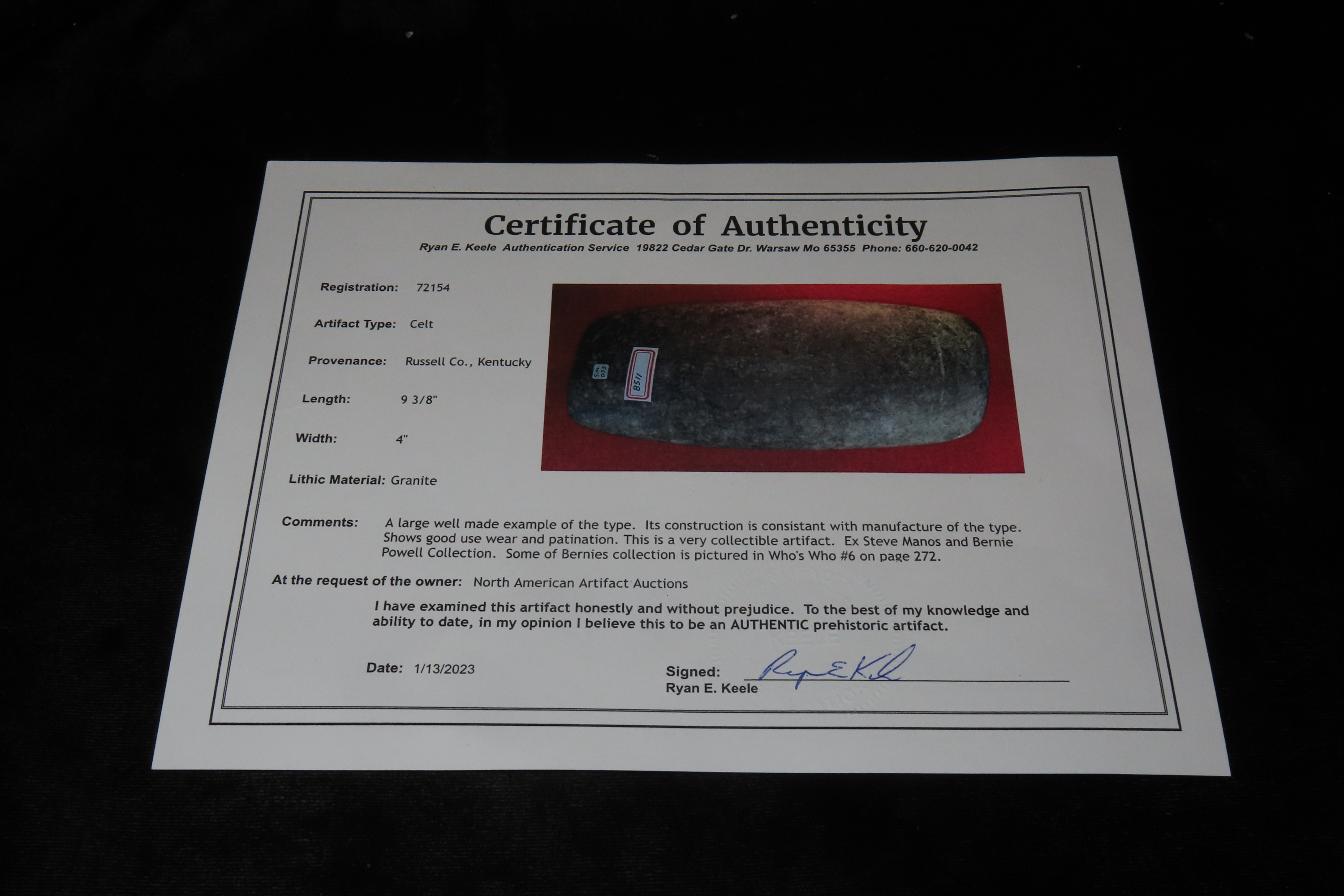 9 3/8″ X 4″ Celt, Keele COA, found in Russell Co., Kentucky, Ex Steve Manos, Ex Bernie Powell Collections -some of Bernie Powell’s collection is featured in Who’s Who in Indian Relics #6, pg 272.