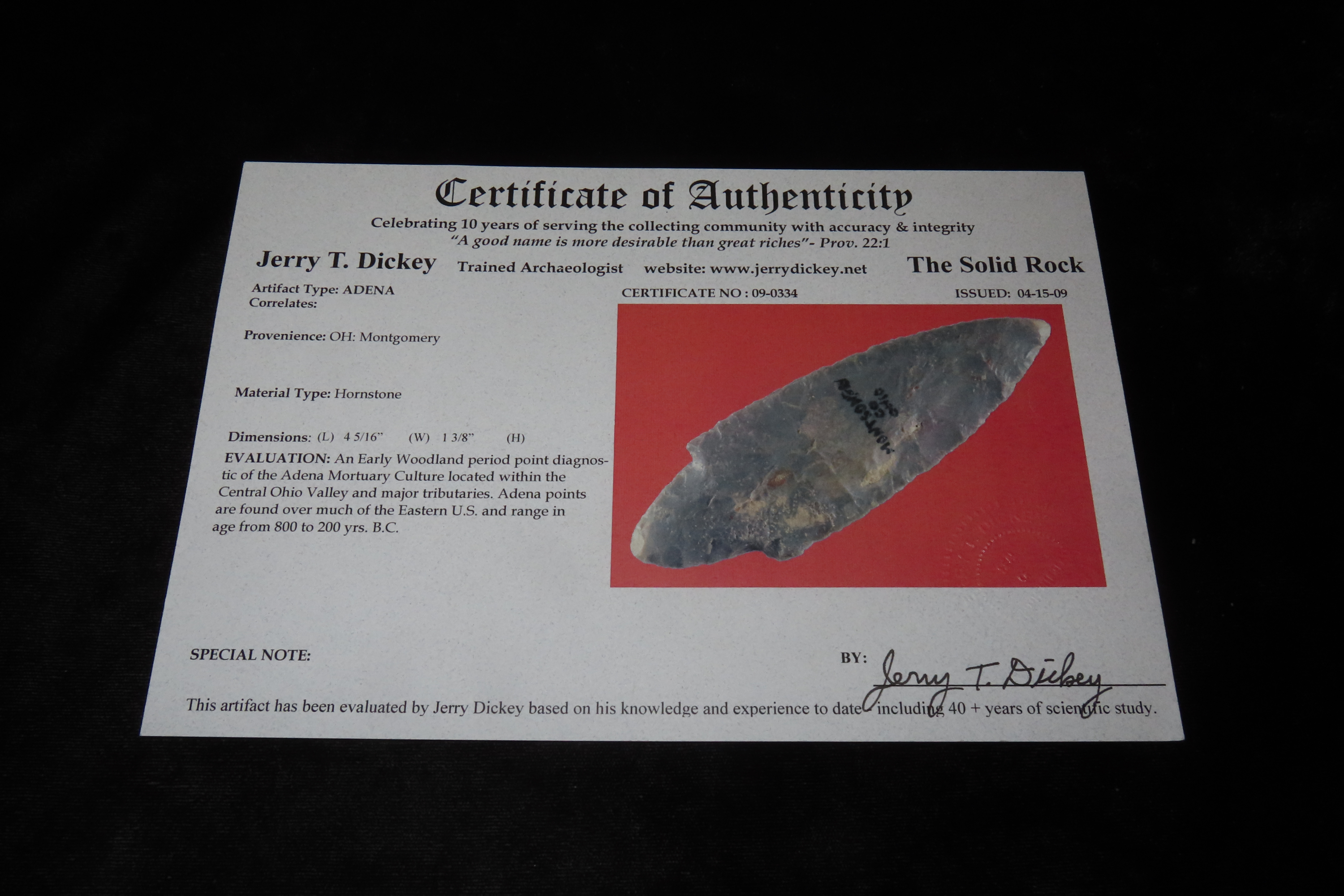 4 5/16″ X 1 3/8″ Adena, Dickey COA, found in Montgomery Co., Ohio, Ex James Hinson Collection