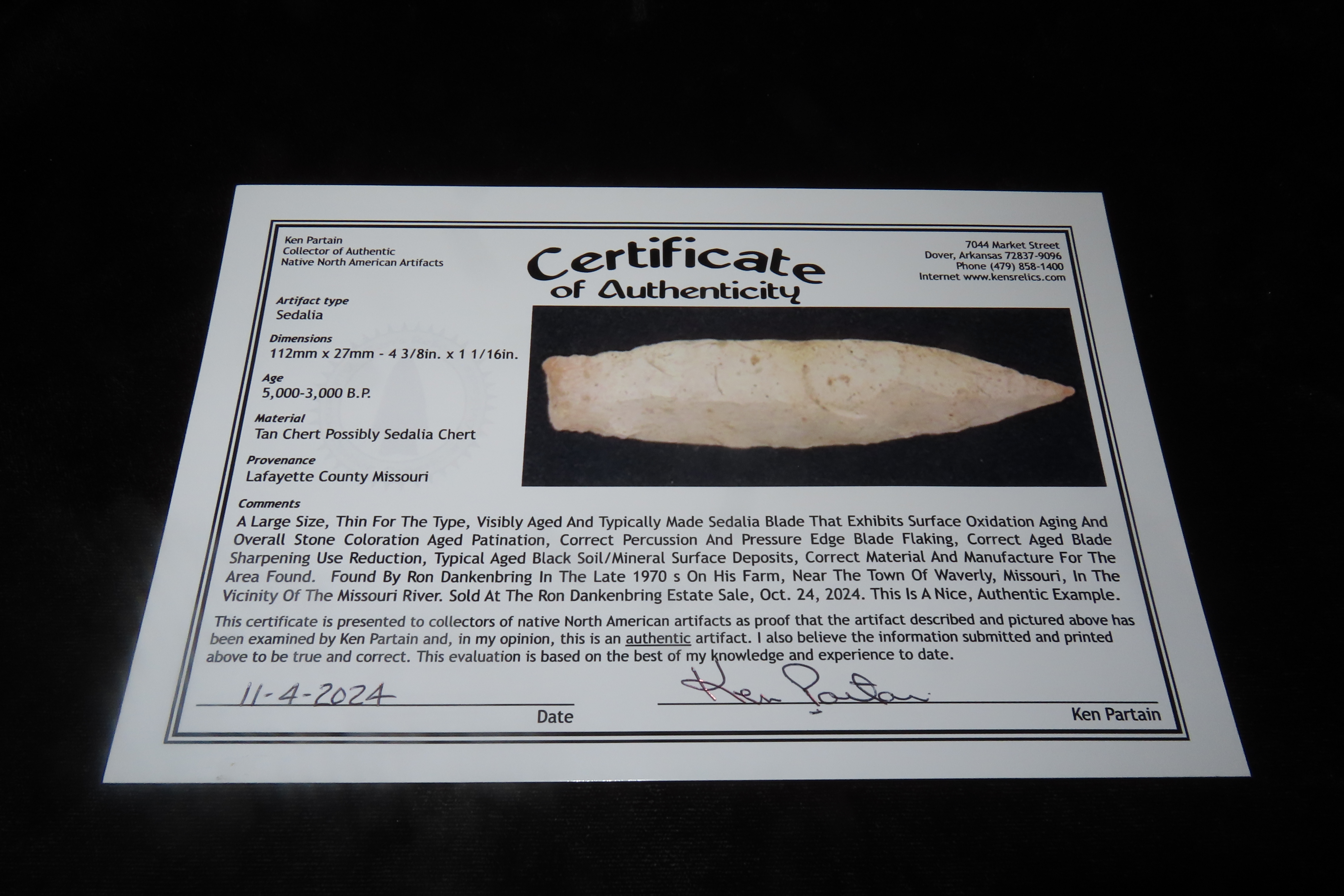 4 3/8″ X 1 1/16″ Sedalia, Partain COA, found in Lafayette Co., Missouri in the late 1970’s by Ron Dankenbring on his farm near Waverly Missouri, near the Missouri River, Ex James Hinson Collection