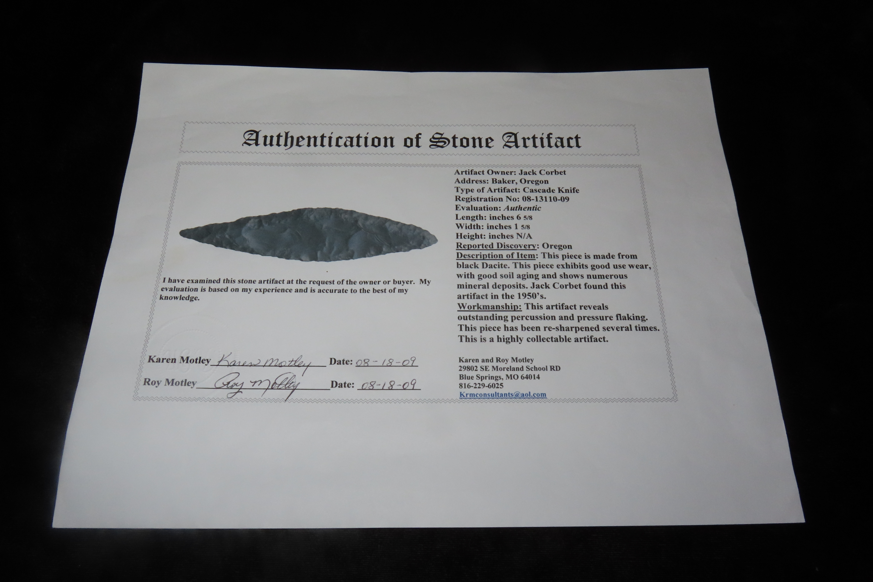 6 5/8″ X 1 5/8″ Cascade Knife, Motley COA, found in Oregon by Jack Corbet in the 1950’s., Ex James Hinson Collection