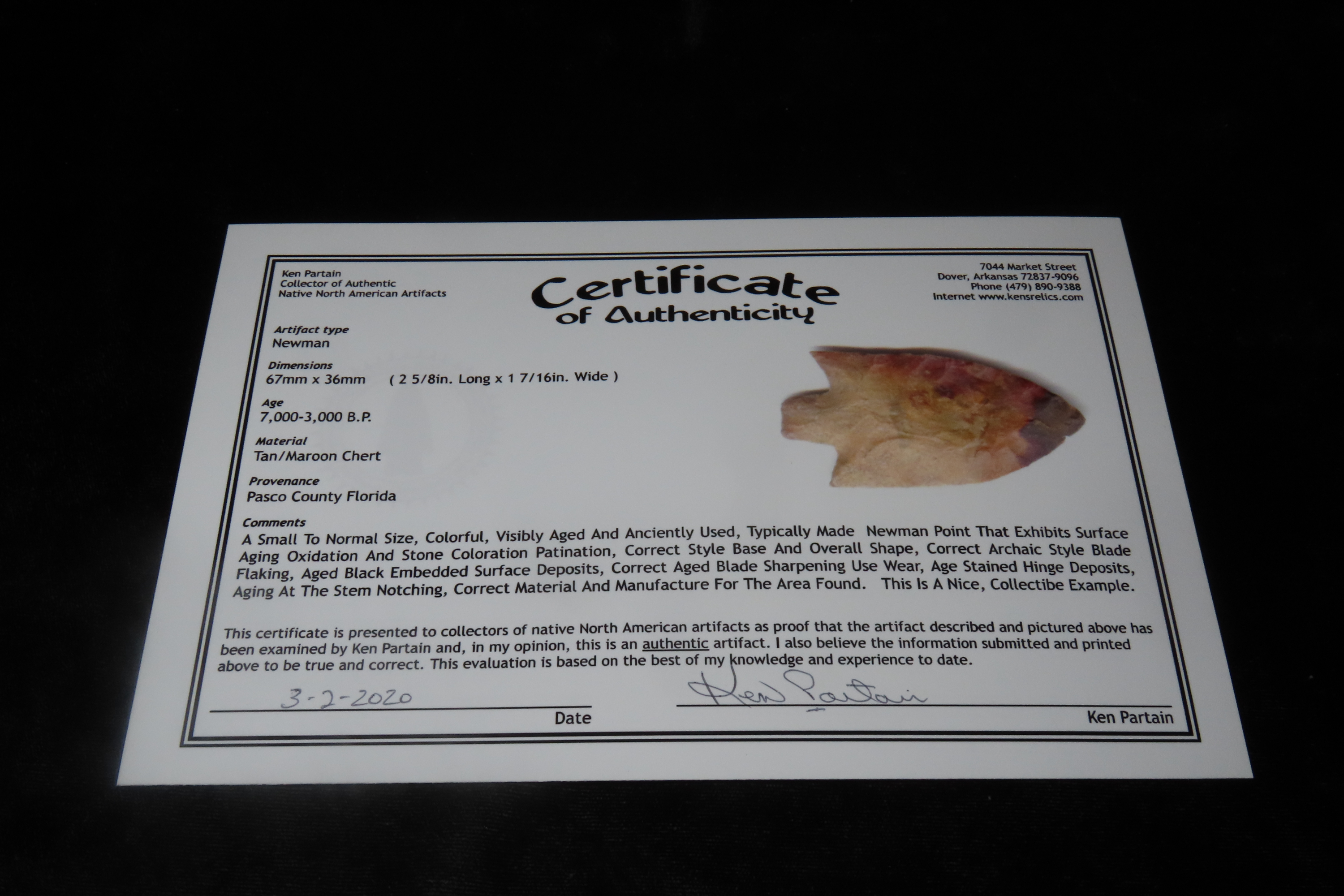 2 5/8″X 1 3/8″ Newman, Partain COA, found in Pasco Co., Florida, Ex James Hinson Collection