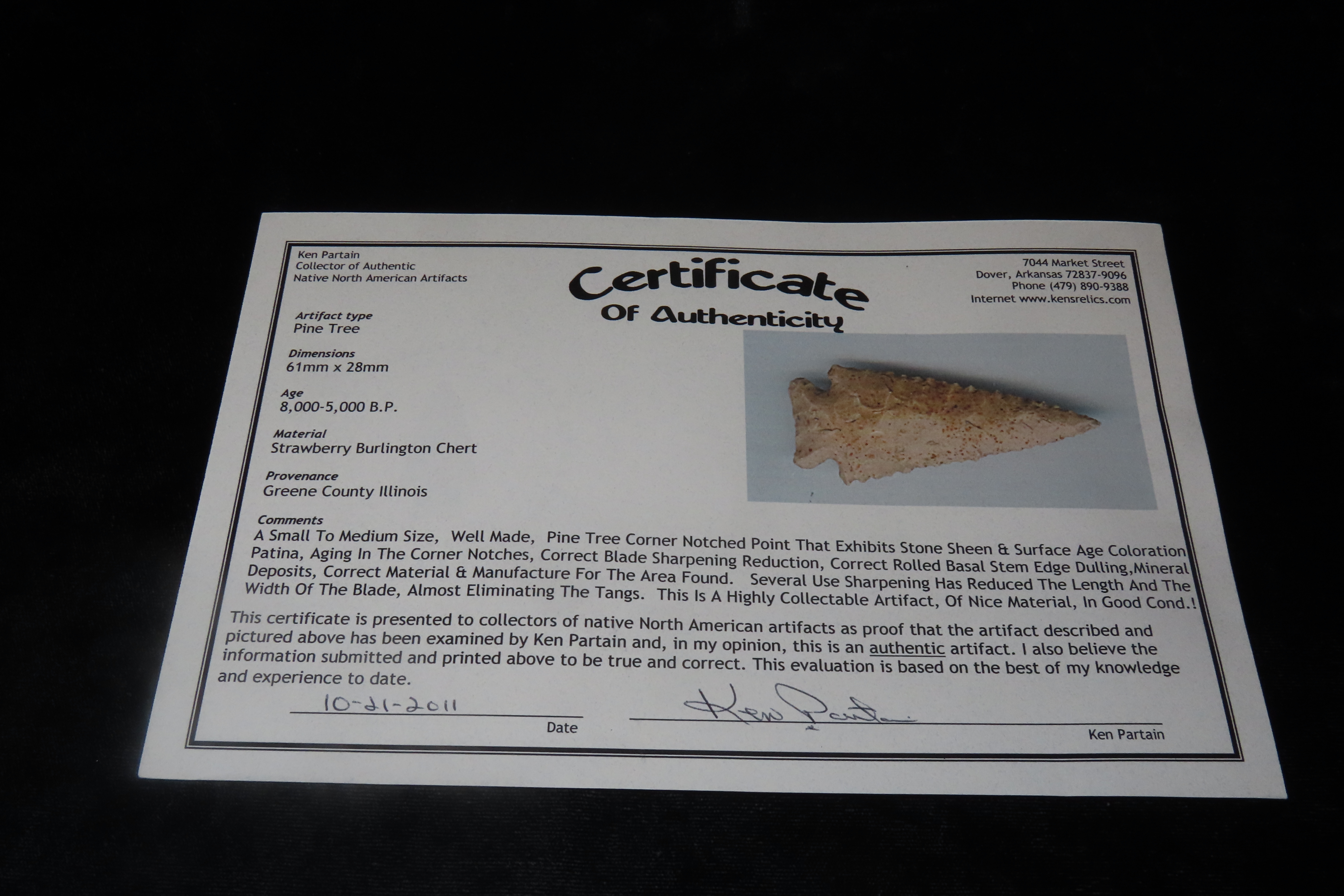 2 3/8″ X 1 1/8″ Pine Tree, Partain COA, found in Greene Co., Illinois, Ex James Hinson Collection