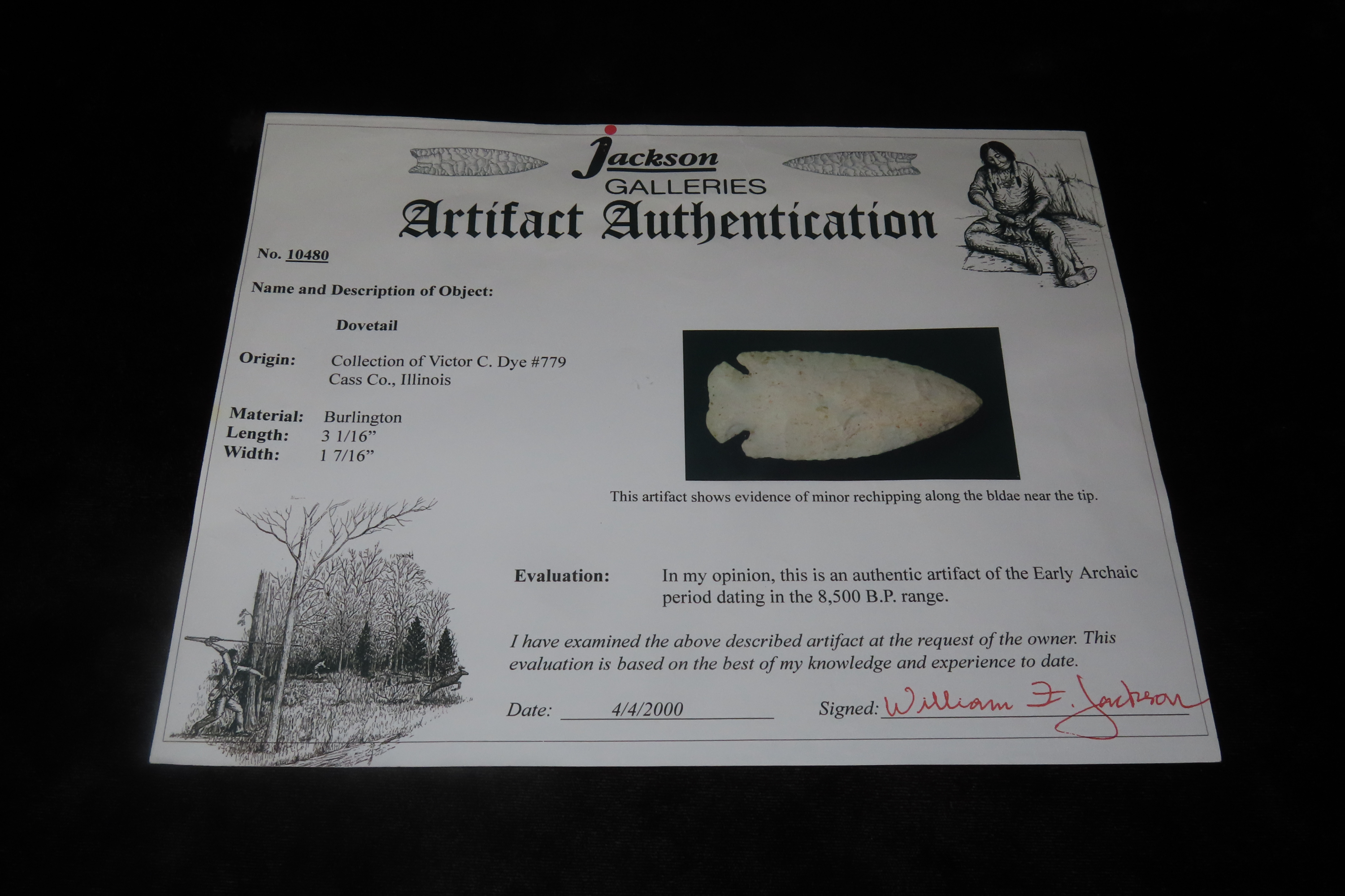 3 1/16″ X 1 7/16″ Dovetail, Jackson COA, Found in Cass Co. Illinois, Collection of Victor C. Dye, Number 779, Ex James Hinson Collection