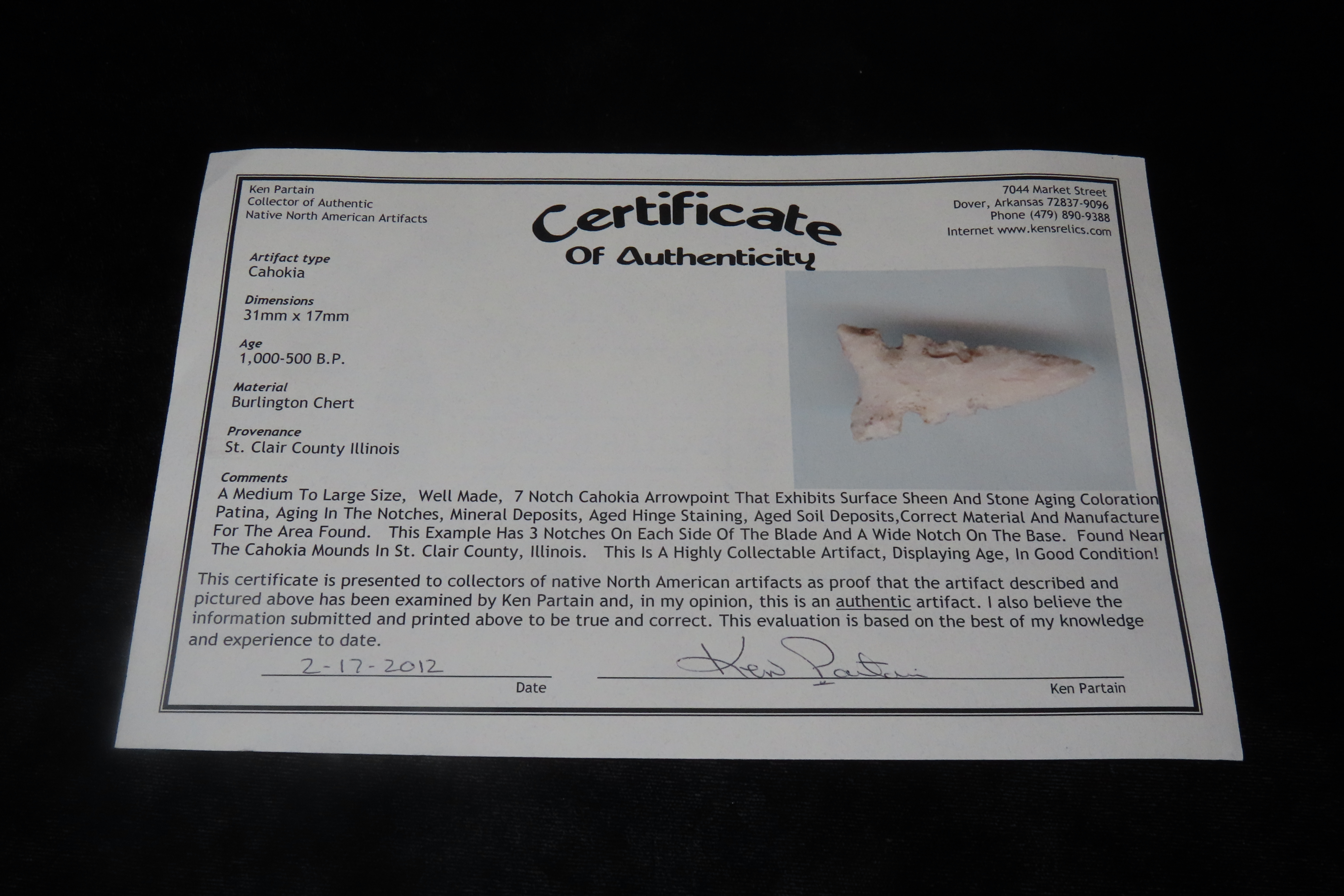 1 3/16″ X 5/8″ Cahokia, Partain COA, Made of Burlington Chert, Found in St. Clair Co. Illinois, Ex James Hinson Collection