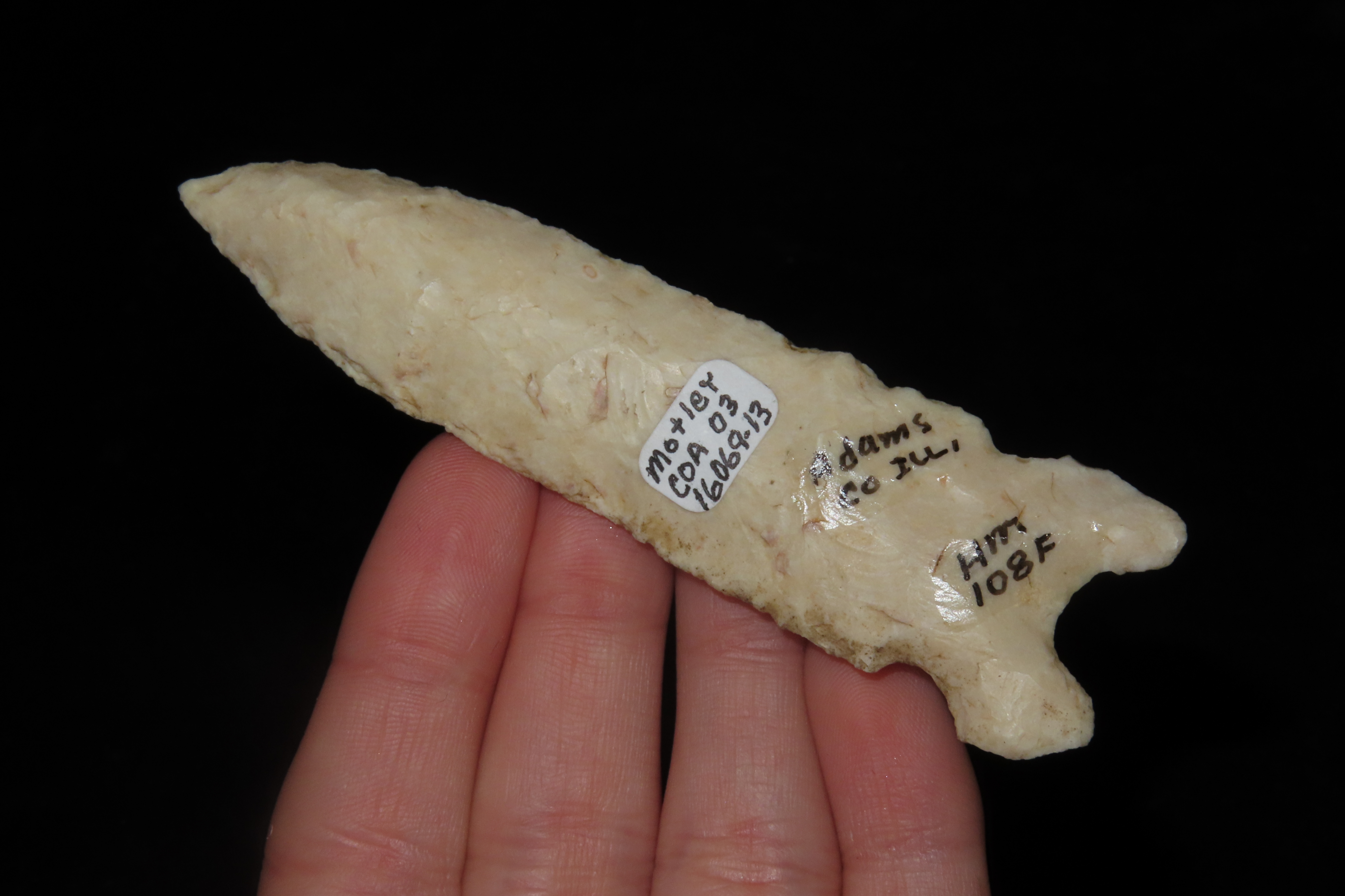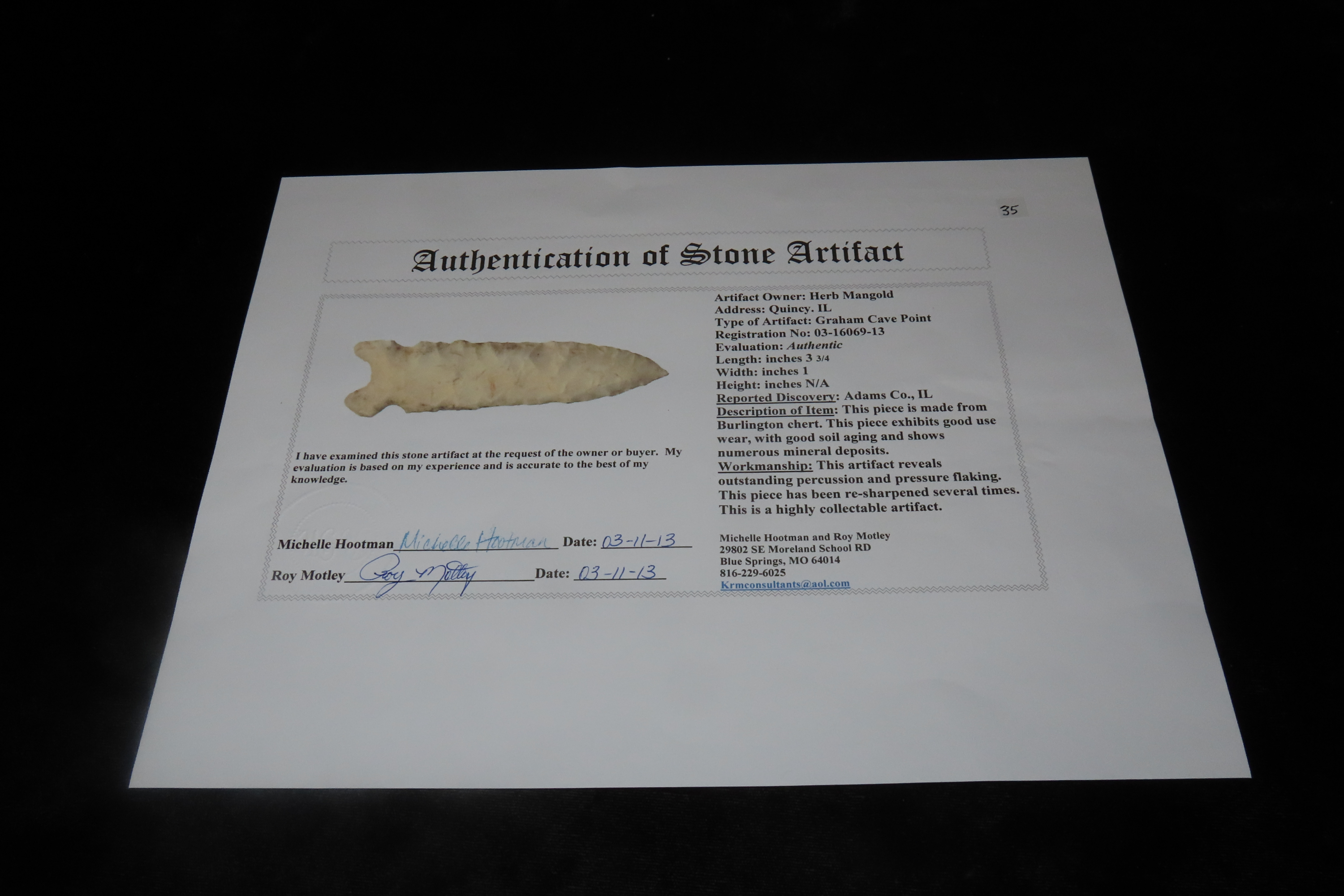 3 3/4″ x 1″ Graham Cave Point, Motley COA, Found in Adams Co. Illinois, Ex Herb Mangold Collection