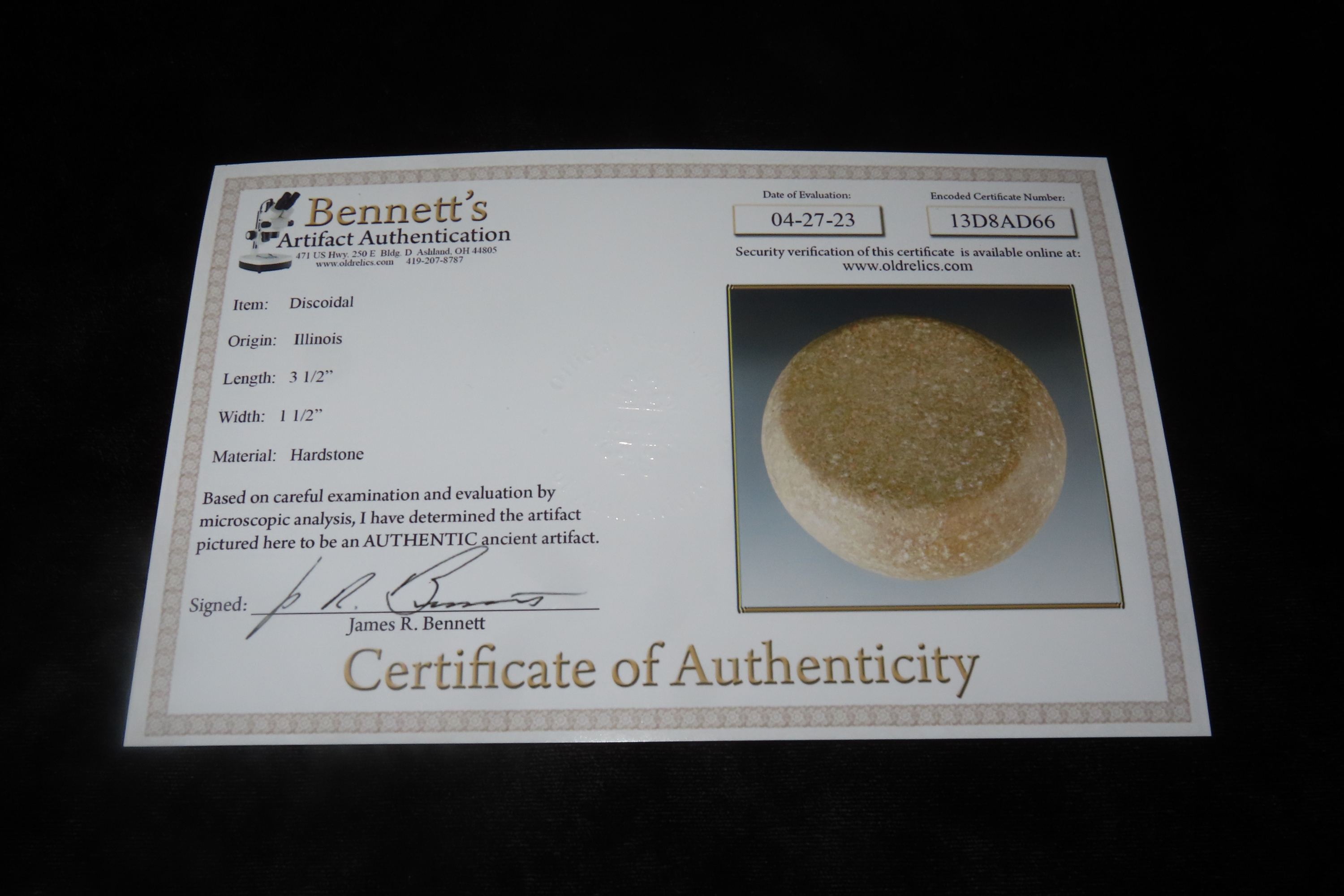 3 1/2″ x 1 1/2″ Discoidal, Bennett COA, found in Illinois, Ex James Hinson Collection