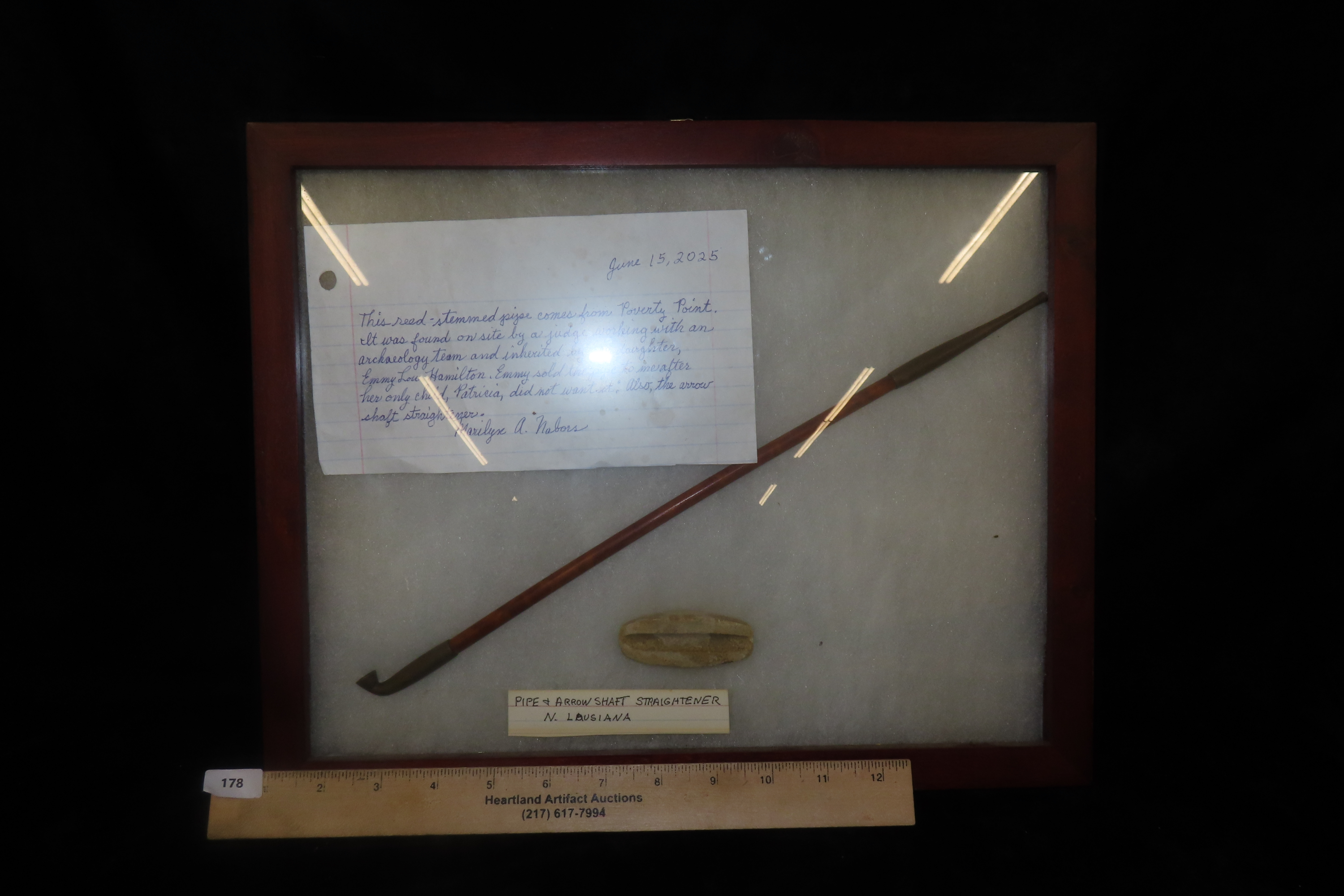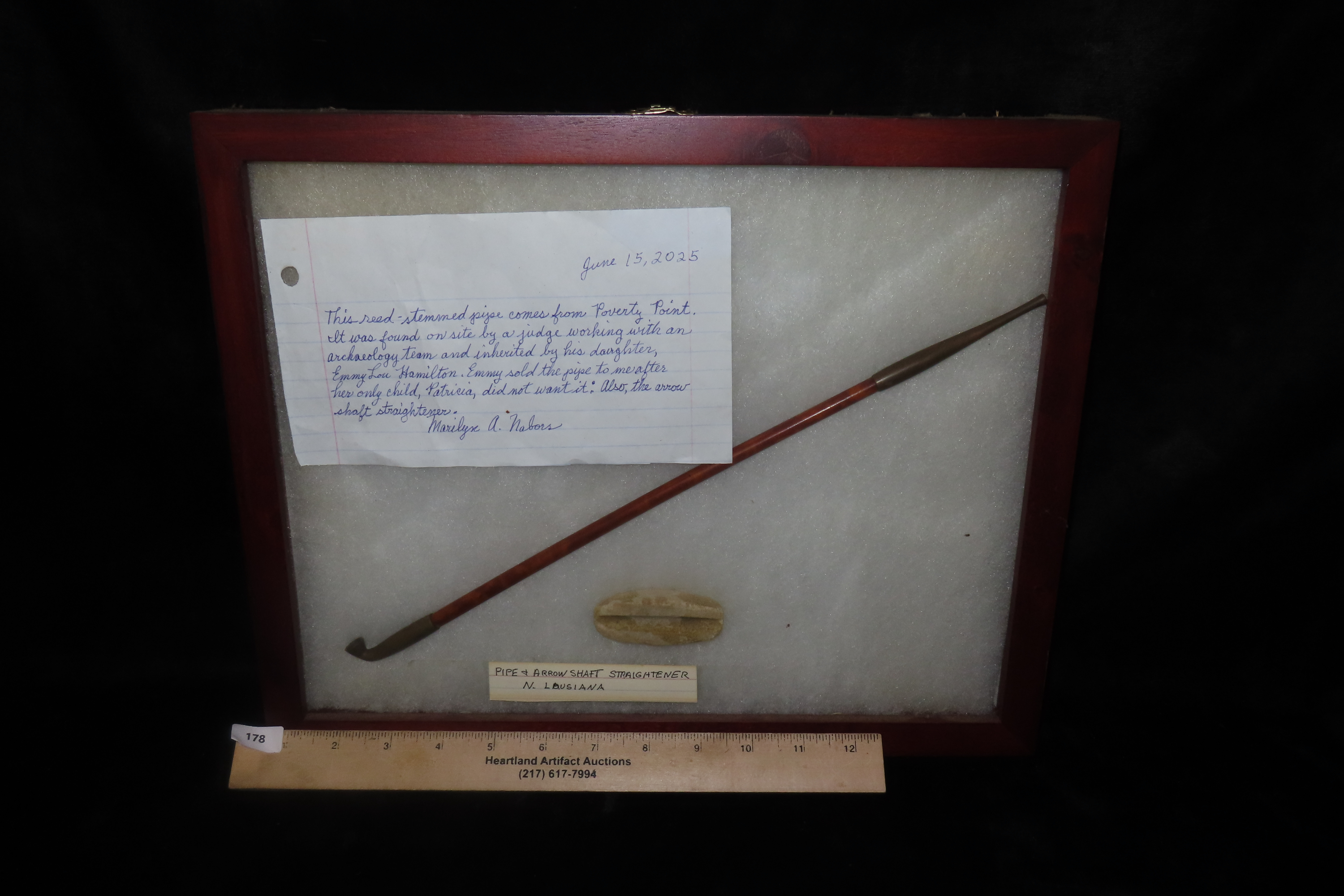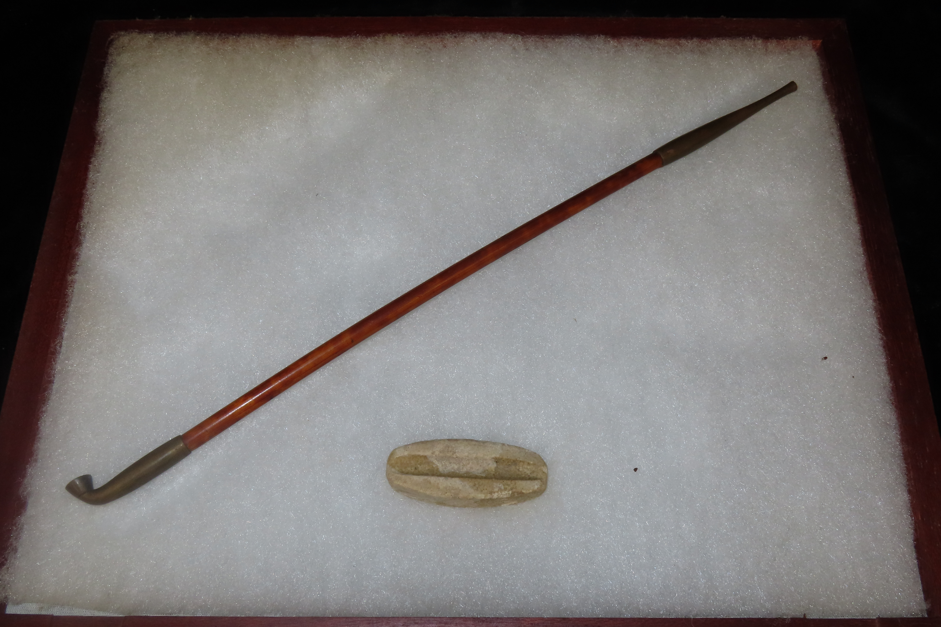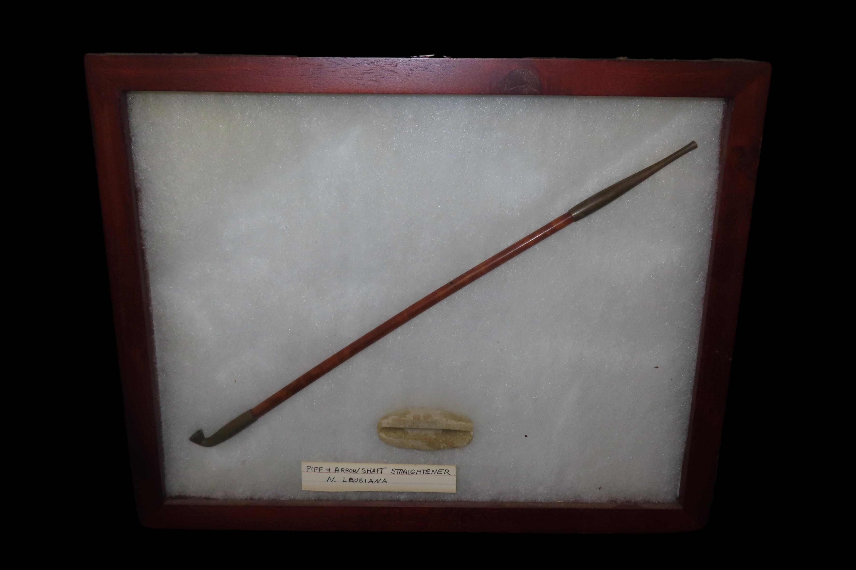 14 3/4″ x 1/4″ Reed-Stemmed Pipe and 2 1/2″ x 3/4″ Arrow Shaft Straightener, Both of these items come from Northern Louisiana. They were found by a judge working with an archeological team and inherited by his daughter, Emmy Lou Hamilton. Emmy later sold the pipe.