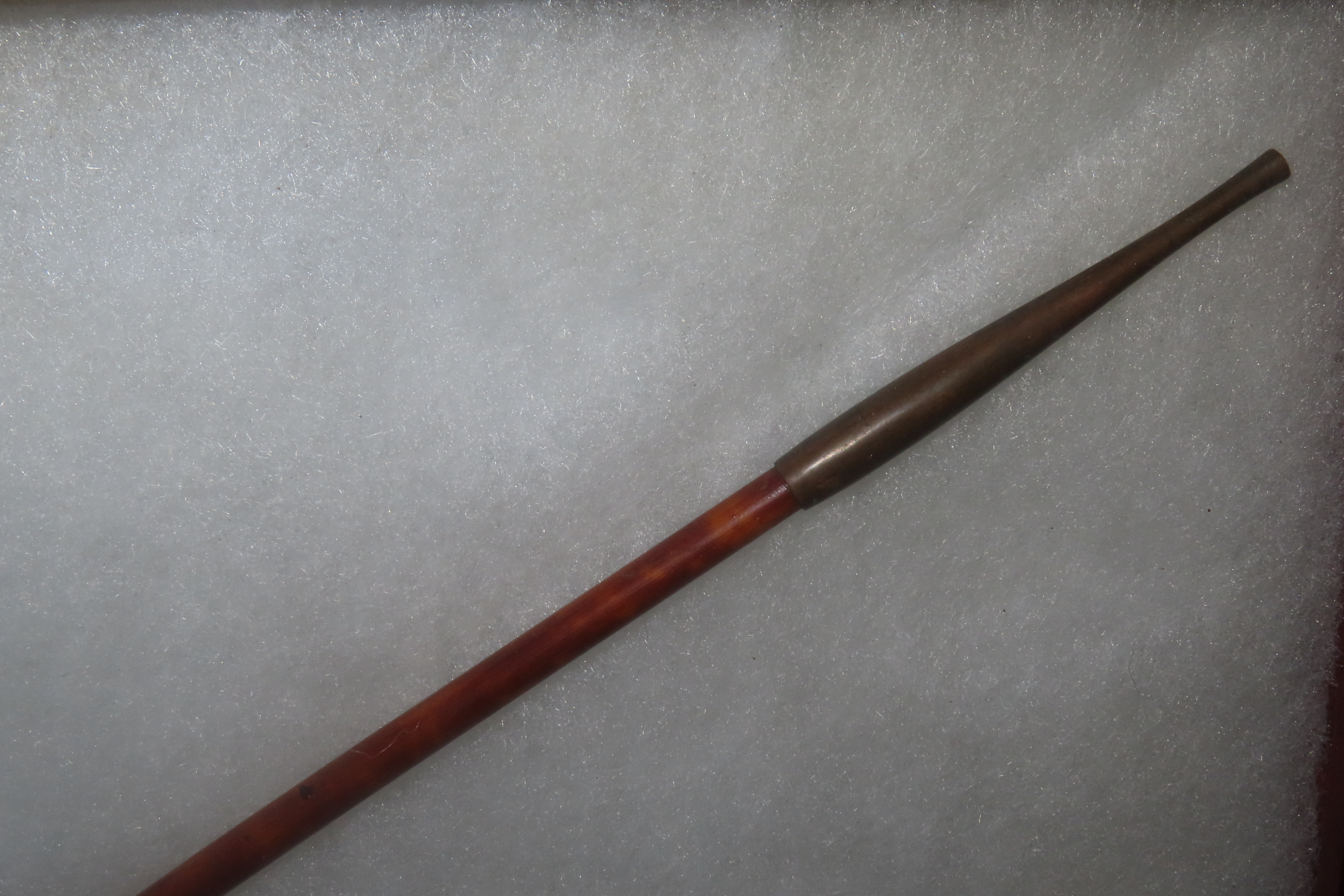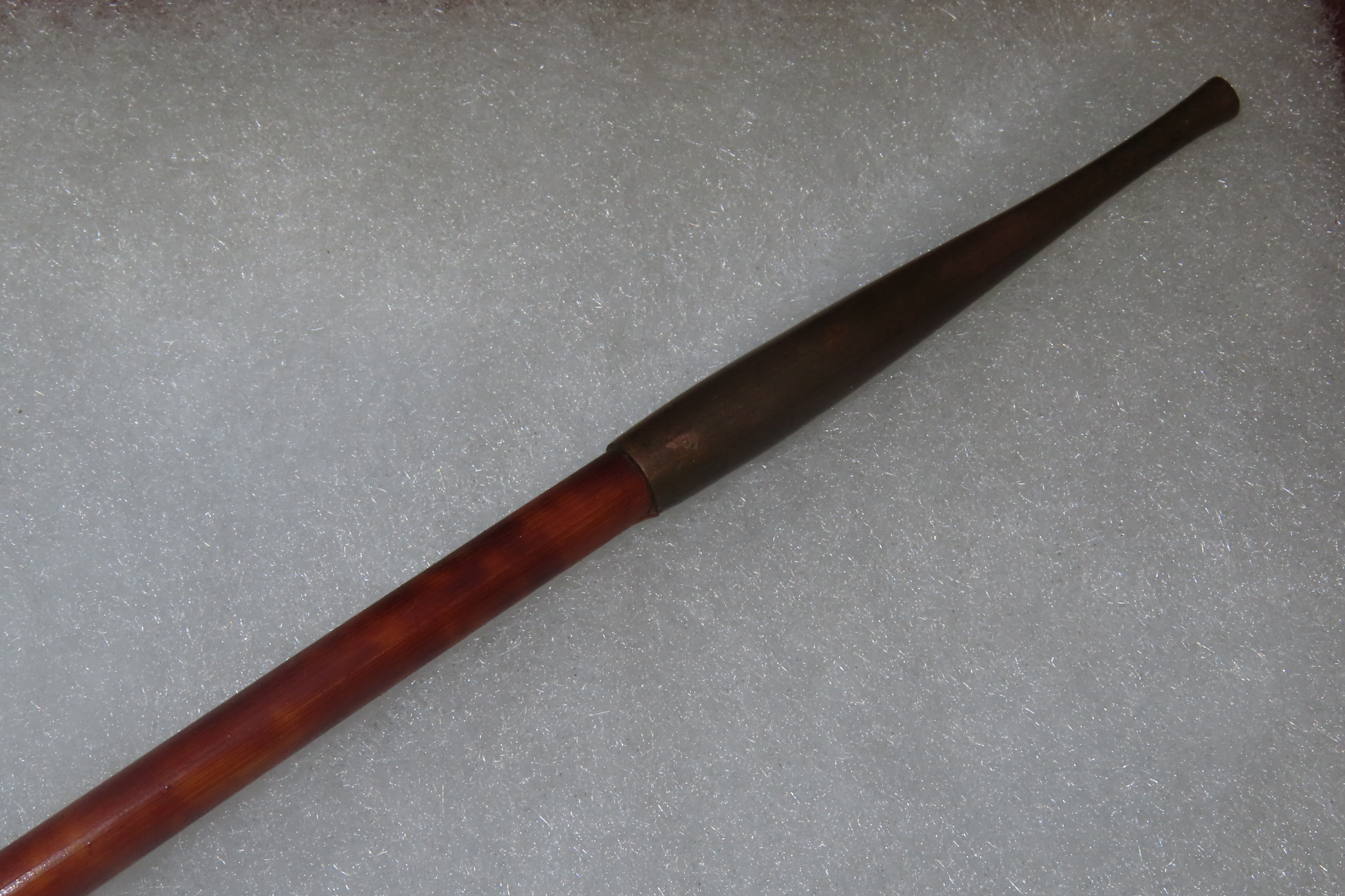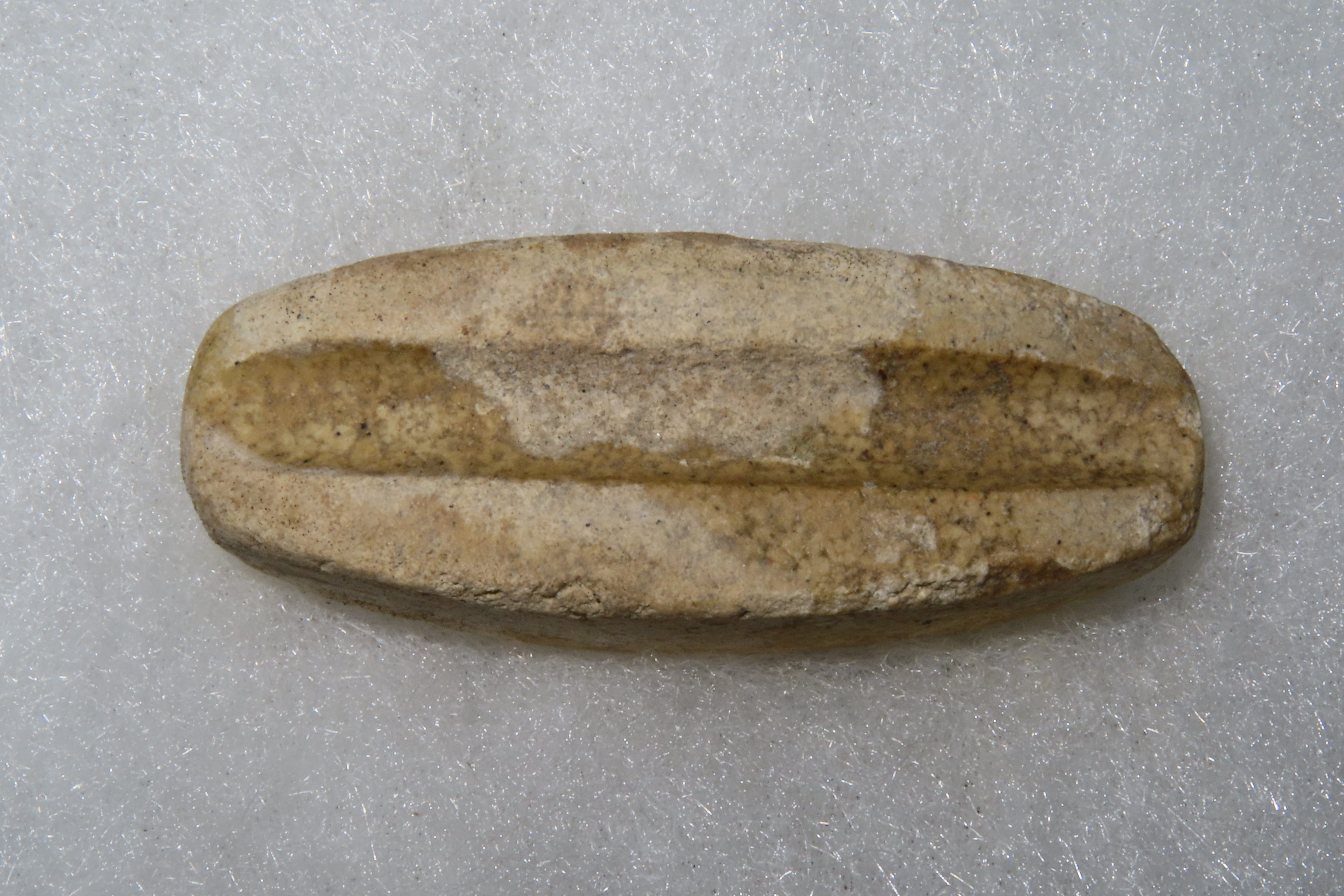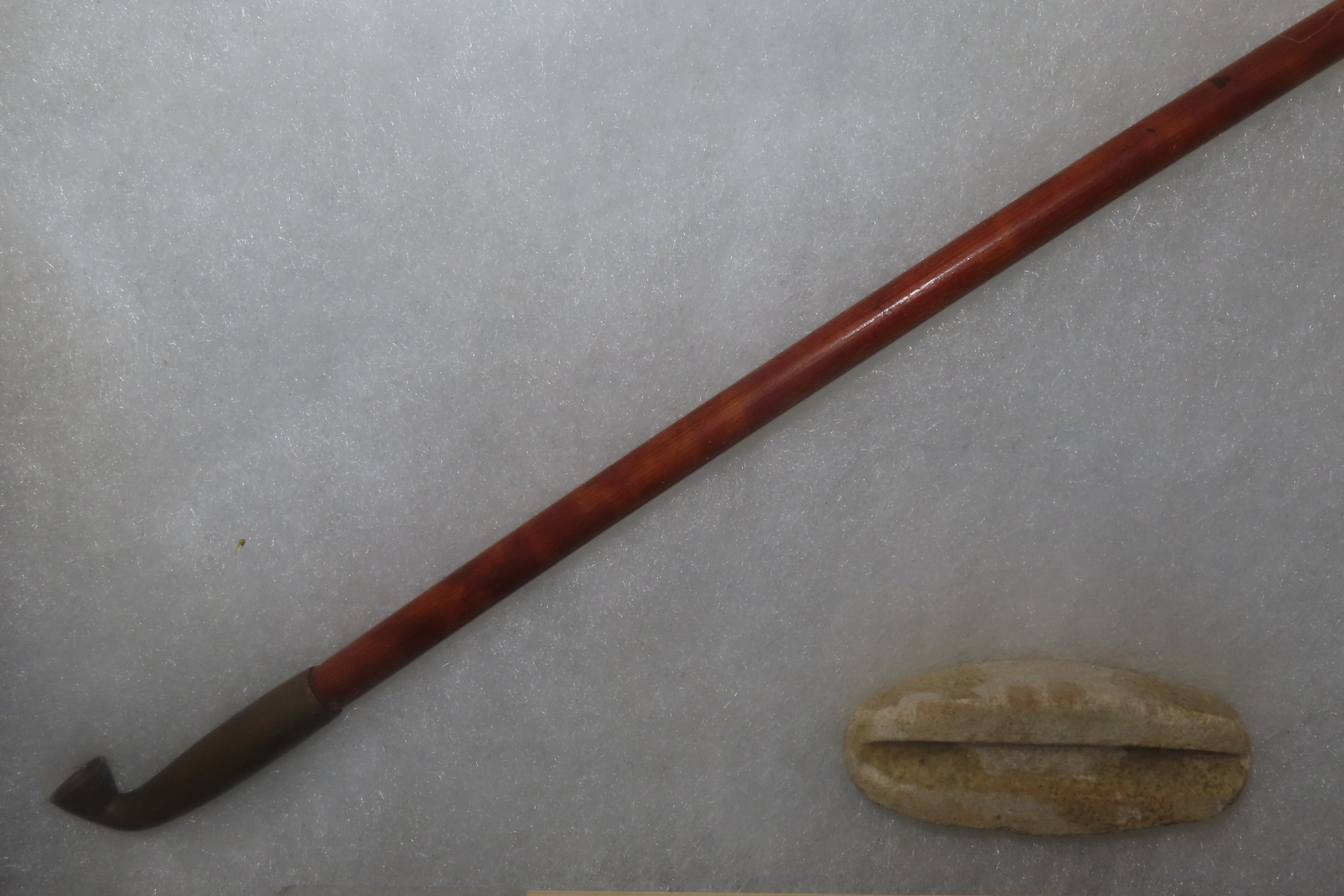 14 3/4″ x 1/4″ Reed-Stemmed Pipe and 2 1/2″ x 3/4″ Arrow Shaft Straightener, Both of these items come from Northern Louisiana. They were found by a judge working with an archeological team and inherited by his daughter, Emmy Lou Hamilton. Emmy later sold the pipe.