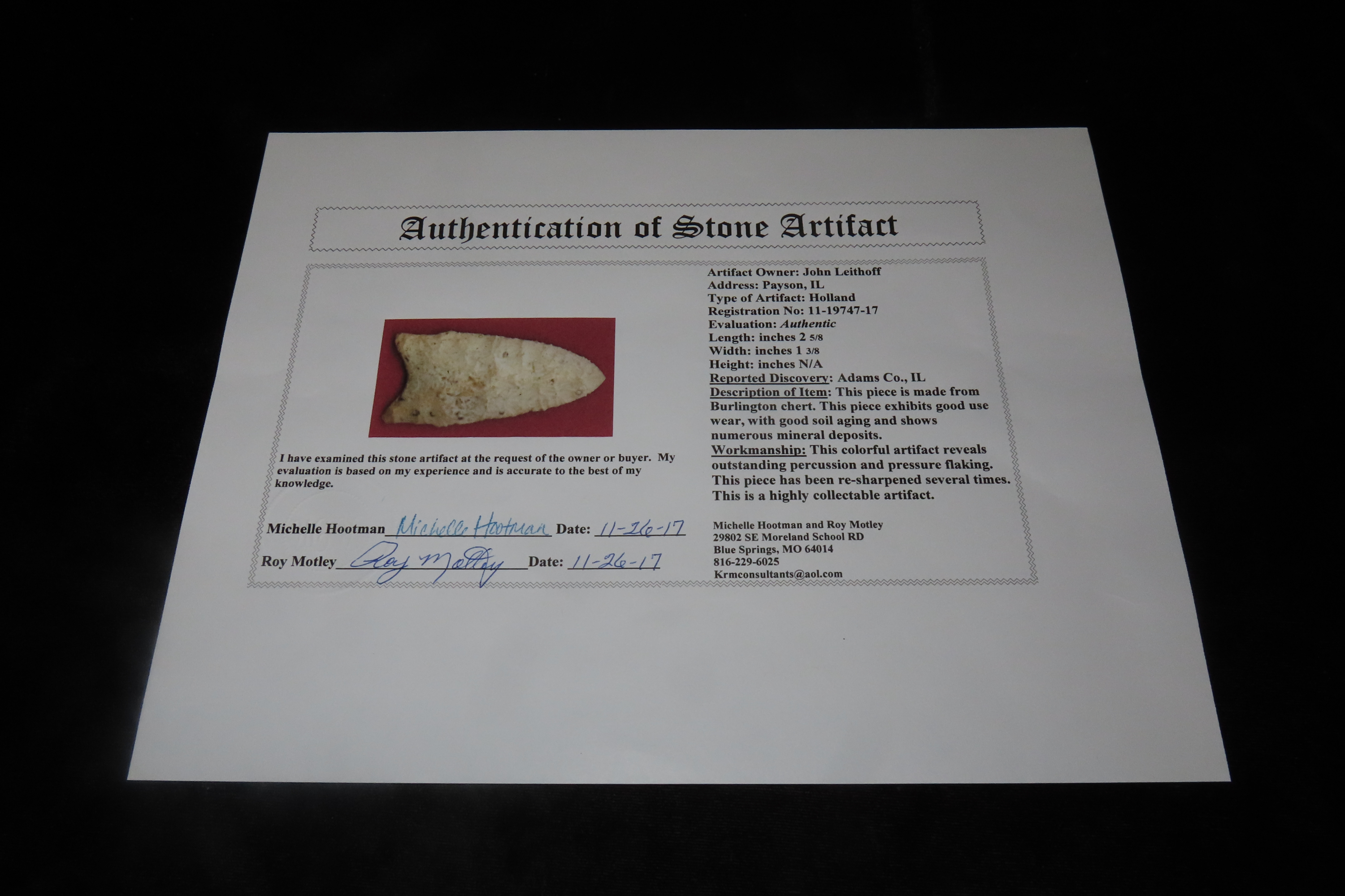 2 5/8″ x 1 3/8″ Holland, Motley COA, found in Adams Co., Illinois
