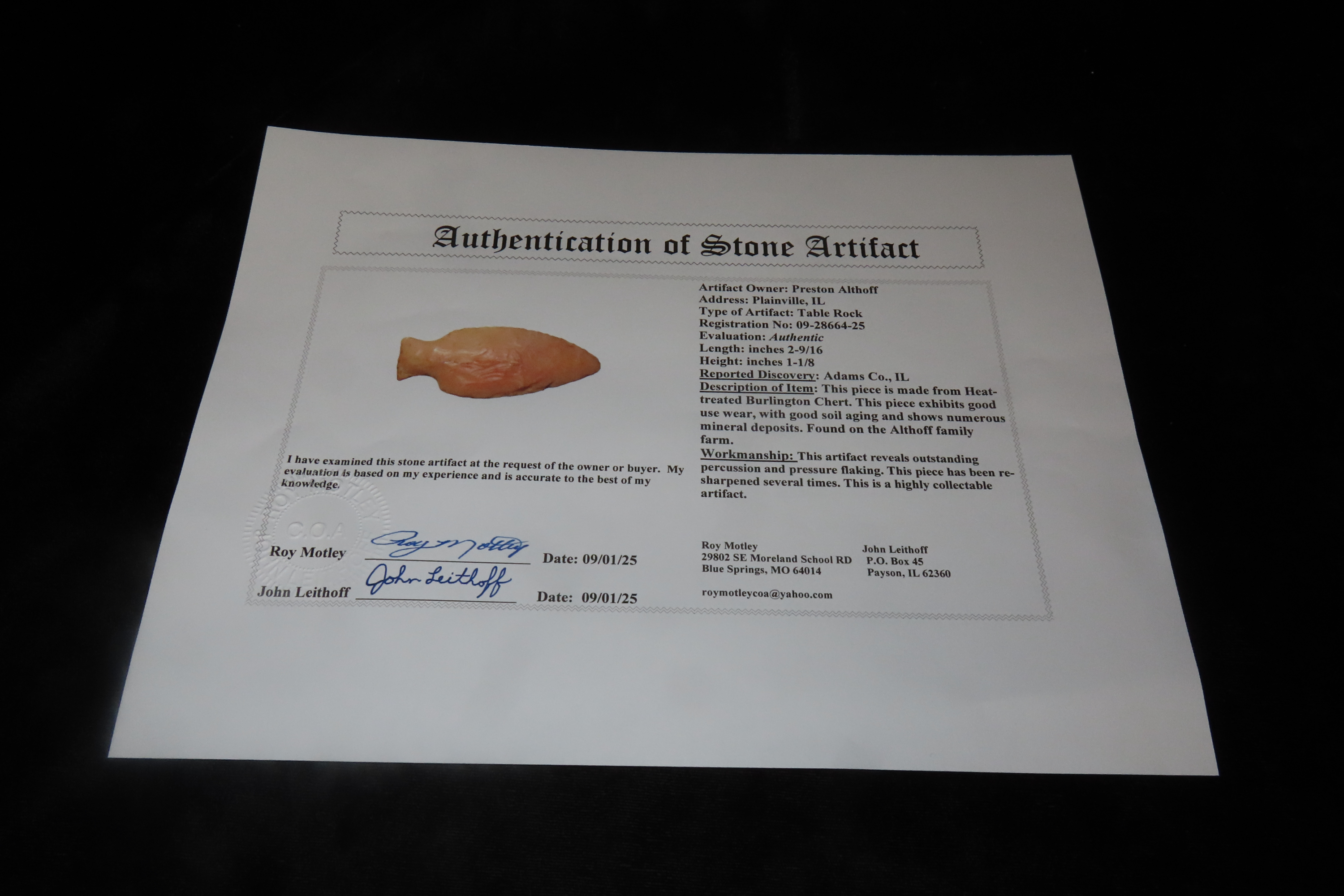 2 9/16″ x 1 1/8″ Table Rock, Motley COA, Great Color, found in Adams Co., Illinois, Ex Preston Althoff Collection