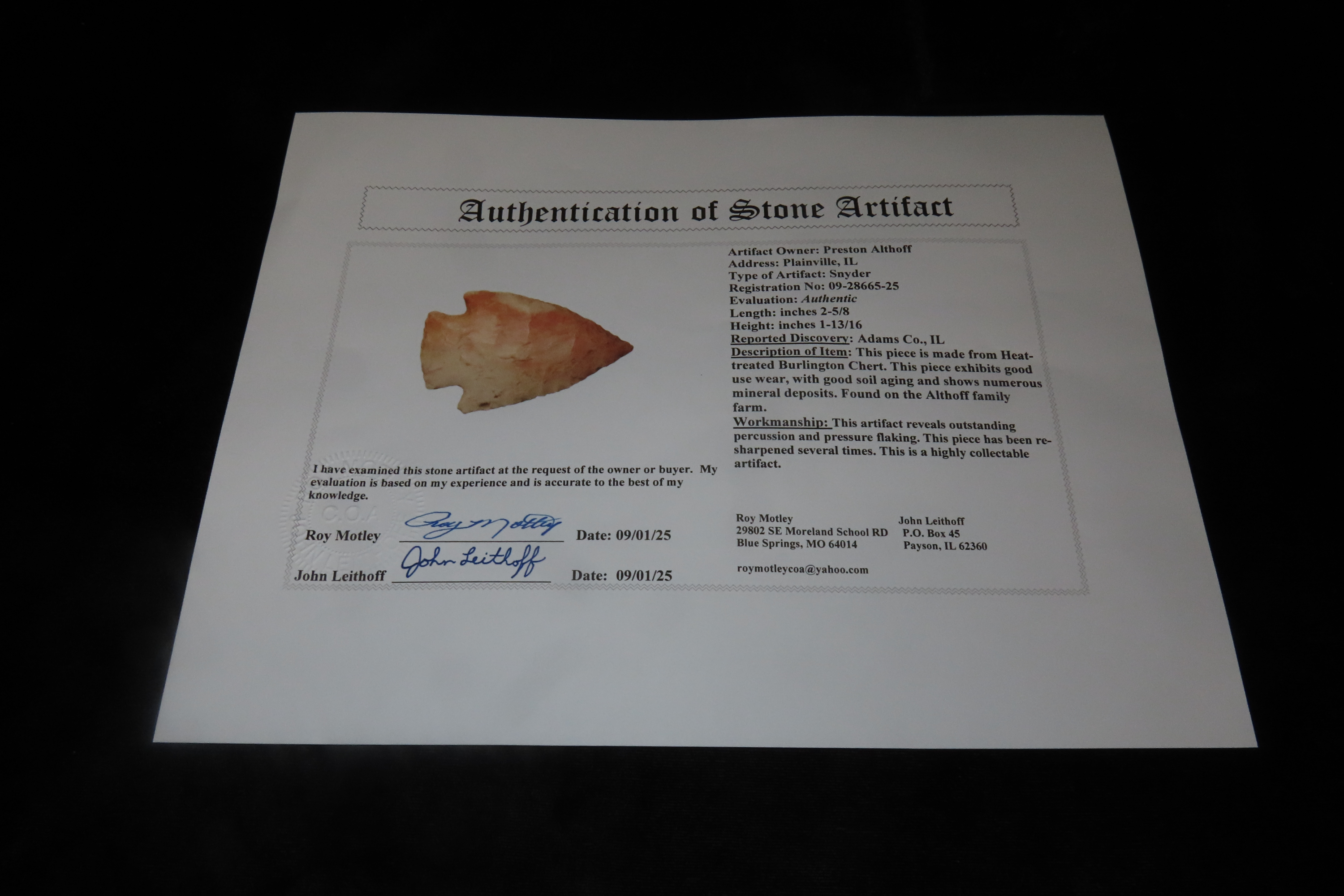 2 5/8″ x 1 13/16″ Synder, Motley COA, Adams Co. IL, Found on the Althoff Family Farm