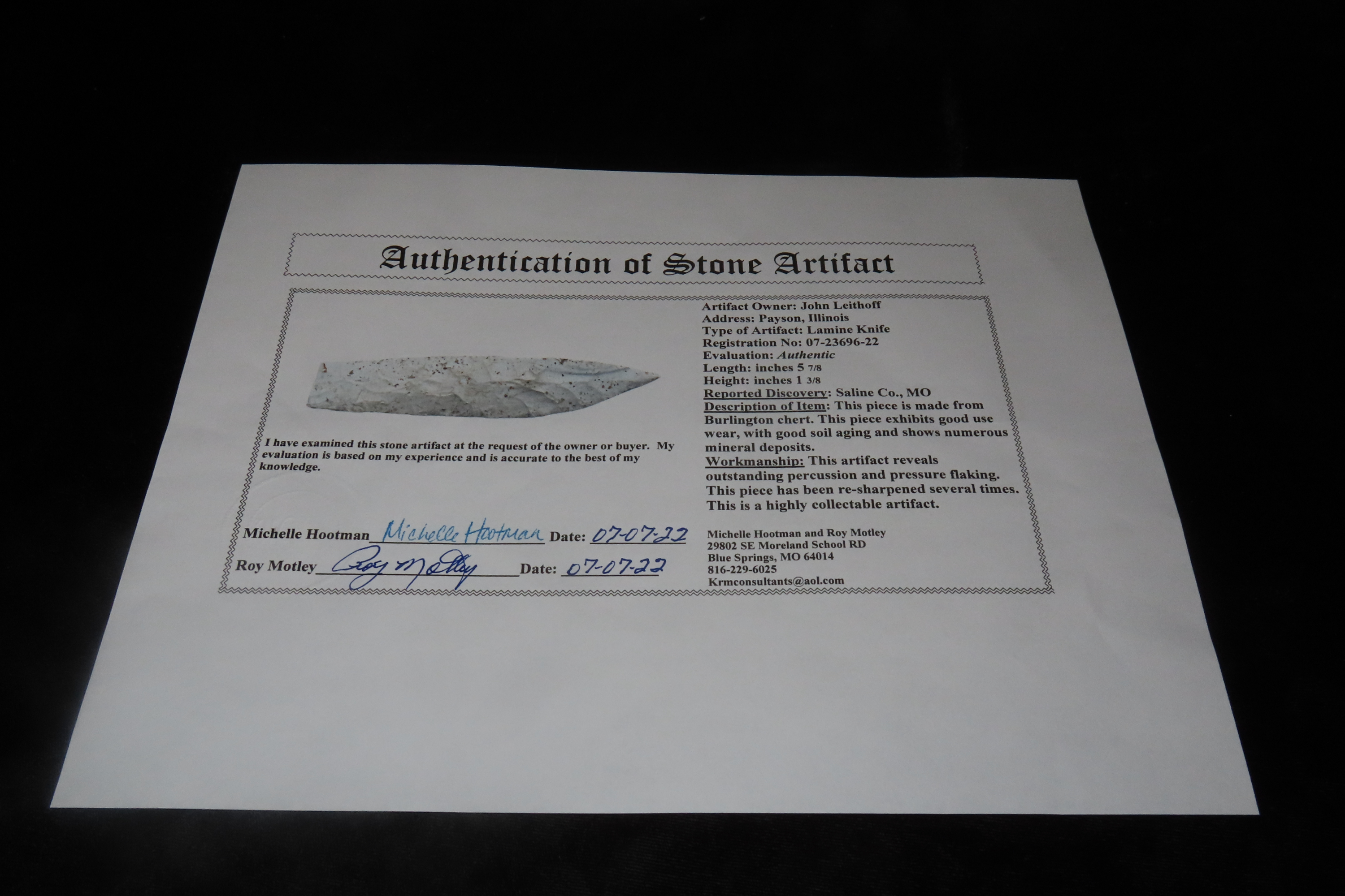 5 7/8″ x 1 3/8″ Lamine Knife, Motley COA, Saline Co. Missouri