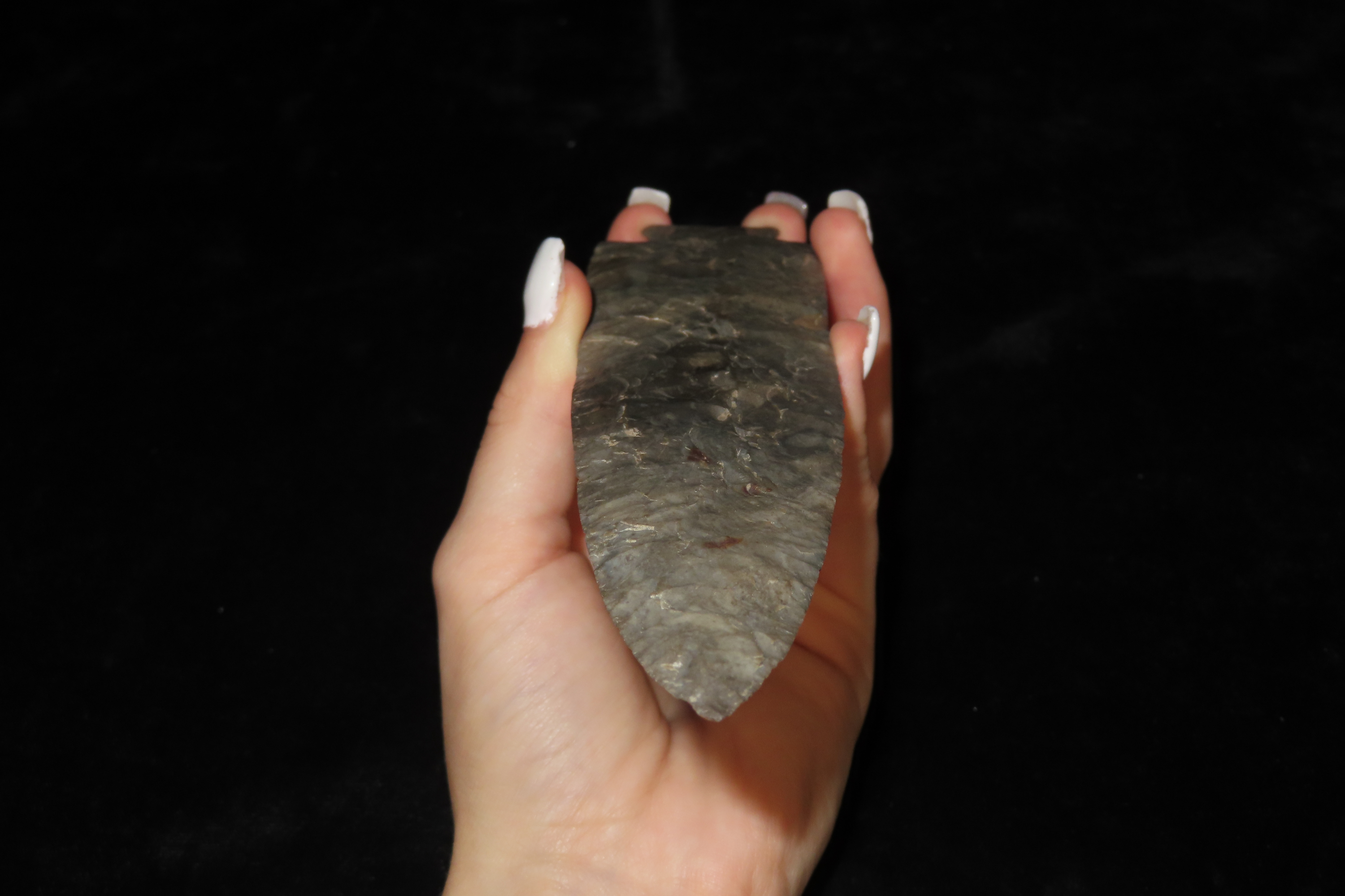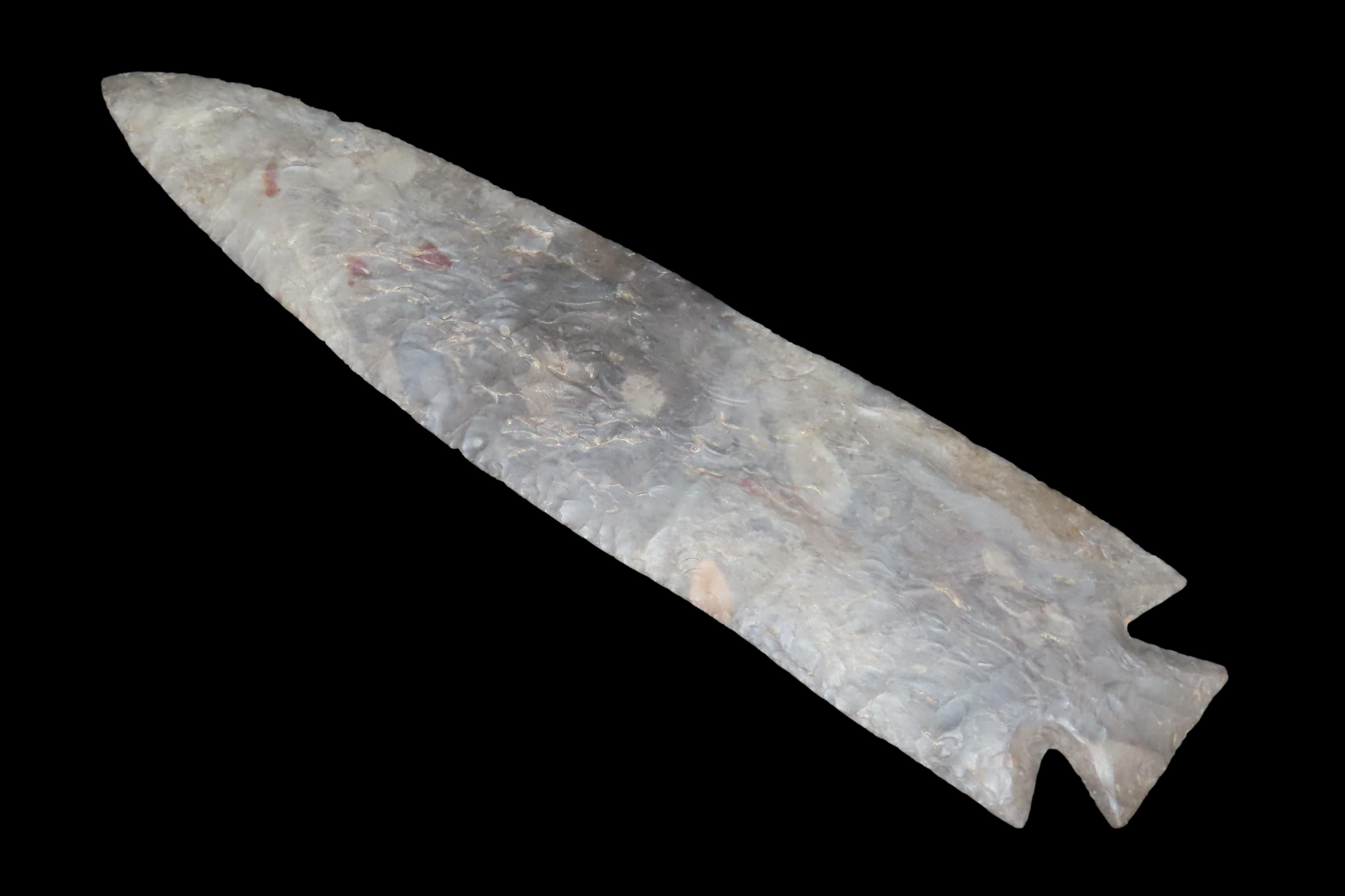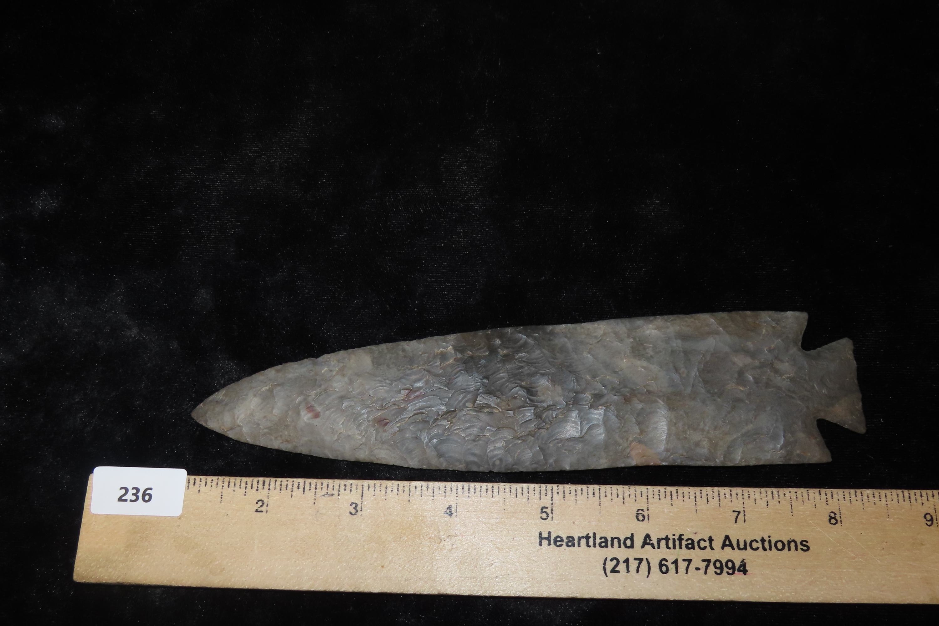 7 3/8″ Grey Ghost, Outstanding Collectors Item, Excellent Center Piece for a frame/collection. “Gray ghosts” are large modern-made “flint spears” that were made during the 40’s, 50’s, 60’s and early 70’s. These famous “flint spears” were made by Bryan Reinhardt beginning sometime in the 1940’s and continuing well into the 1970’s. Ex Jerry Maloney Collection, Eaton, Ohio. Jerry had a shop in Webb’s Antique Mall in Centerville, Indiana for 20 years and continued collecting and selling for another 15 years.