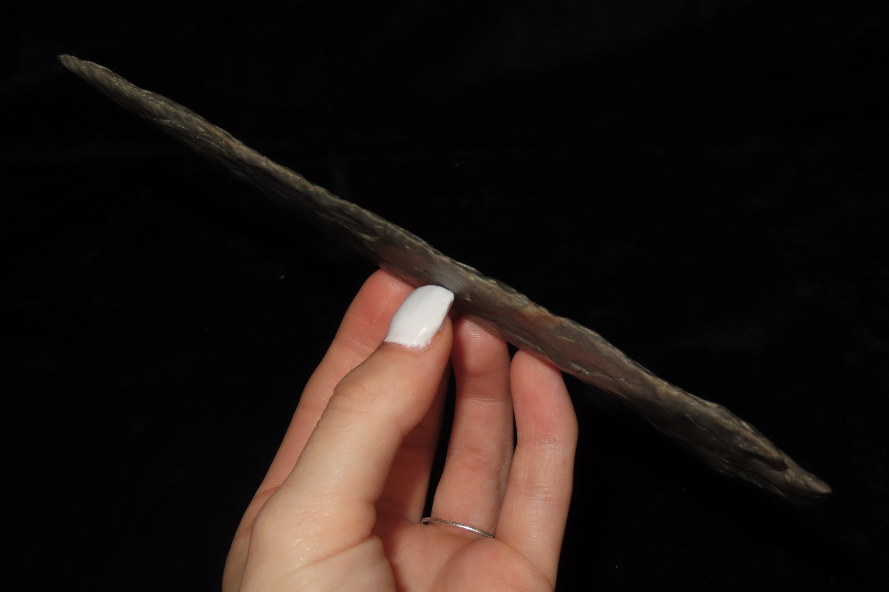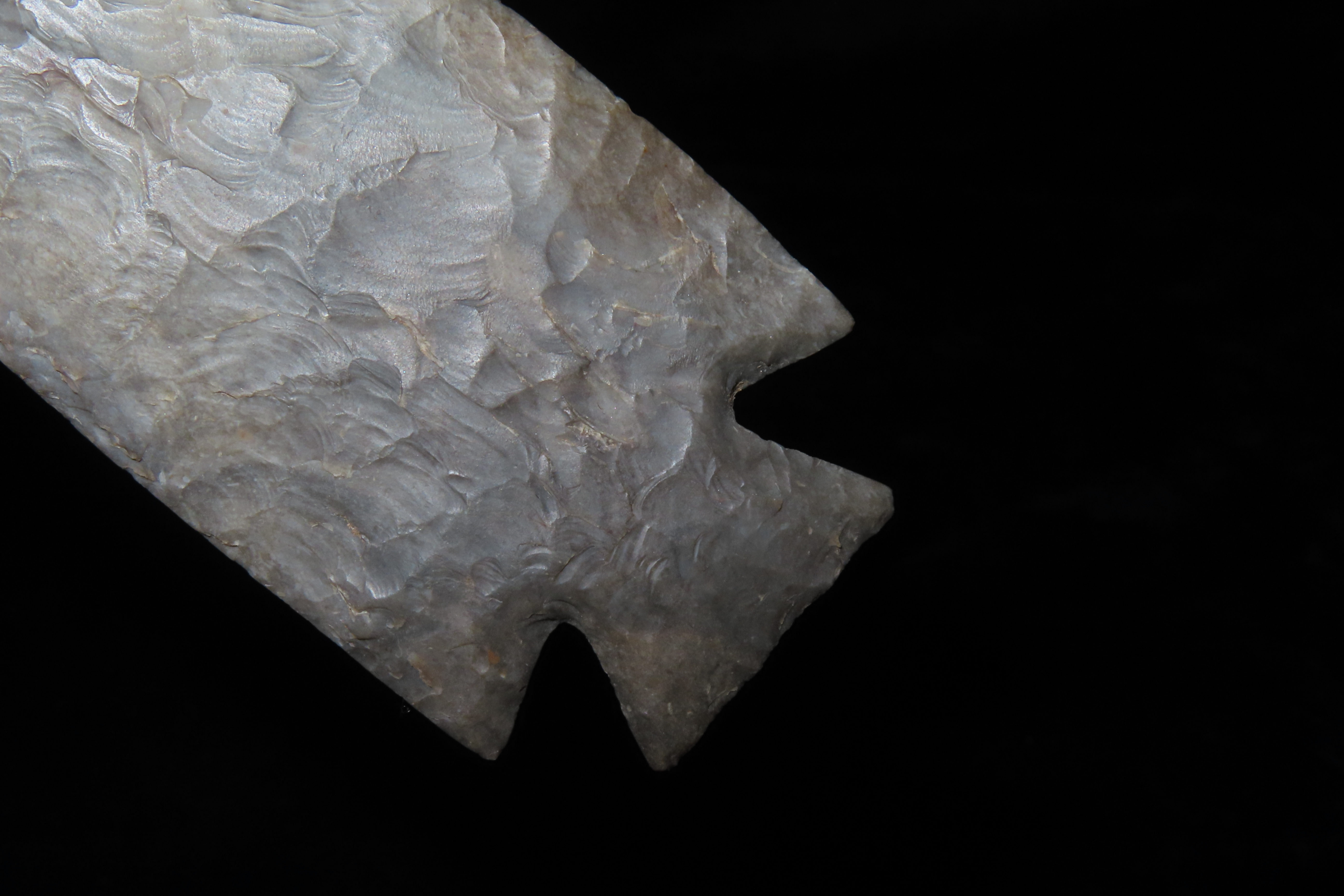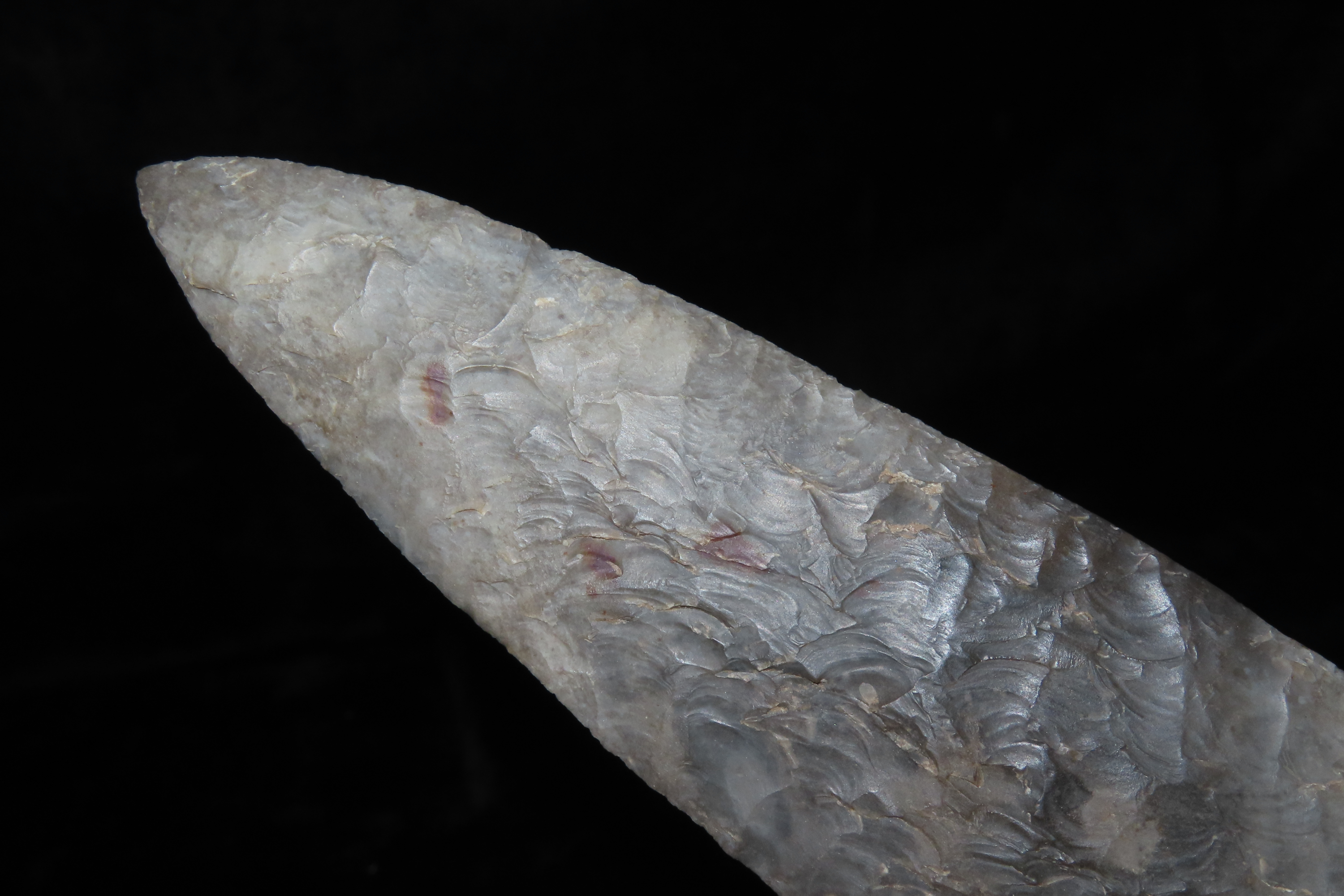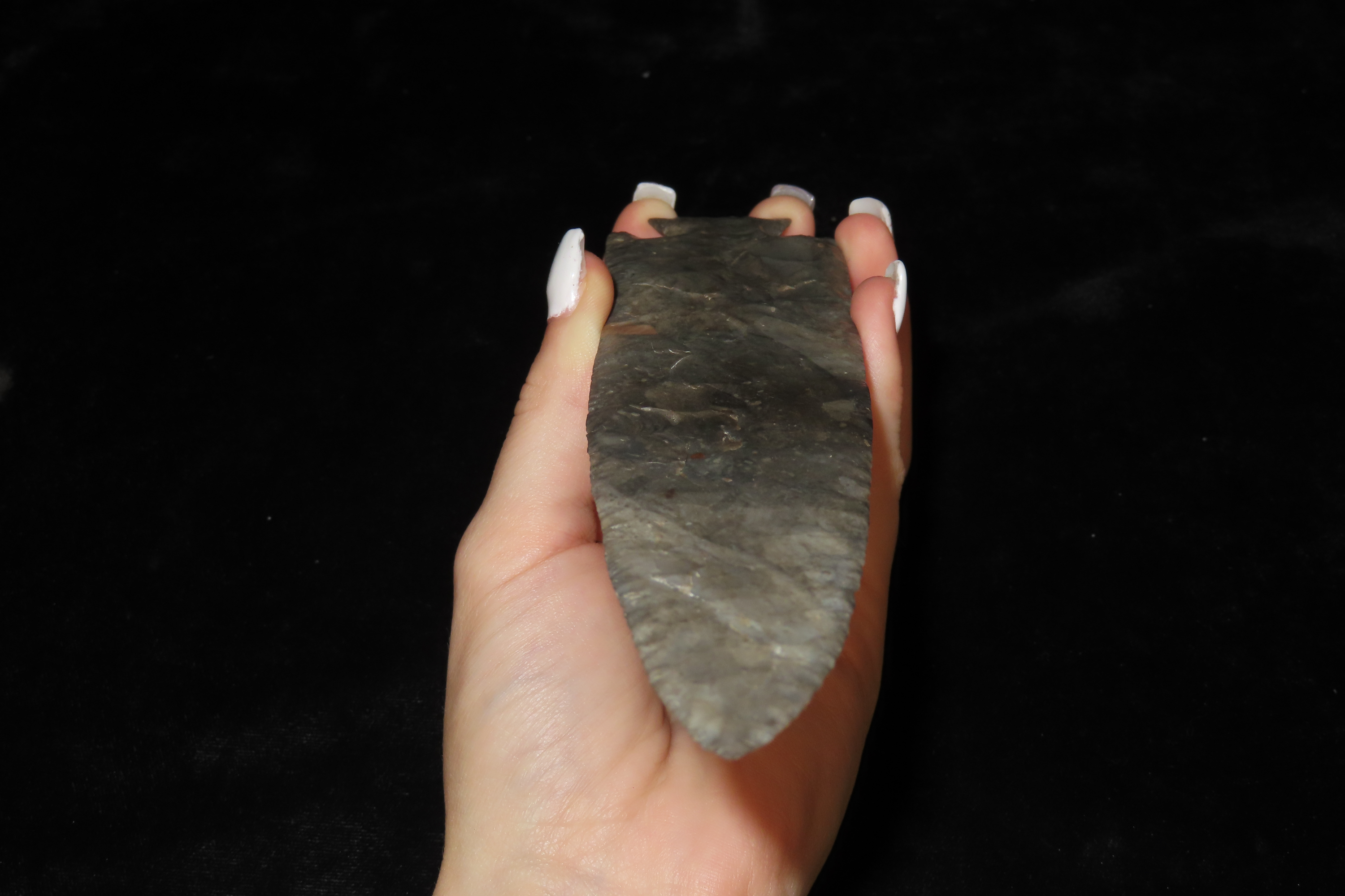 7 3/8″ Grey Ghost, Outstanding Collectors Item, Excellent Center Piece for a frame/collection. “Gray ghosts” are large modern-made “flint spears” that were made during the 40’s, 50’s, 60’s and early 70’s. These famous “flint spears” were made by Bryan Reinhardt beginning sometime in the 1940’s and continuing well into the 1970’s. Ex Jerry Maloney Collection, Eaton, Ohio. Jerry had a shop in Webb’s Antique Mall in Centerville, Indiana for 20 years and continued collecting and selling for another 15 years.