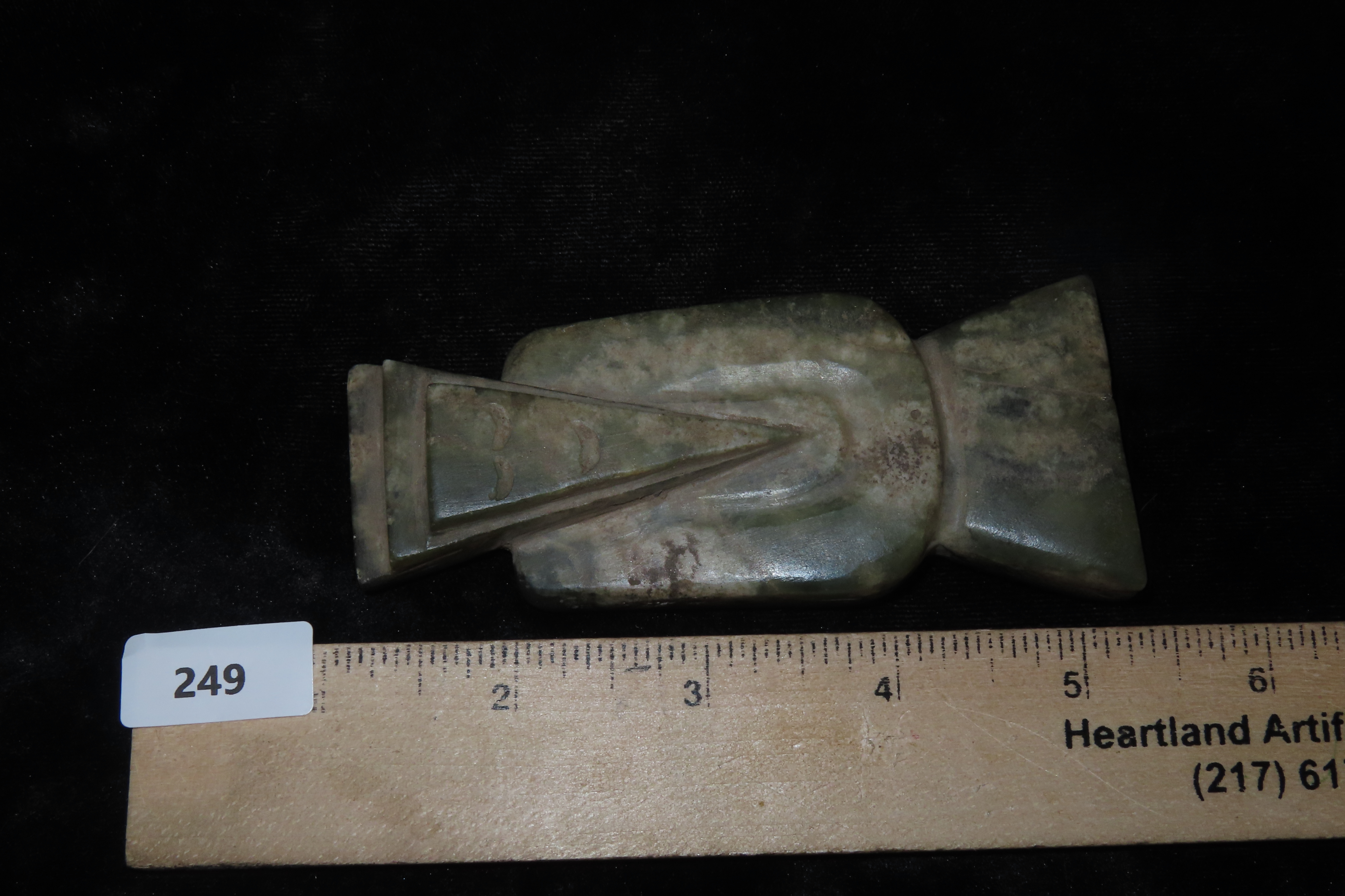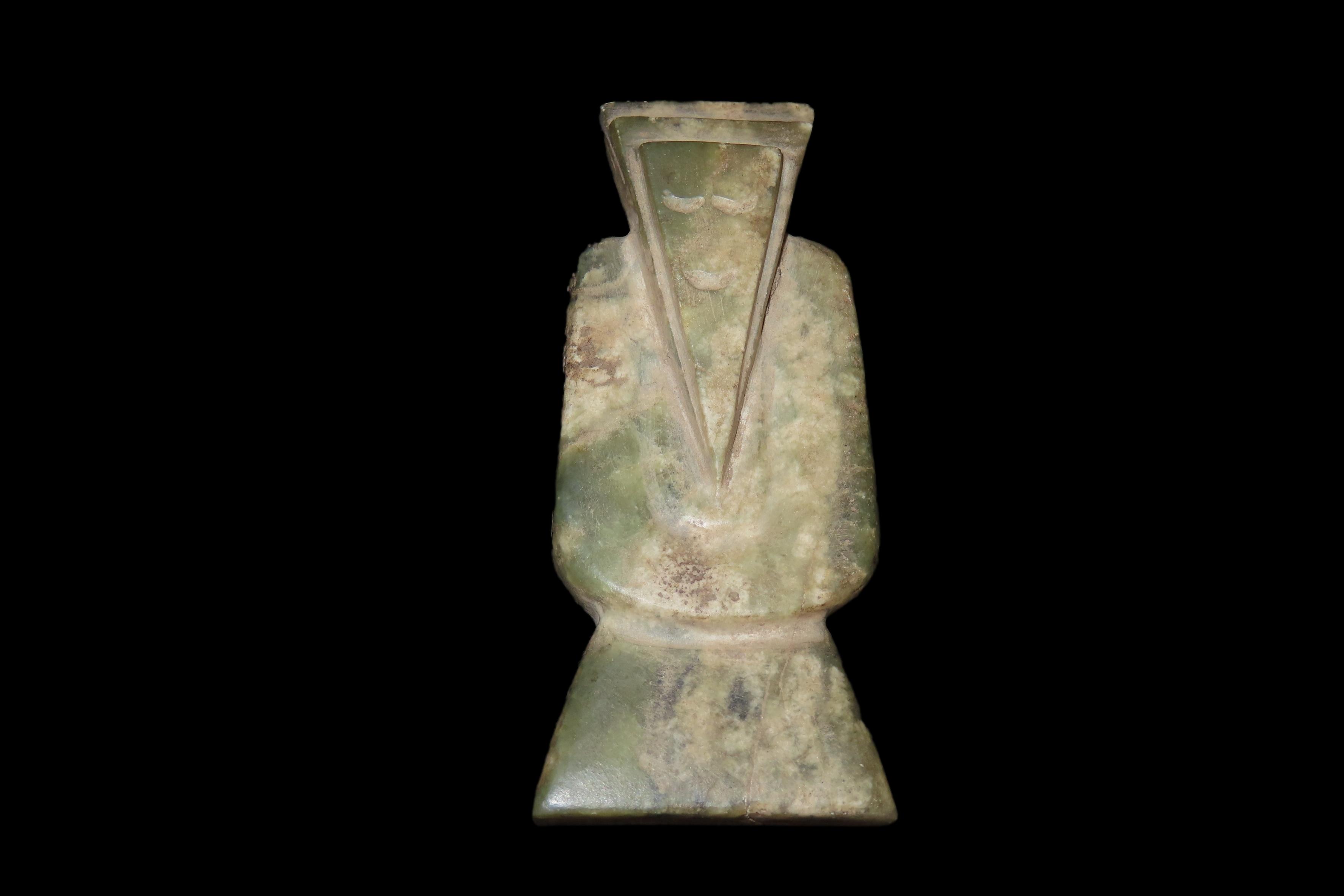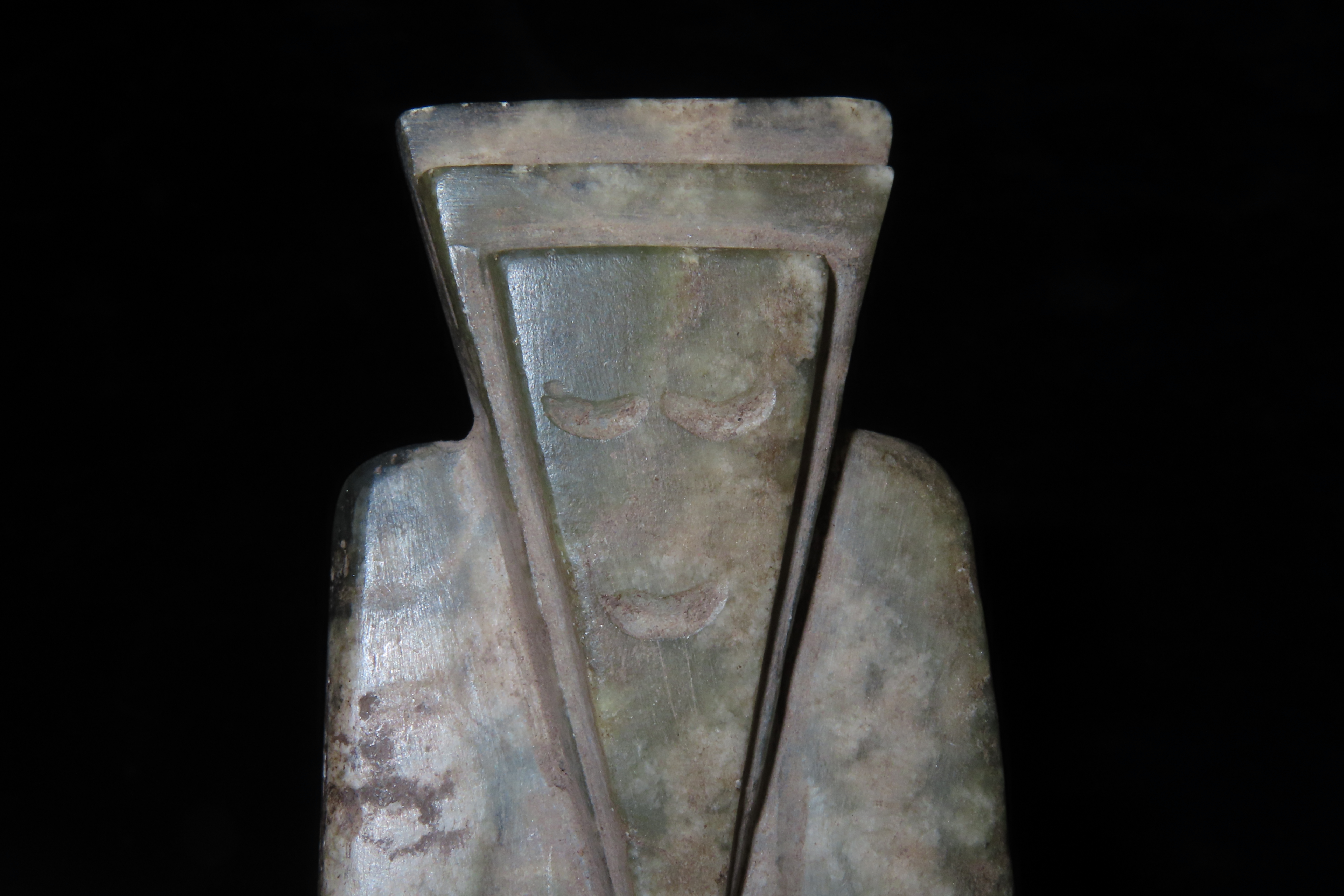 4 1/8″ Chinese Jade Pendant, Weng Zhong, originally named Ruan Weng Zhong, was a Qin Dynasty general. Because of his imposing stature, he was ordered to guard the border. Later generations carved his image into jade ornaments, carrying them as a ward off evil. The Weng Zhong is depicted standing, wearing a crown and a slender face. His eyes and mouth are engraved in intaglio, and he sports a long beard. He wears a loose robe with wide sleeves, his hands folded at his waist, the attire of a civil official. Ex Jerry Maloney Collection, Eaton, Ohio. Jerry had a shop in Webb’s Antique Mall in Centerville, Indiana for 20 years and continued collecting and selling for another 15 years.
