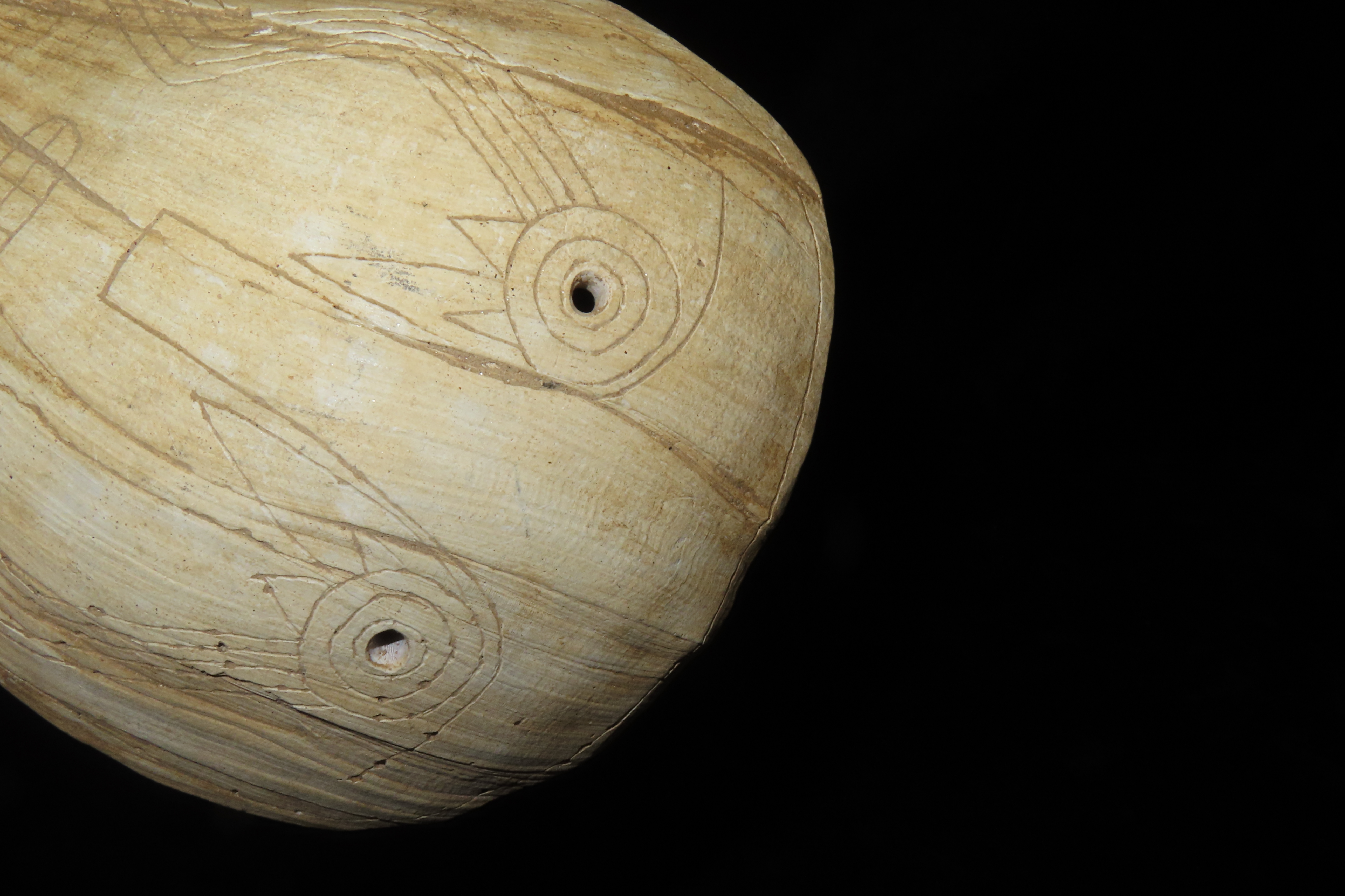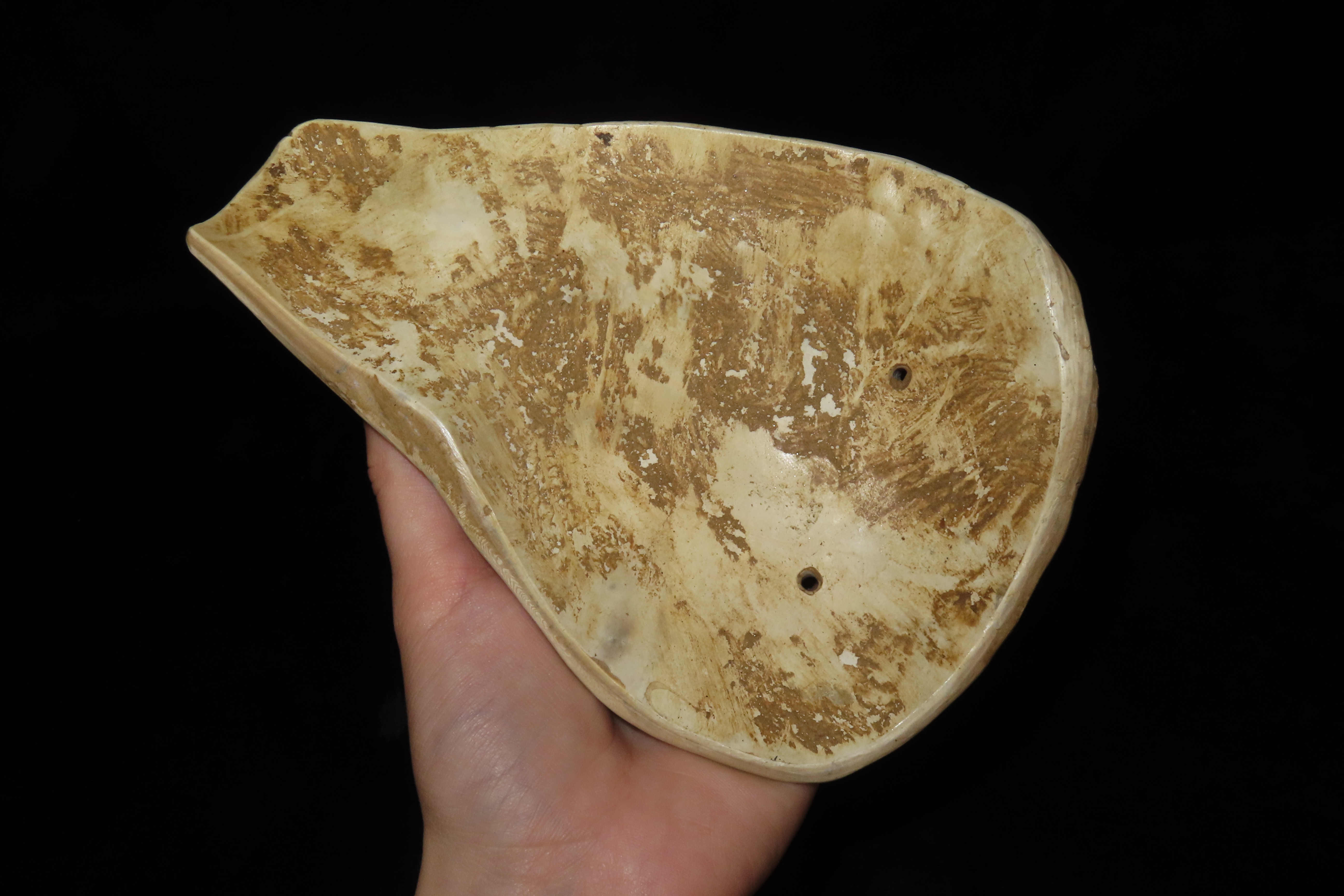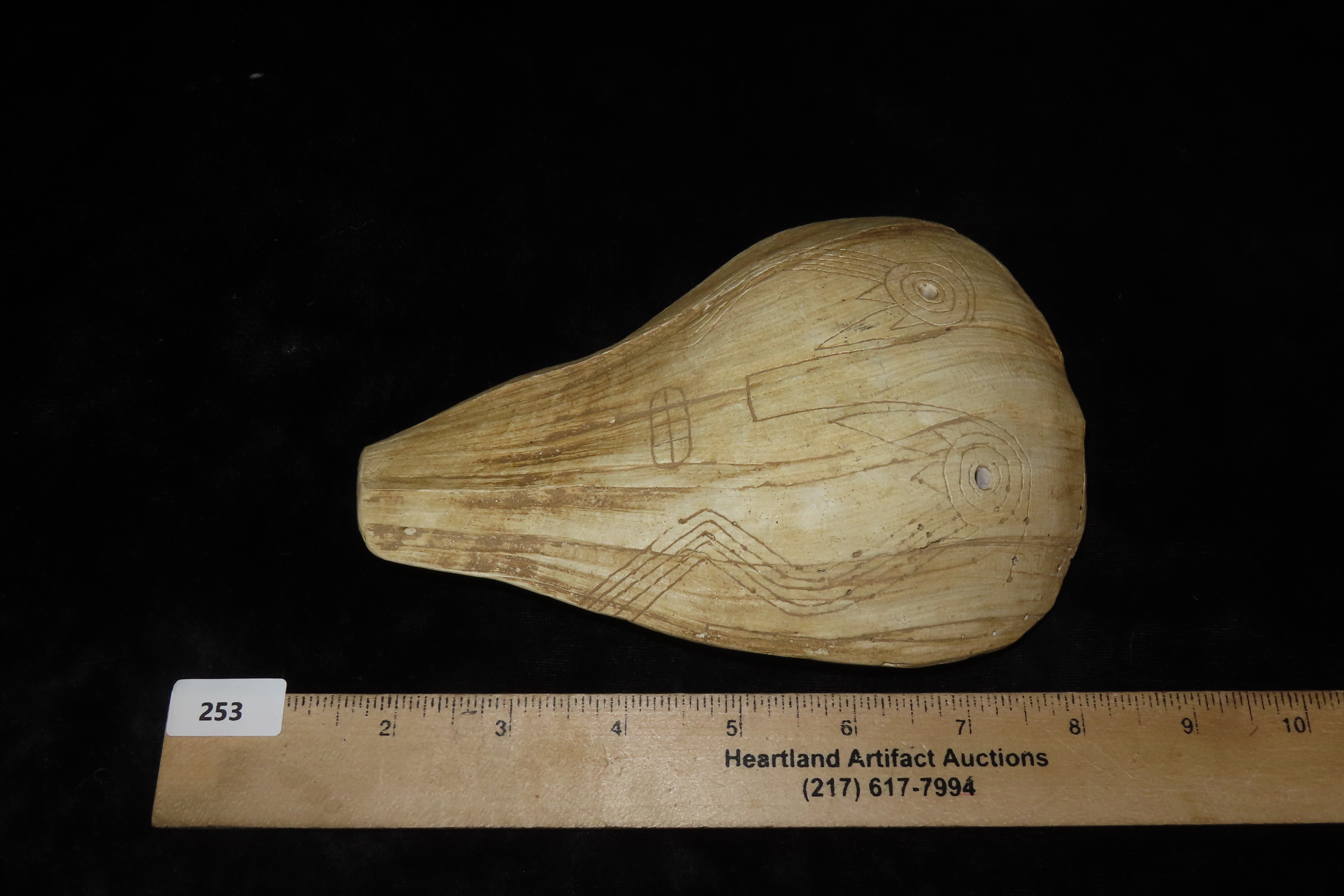 6 3/4″ Intricately Engraved Shell Mask, Ex Jerry Maloney Collection, Eaton, Ohio. Jerry had a shop in Webb’s Antique Mall in Centerville, Indiana for 20 years and continued collecting and selling for another 15 years.