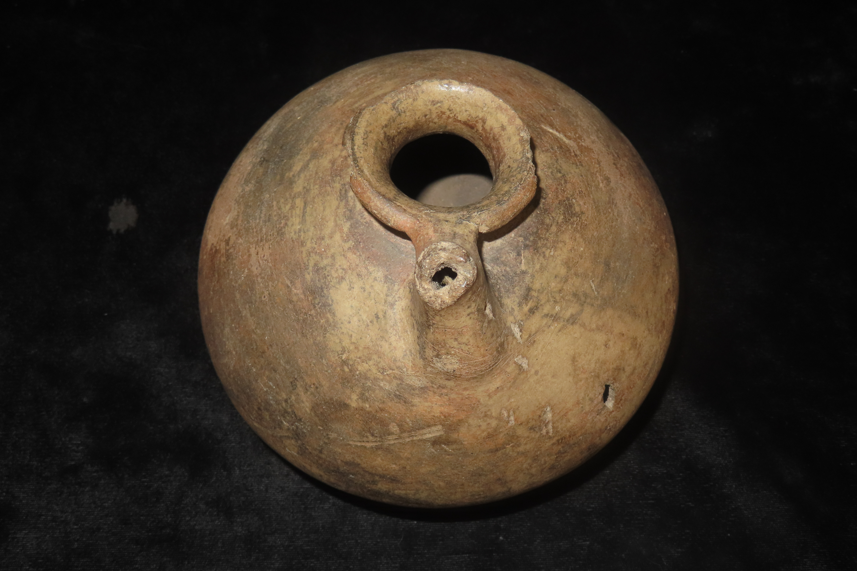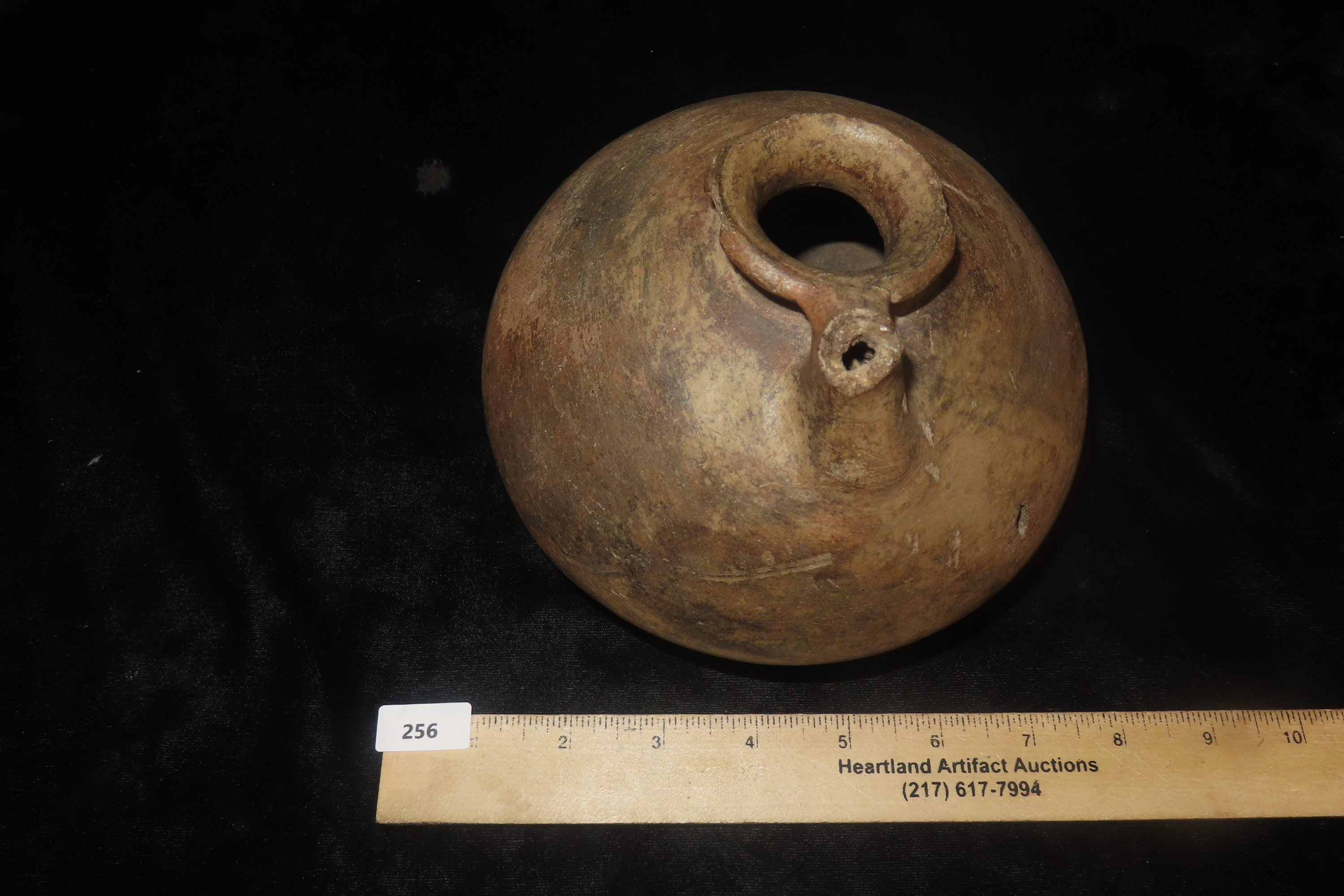 5 1/2″ X 6 1/8″ Mississippian Water Vessel with Spout, Ex Jerry Maloney Collection, Eaton, Ohio. Jerry had a shop in Webb’s Antique Mall in Centerville, Indiana for 20 years and continued collecting and selling for another 15 years.
