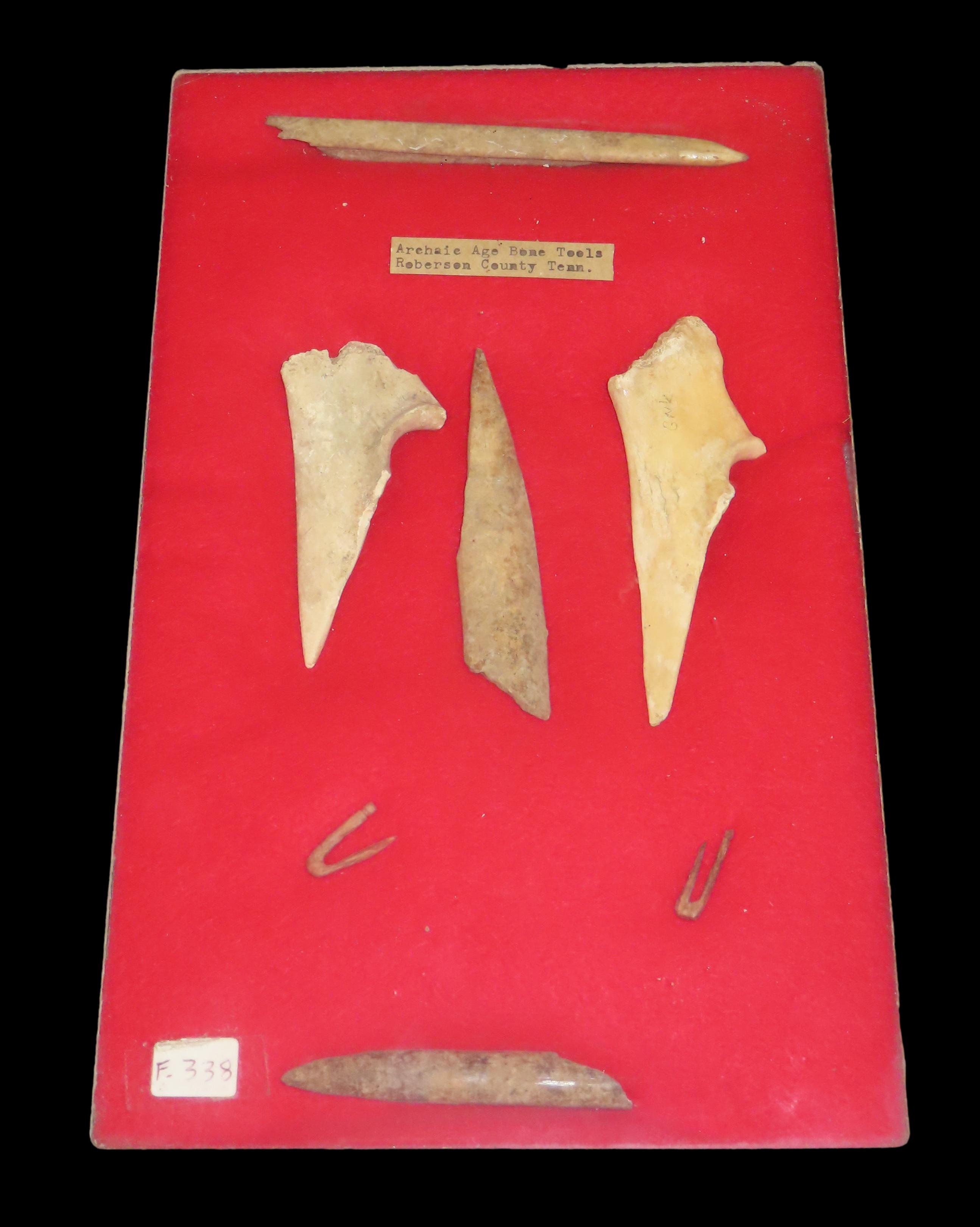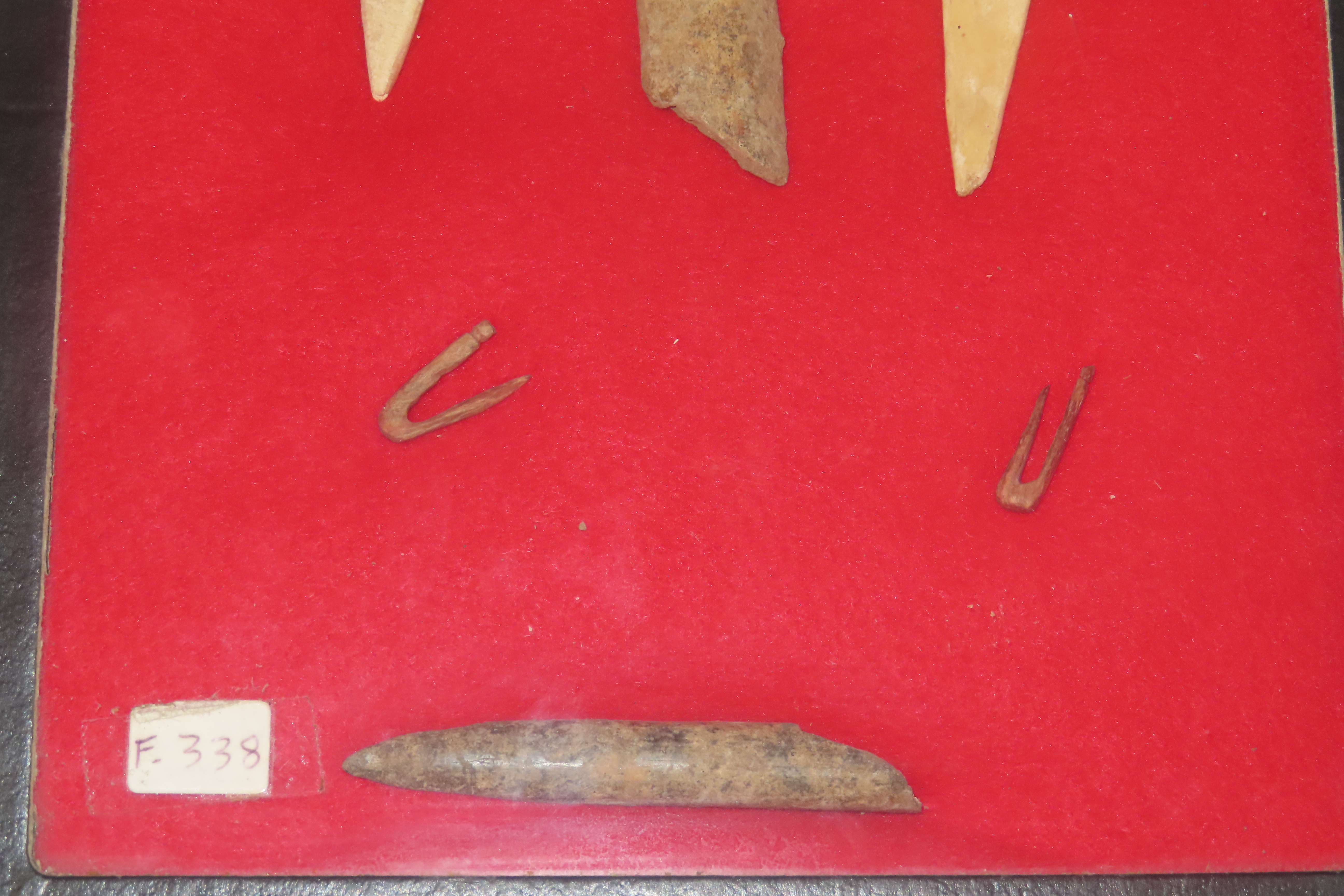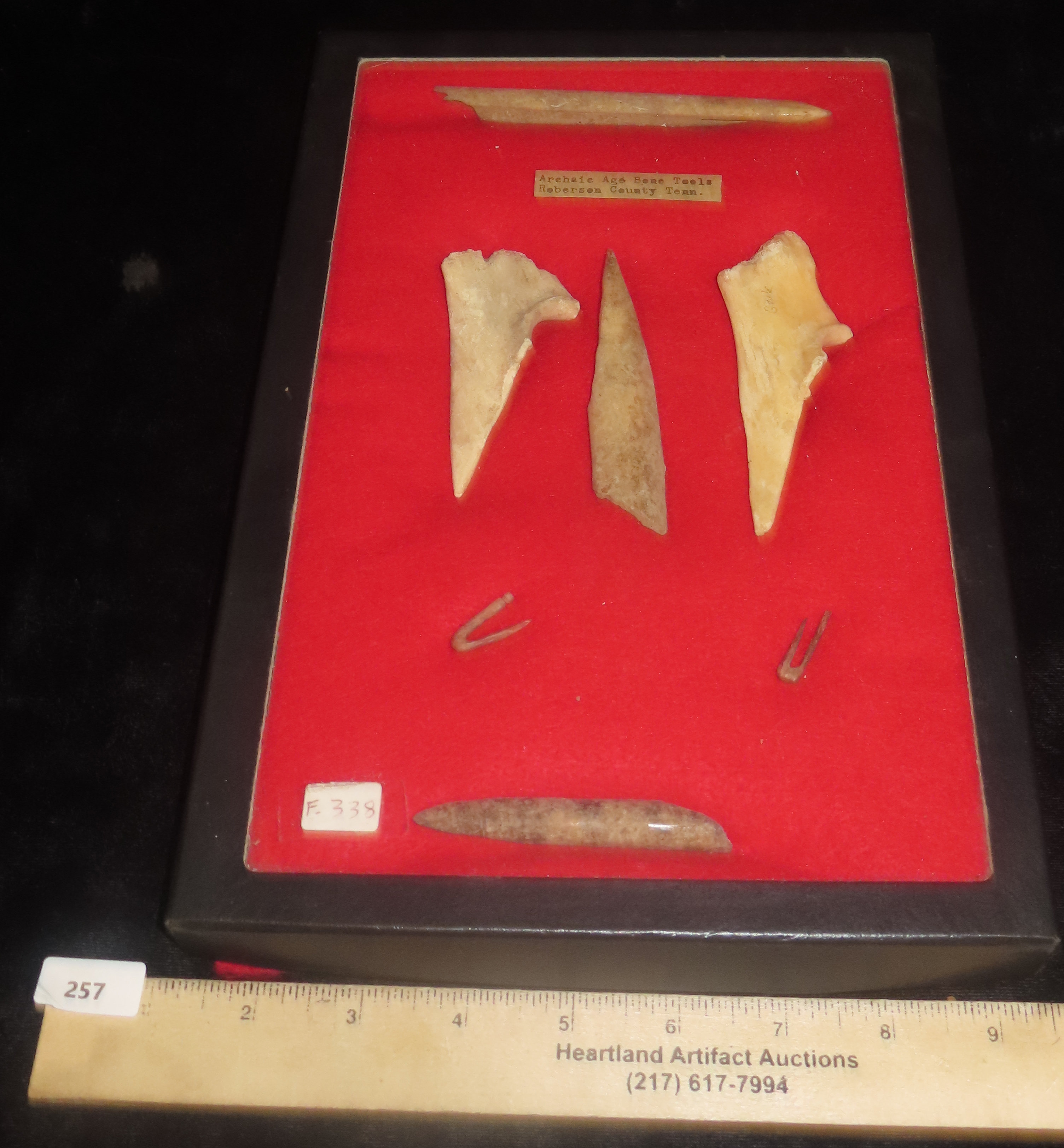 12 3/8″ 9 3/8″ Frame containing Archaic Bone Tools, found in Roberson Co., Tennessee, Ex Jerry Maloney Collection, Eaton, Ohio. Jerry had a shop in Webb’s Antique Mall in Centerville, Indiana for 20 years and continued collecting and selling for another 15 years.