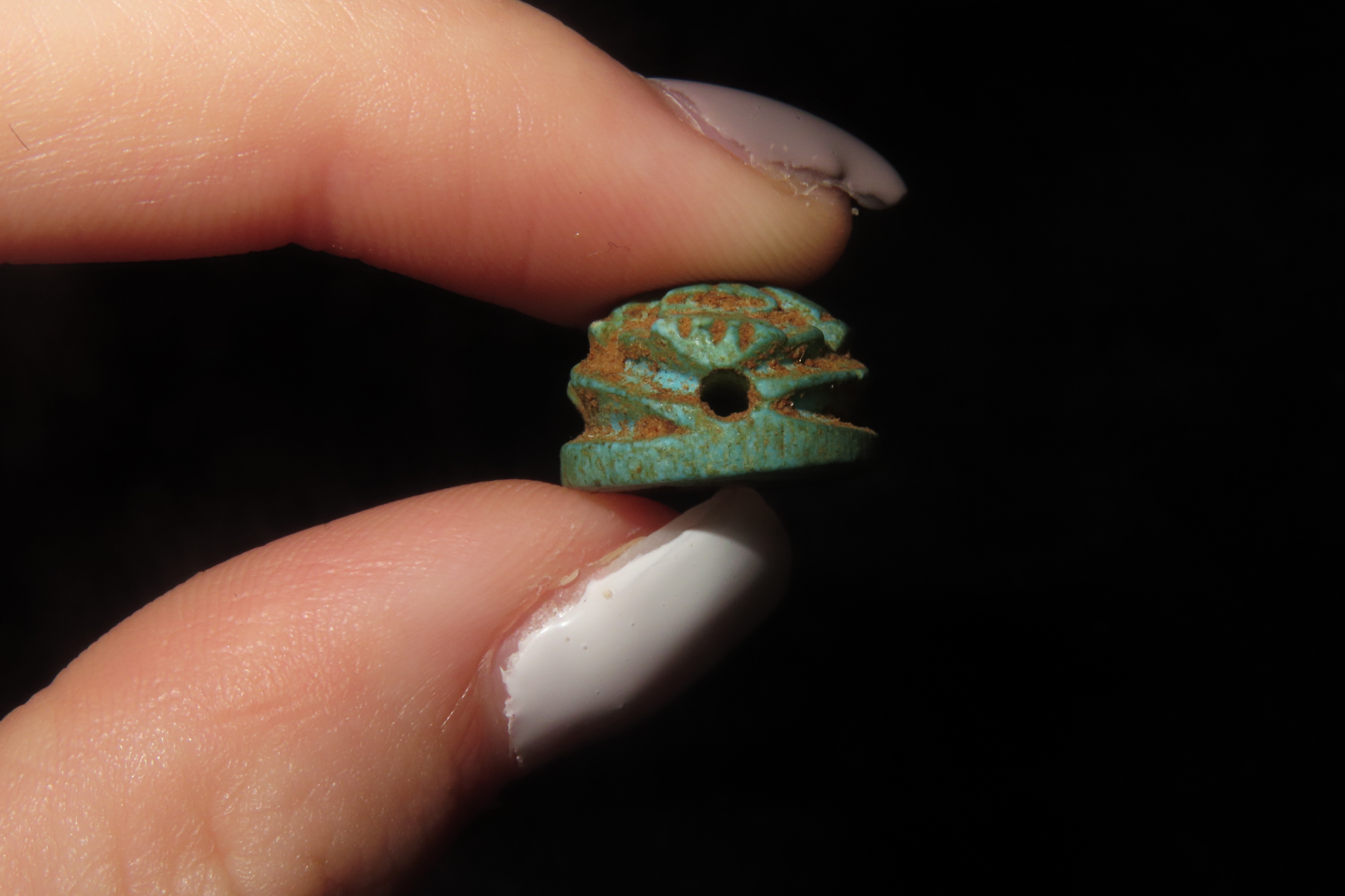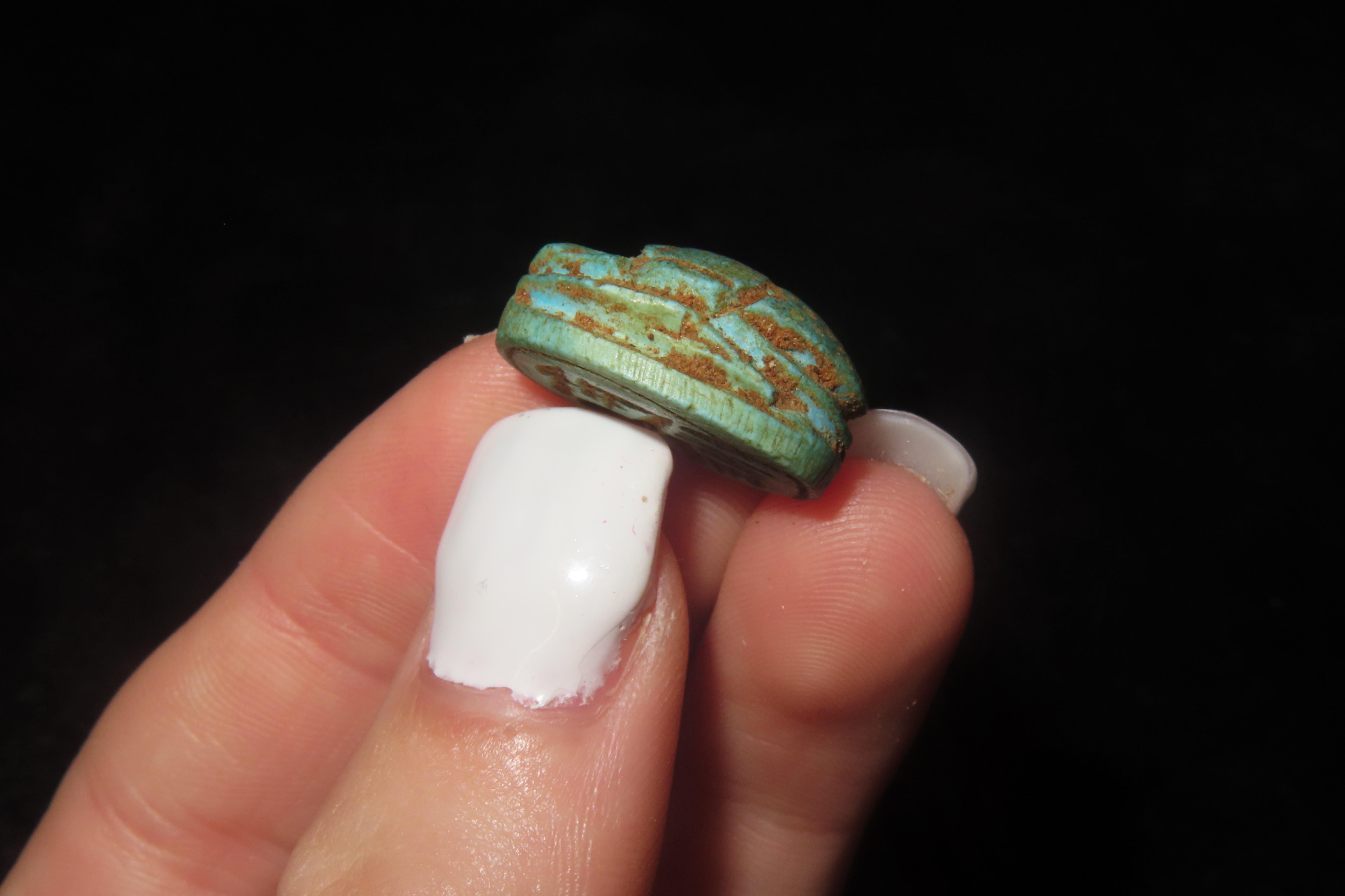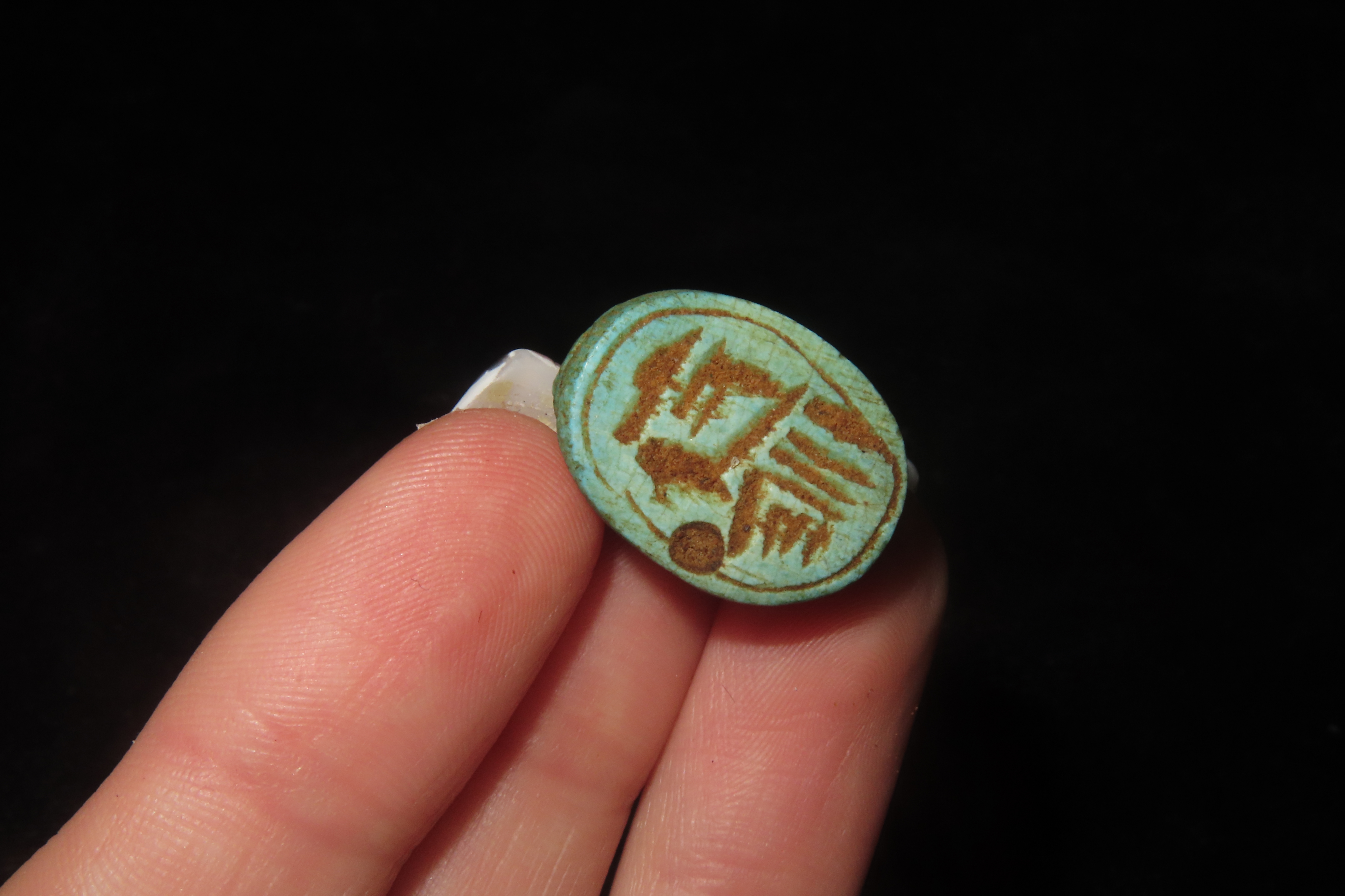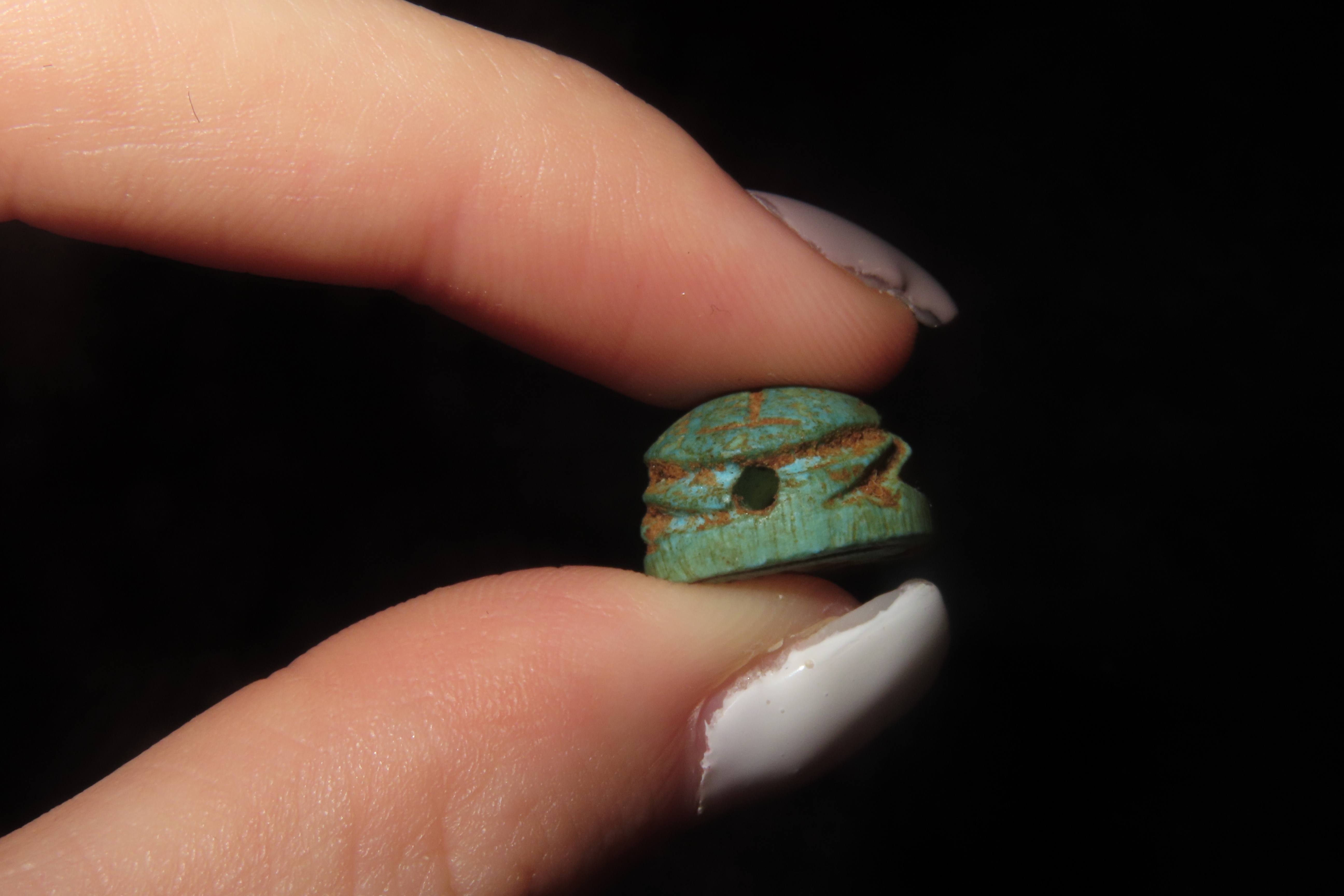 7/8″ x 5/8″ Antique Egyptian Green Scarab with an Inscription on the bottom, Middle to Late Kingdom