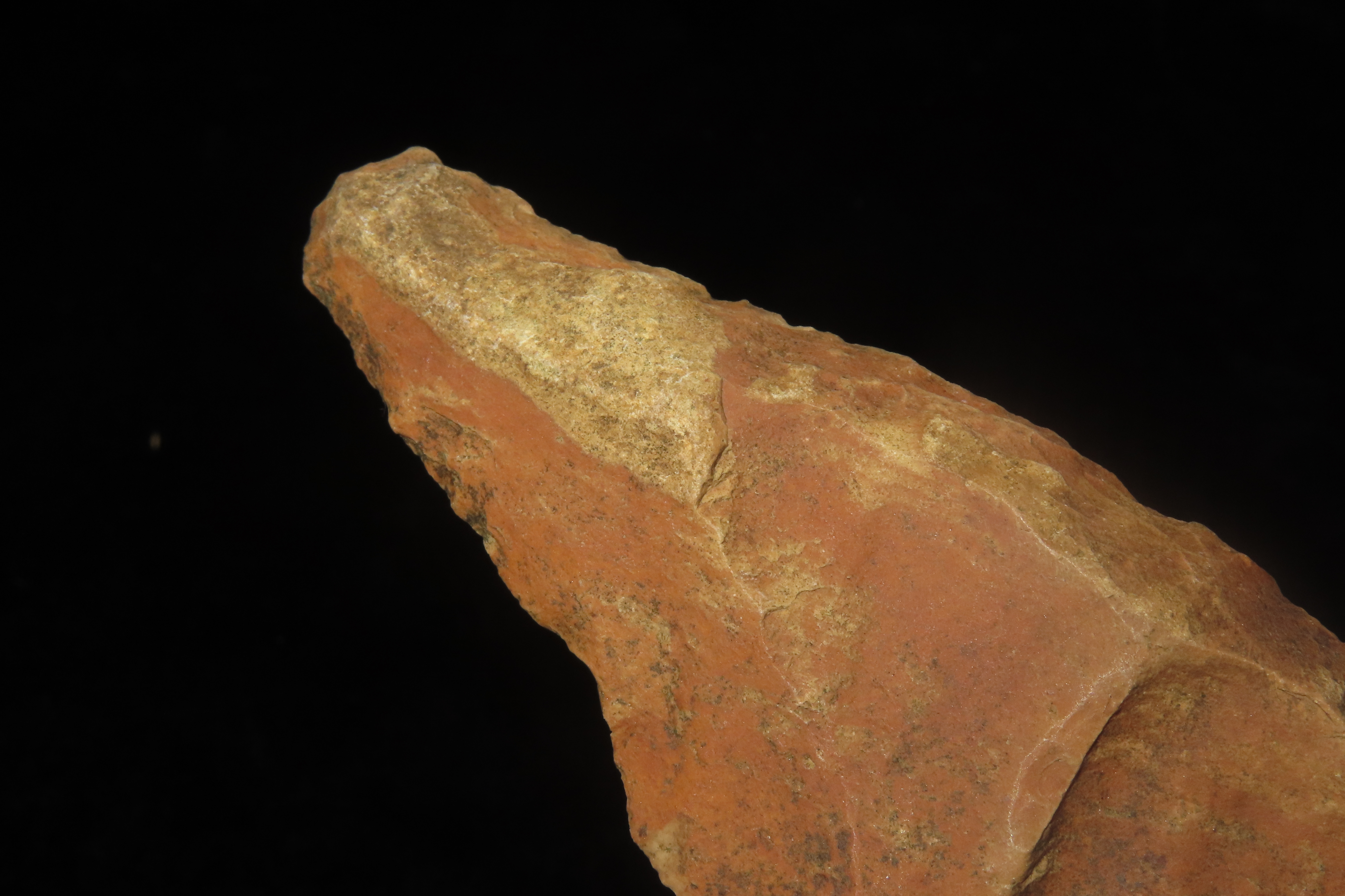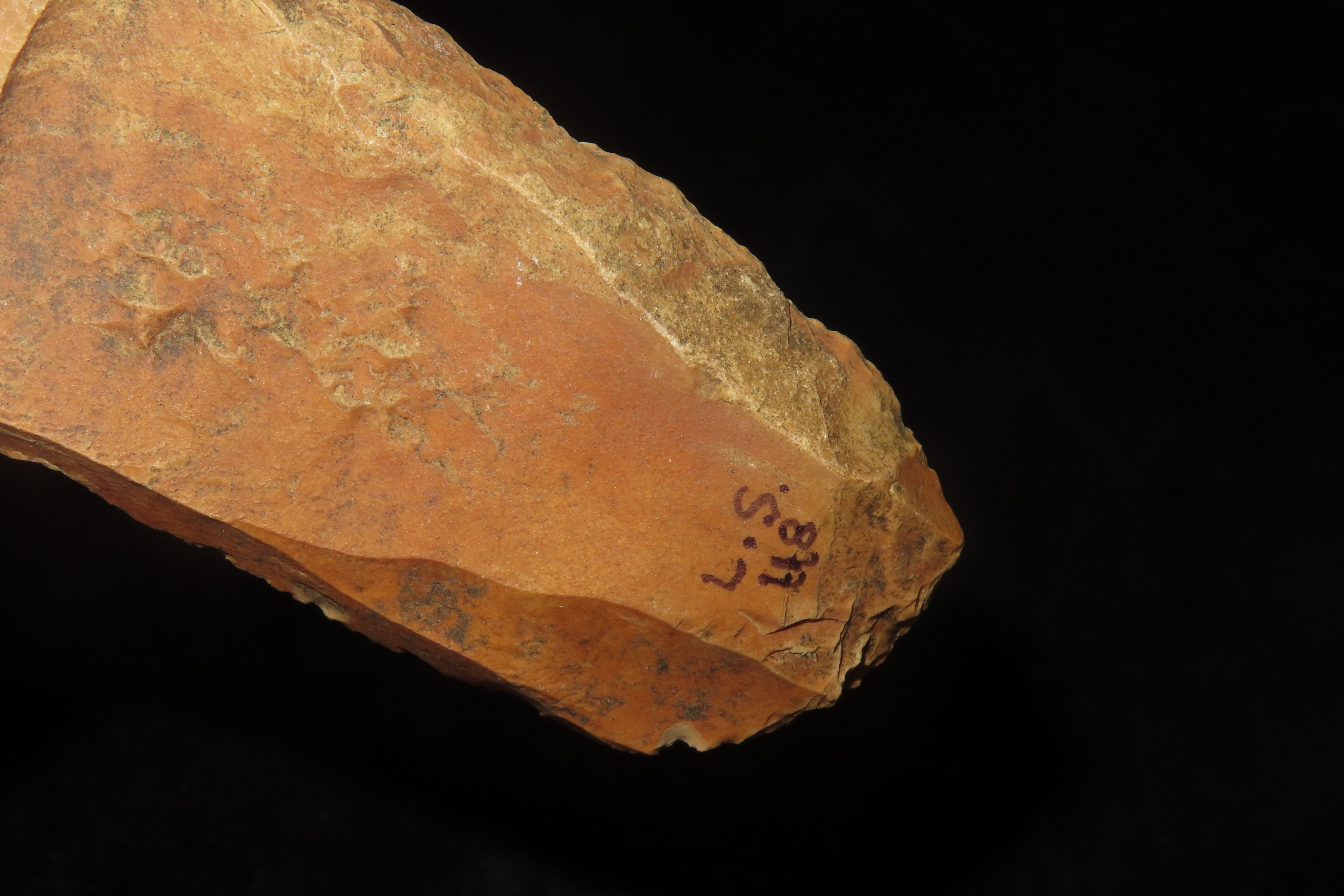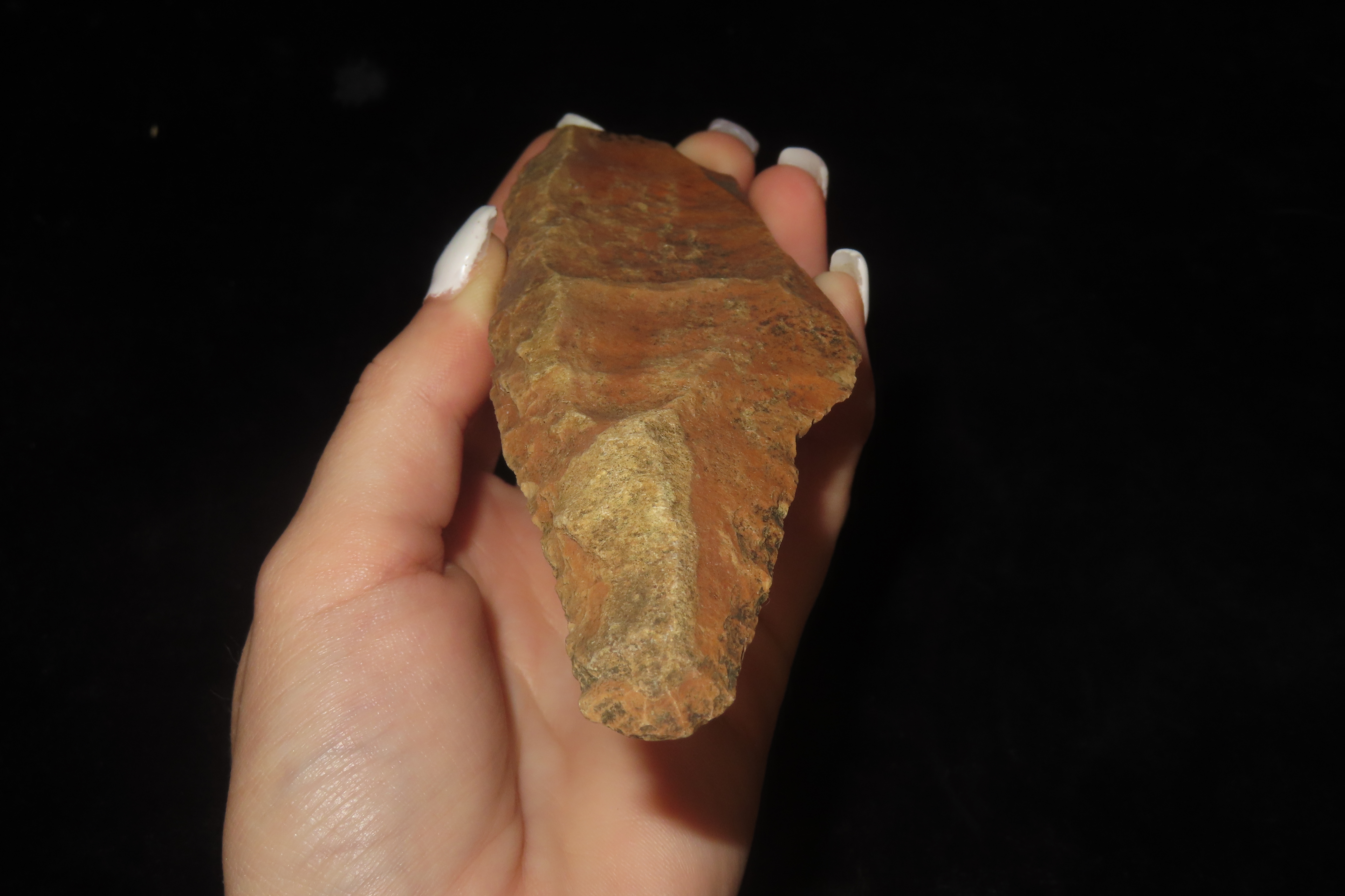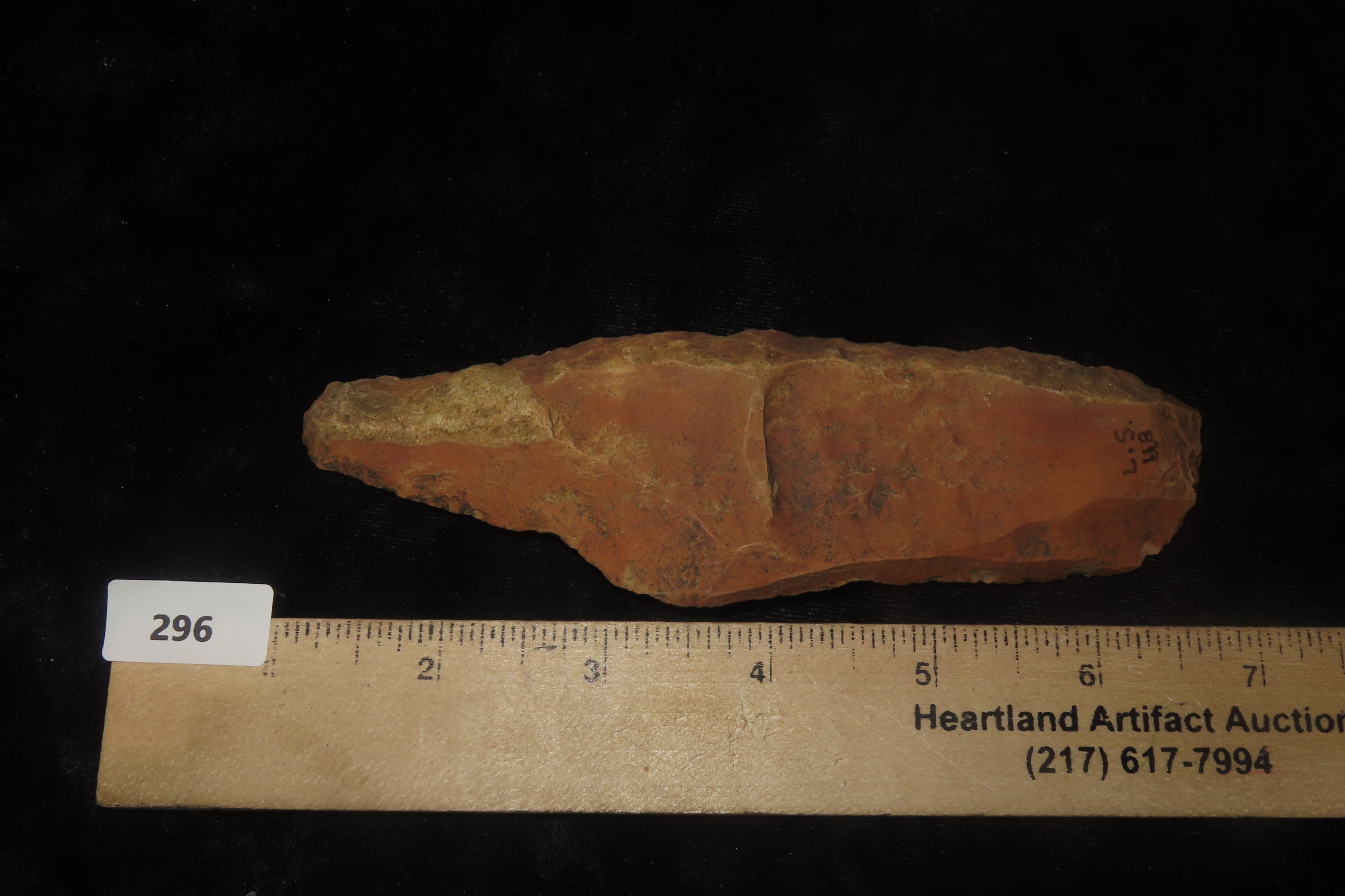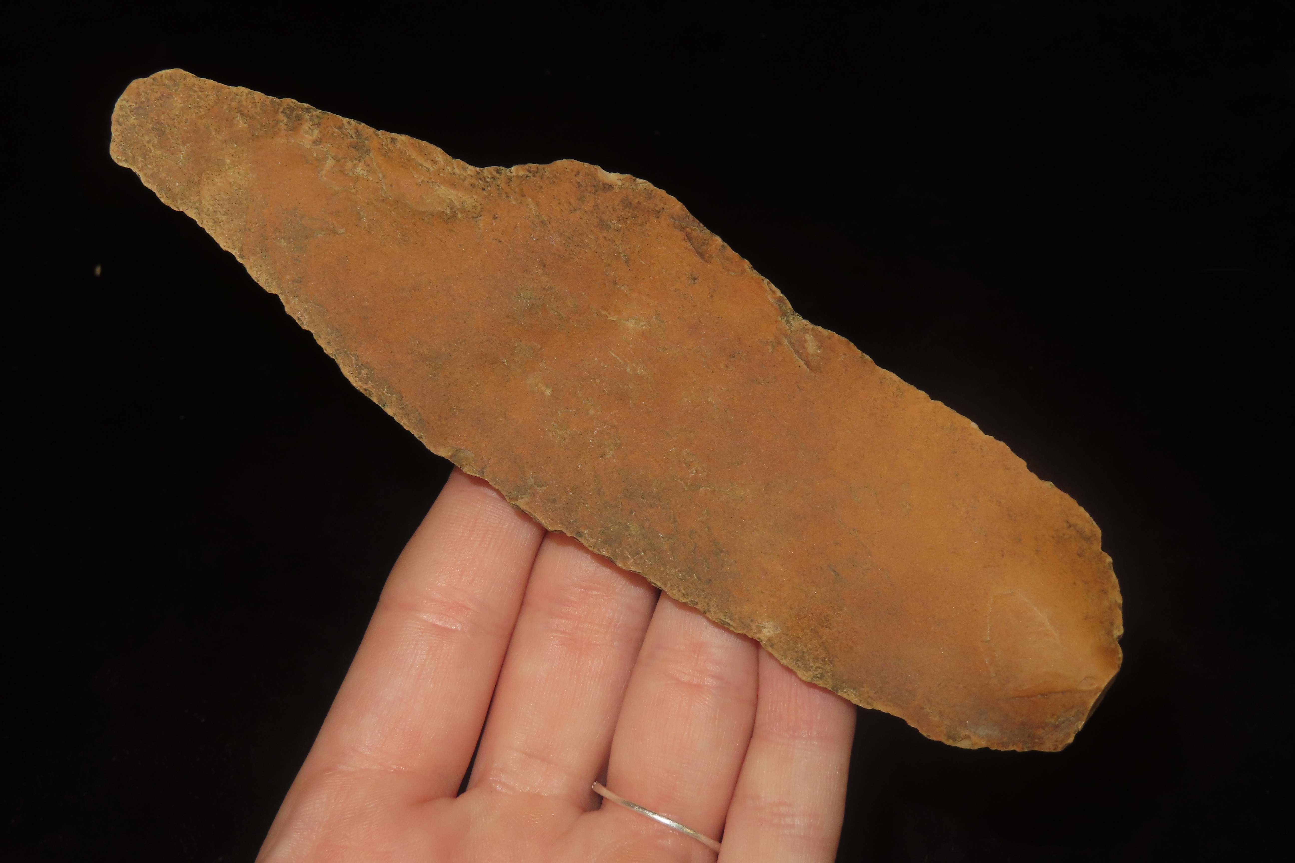 5 3/4″ x 1 1/4″ Paleo Uniface Blade with Great Orange Rive Stain, Found in the bottoms near Hillview Illinois in Greene Co. IL, Ex Dwain Pruitt and Stamper Collection