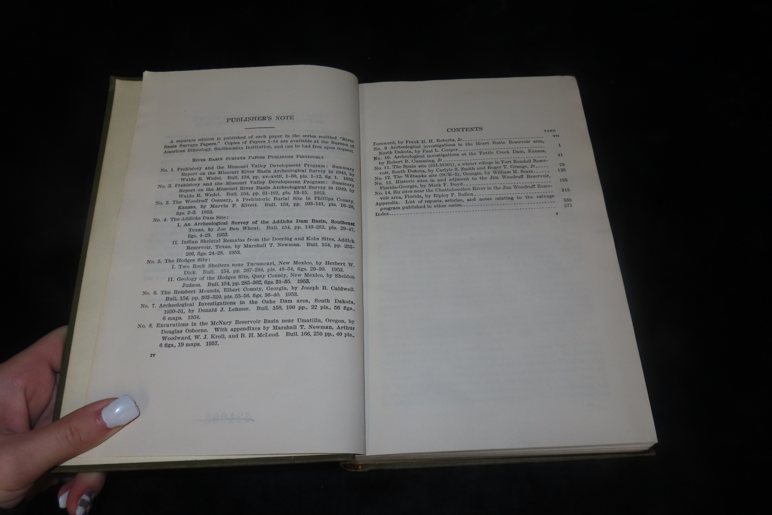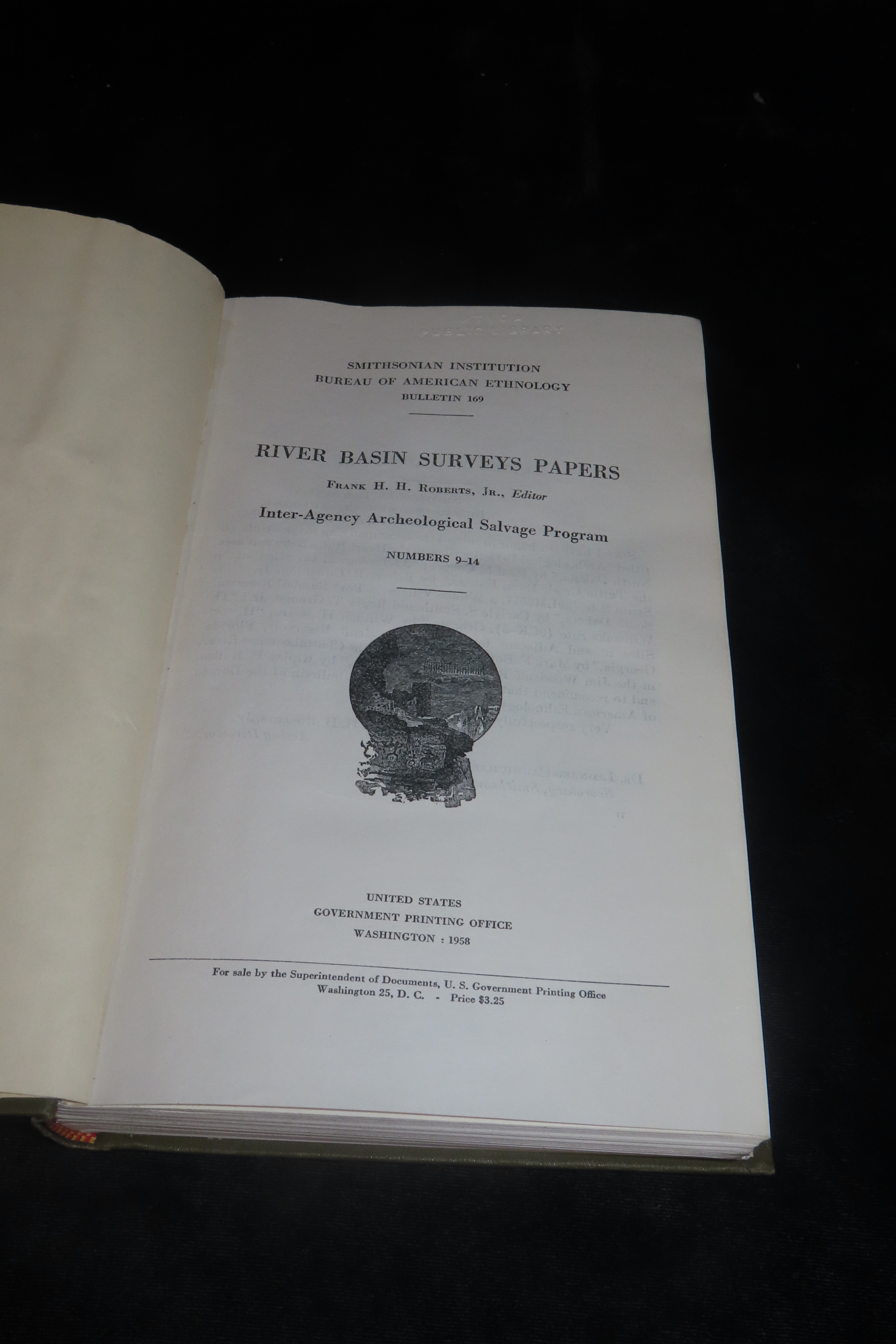 9 1/4″ x 6″ Book, River Basin Surveys Papers, Edited by Frank H. H. Roberts, Jr., Inter-Agency Archeological Salvage Program, Smithsonian Institution Bureau of American Ethnology, Bulletin 169, 1958
