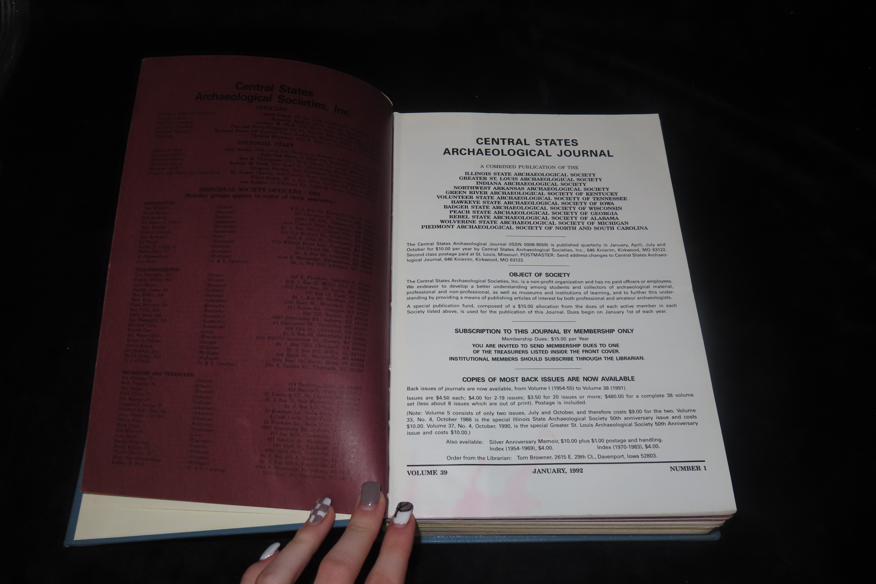 Book Containing Multiple Publications of the Central States Archaeological Journal by the Greater St. Louis, Indiana, Illinois State, Northwest Arkansas, Green River (Kentucky) Archaeological Societies, Volume 39 – 41 of the Years 1992 – 1994