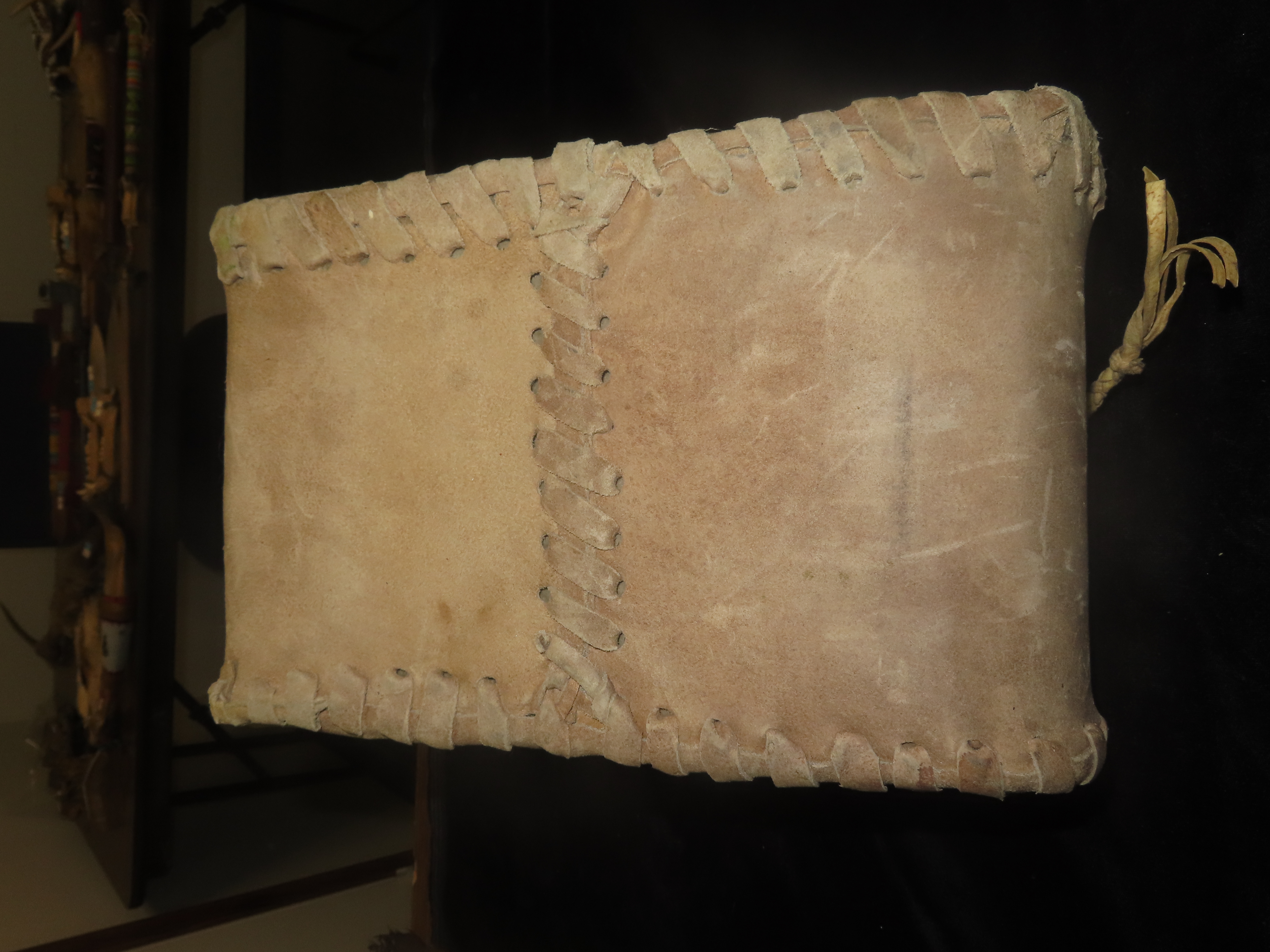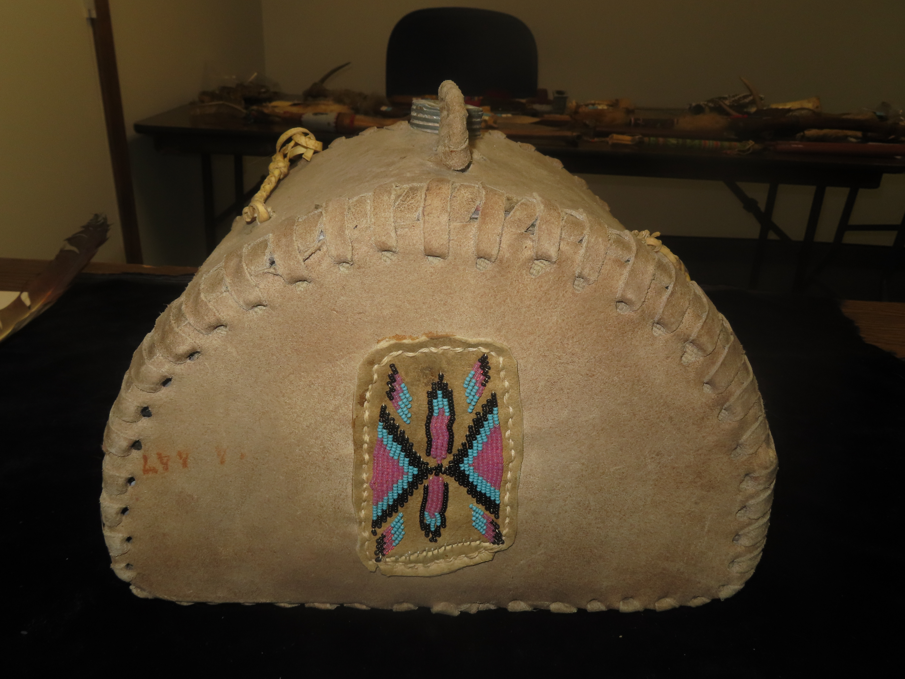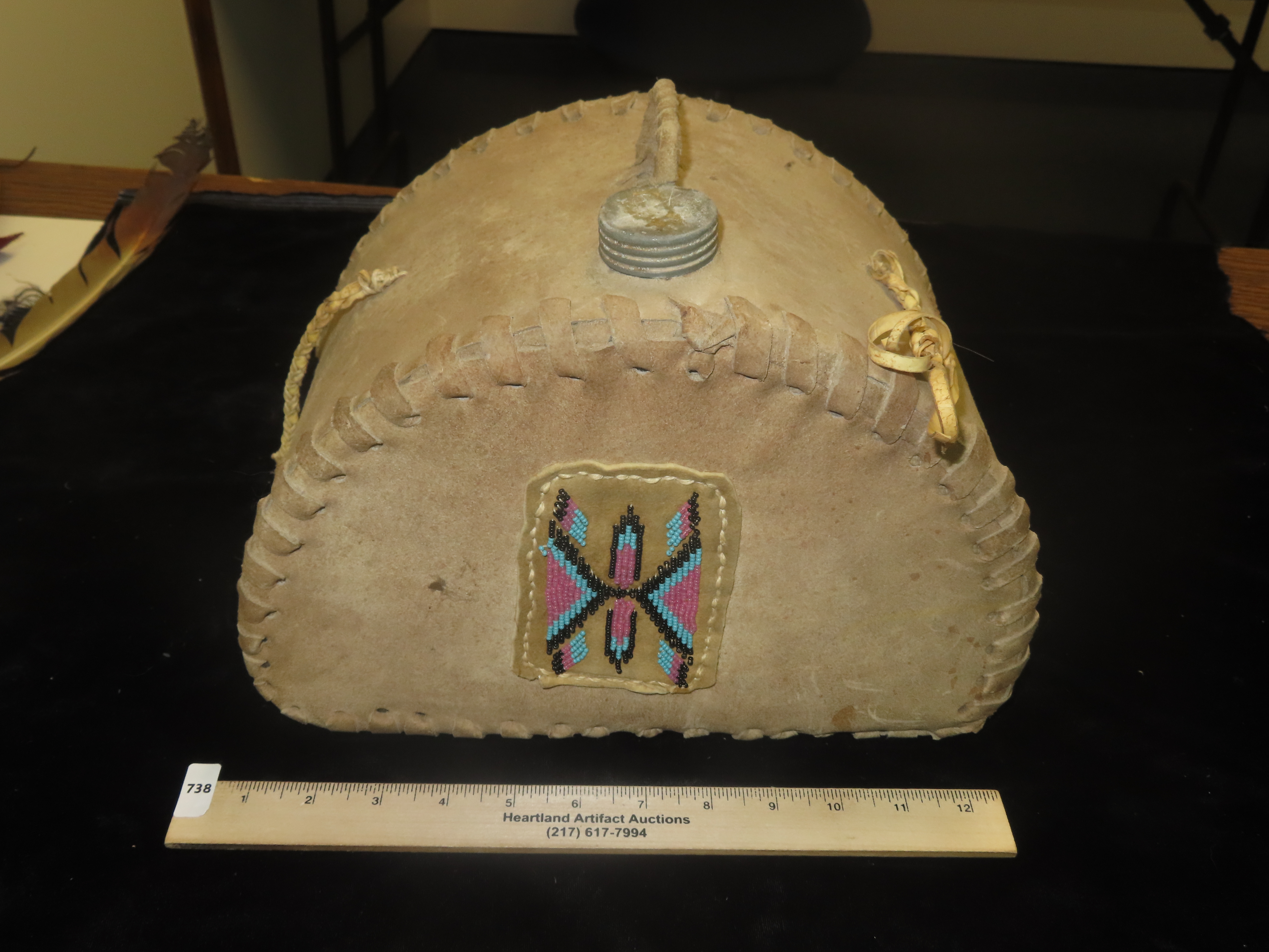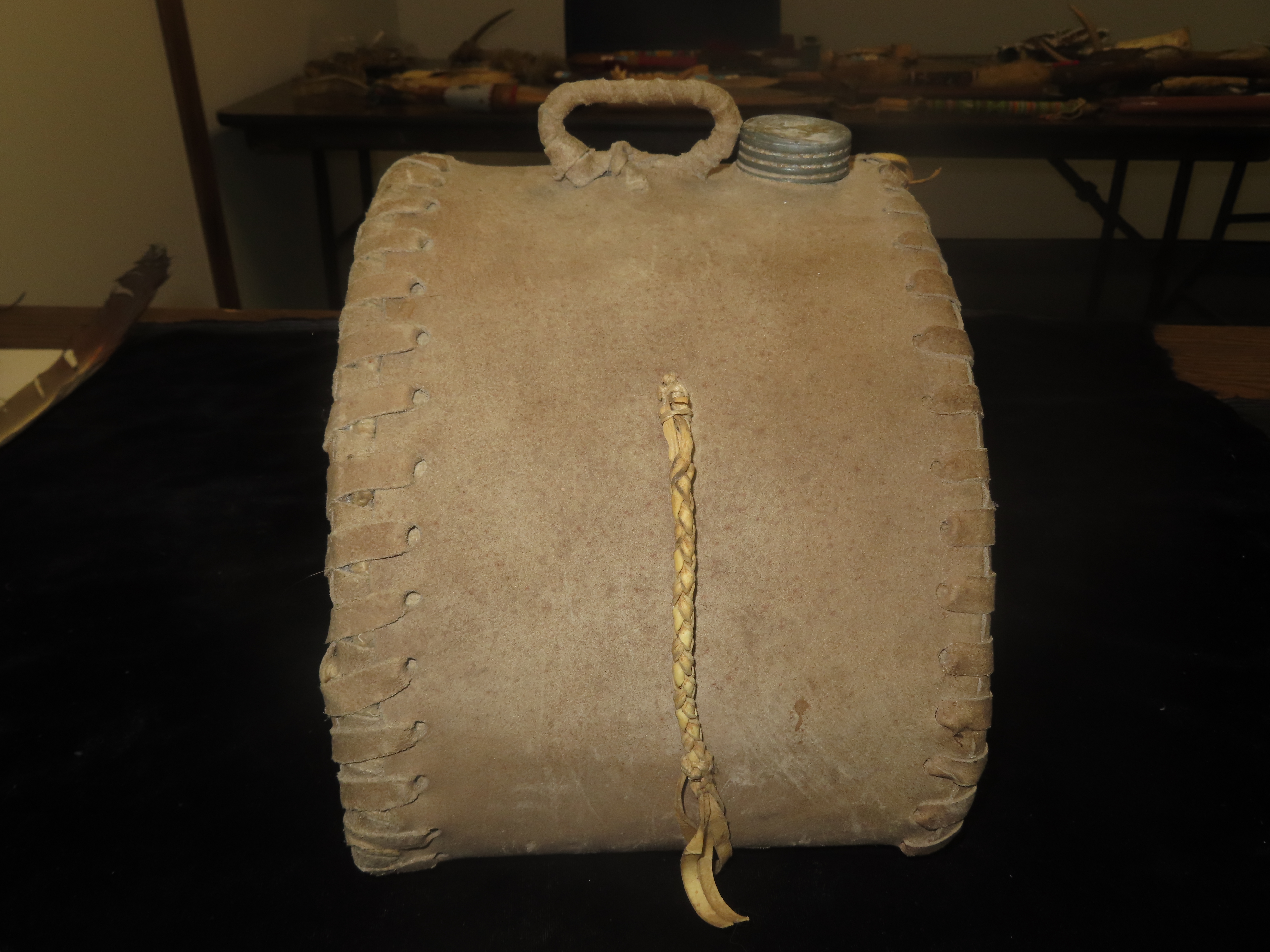 Antique Native American beaded hide canteen or water flask. It is made from tanned animal hide, possibly deerskin, with a metal screw cap. The canteen is hand-stitched along the edges and features a small panel of beadwork. The beaded design is a stylized