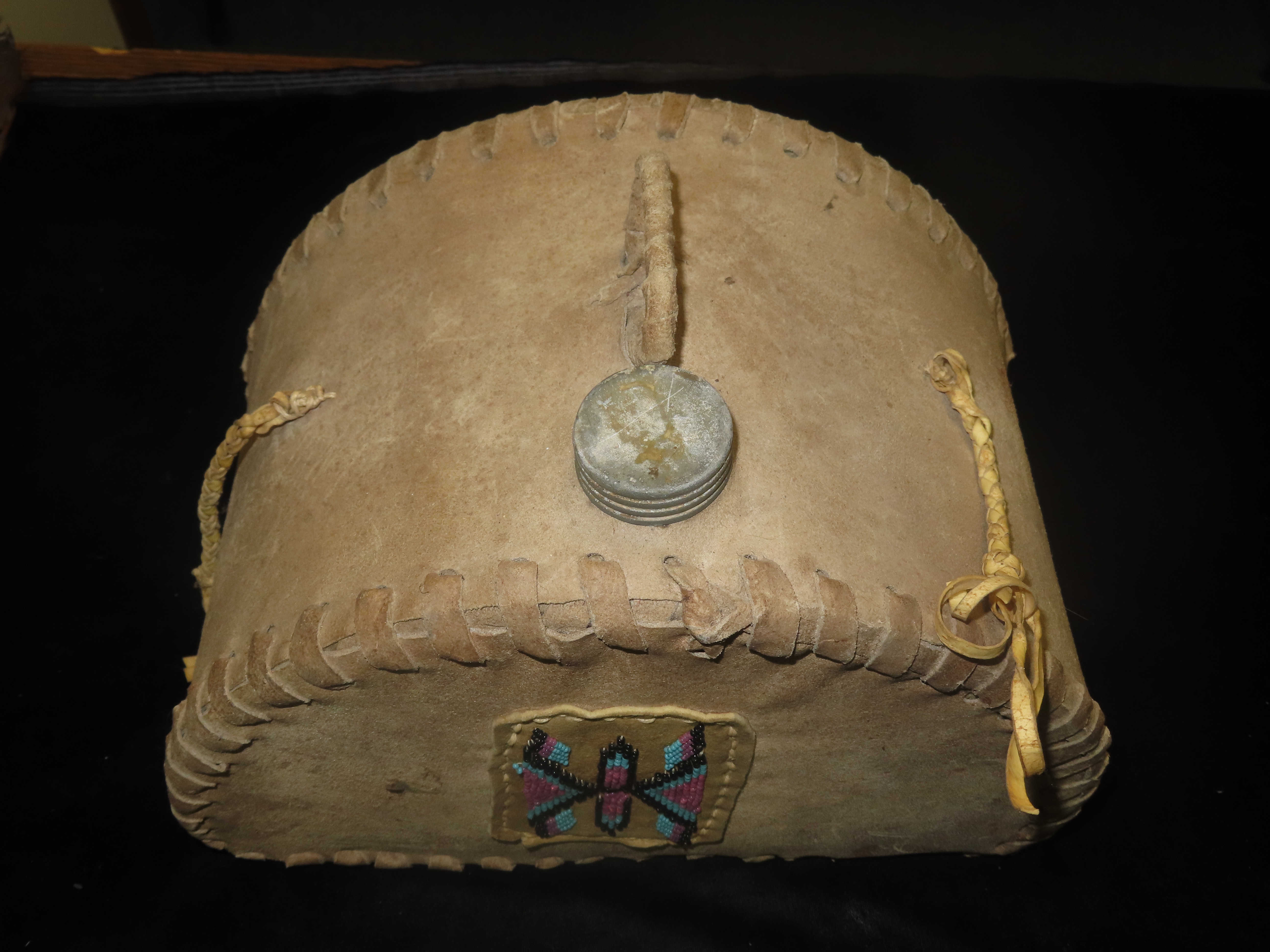 Antique Native American beaded hide canteen or water flask. It is made from tanned animal hide, possibly deerskin, with a metal screw cap. The canteen is hand-stitched along the edges and features a small panel of beadwork. The beaded design is a stylized geometric butterfly or winged motif, which is a common symbol in Native American art.