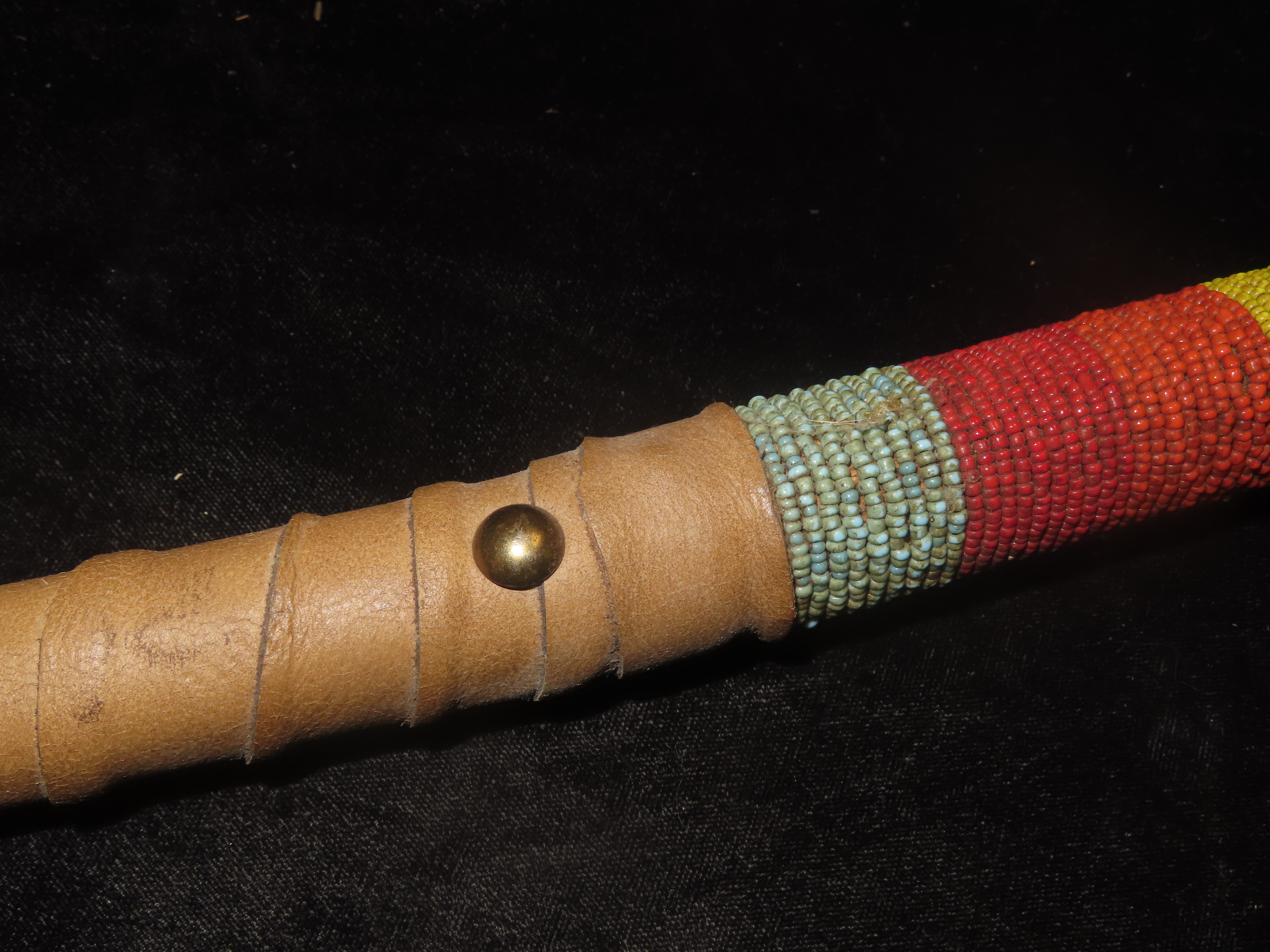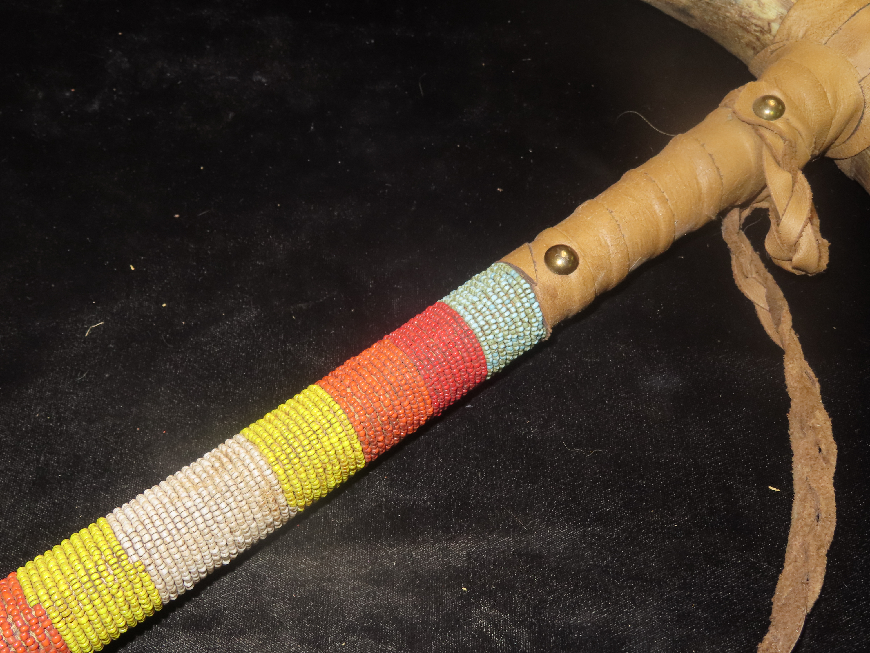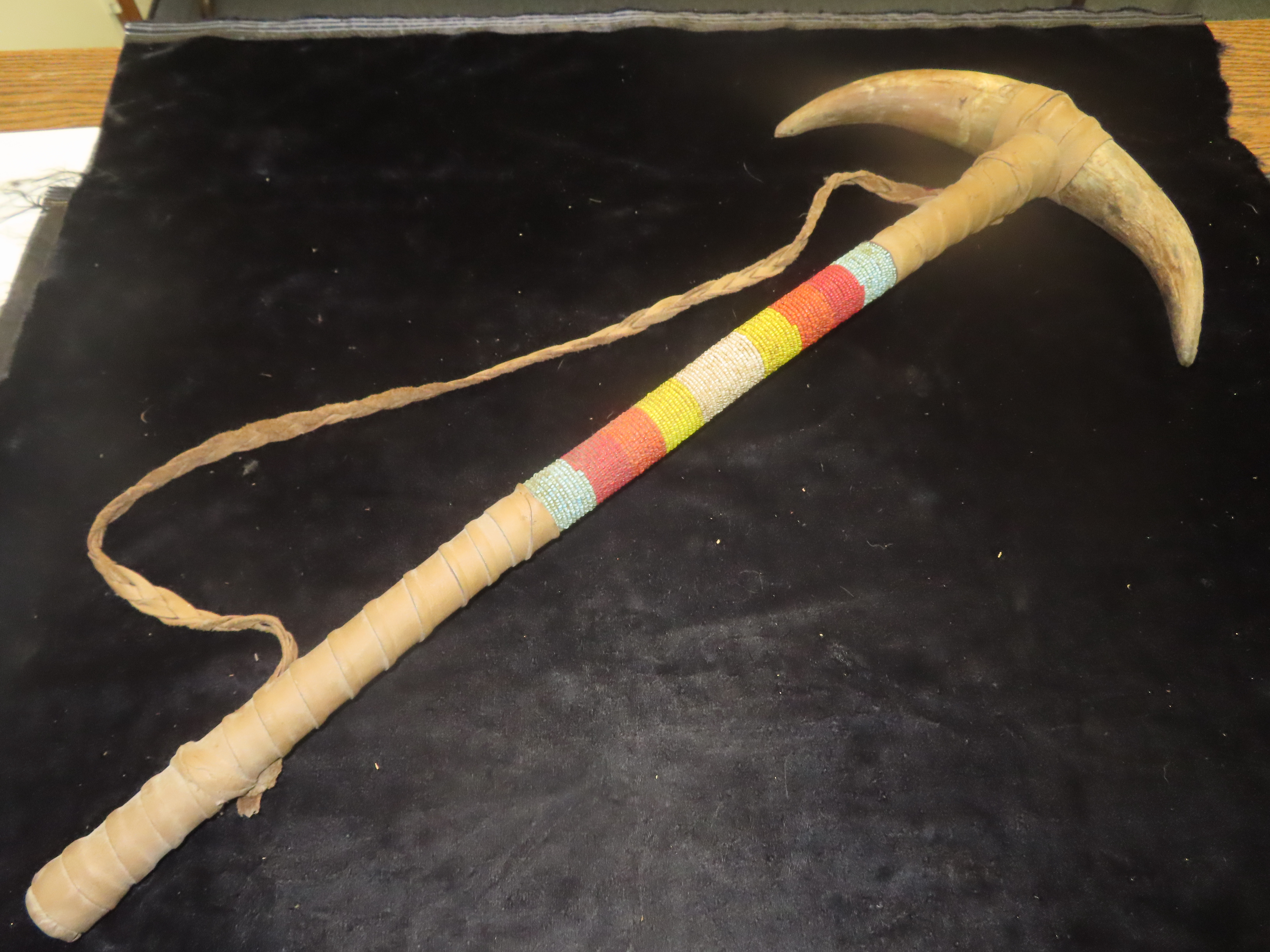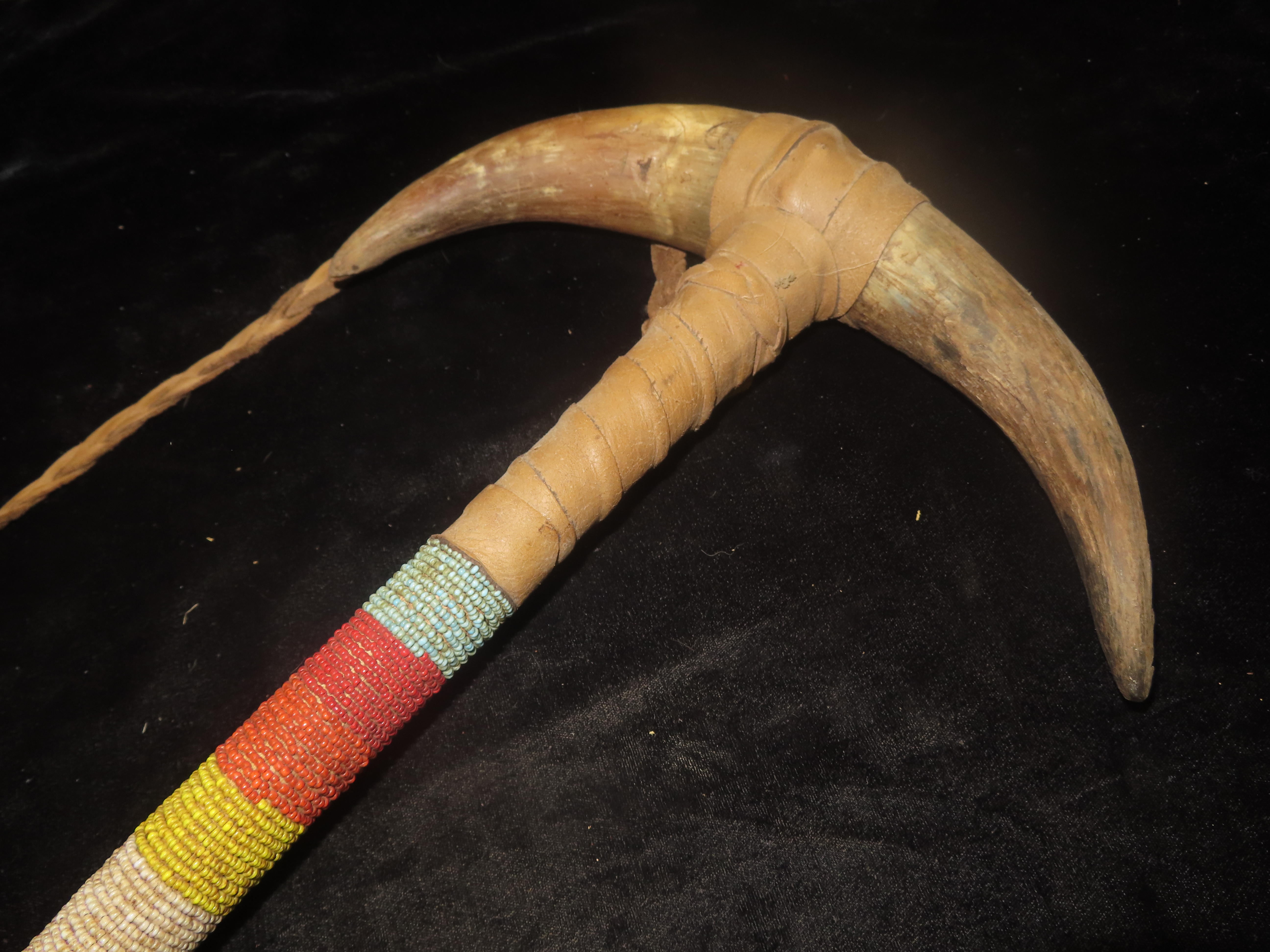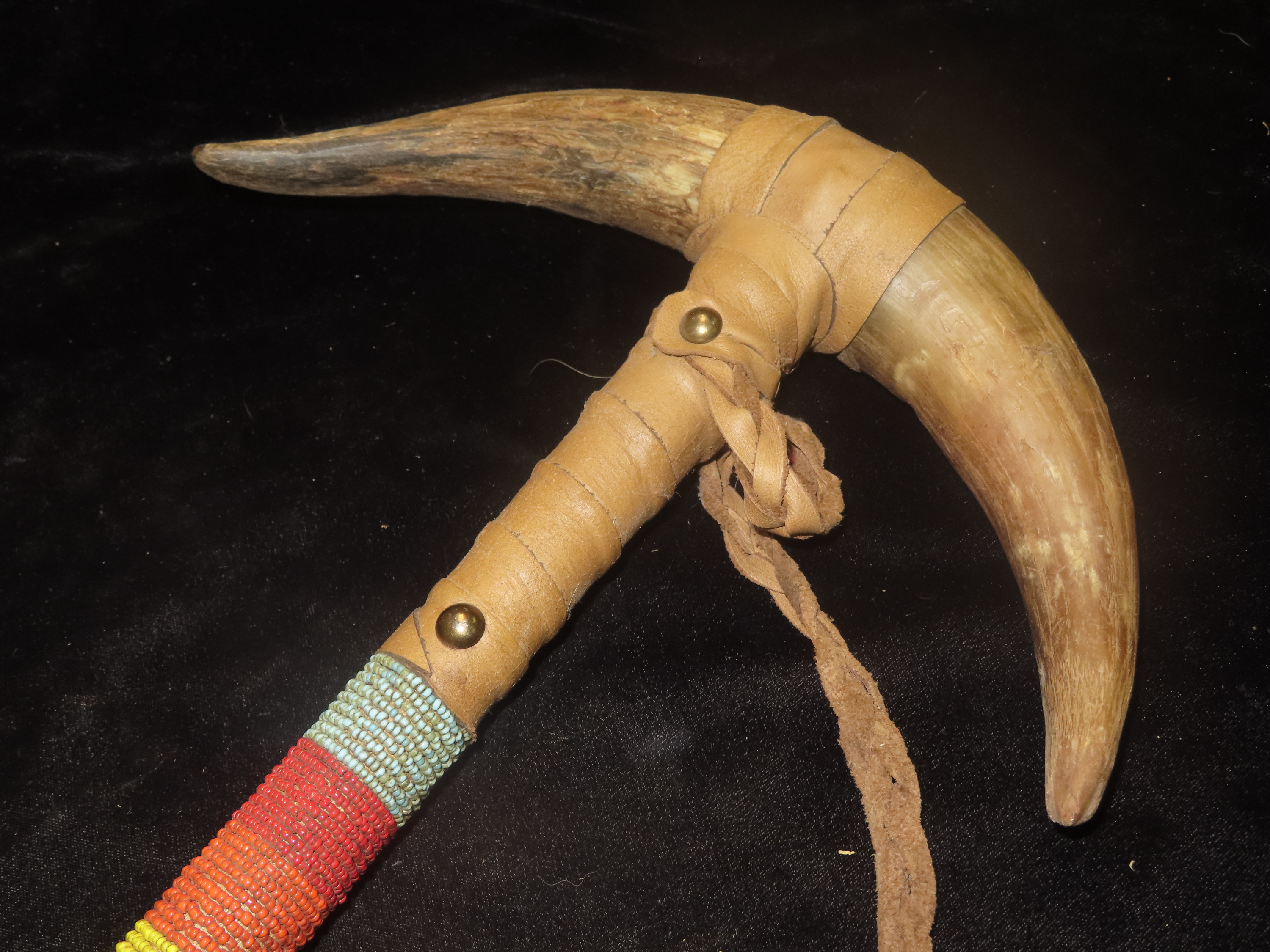 Antique Native American-style War Club- Leather wrapped, Steer horns, and Beadwork-Ceremonial, Decorative, Re-enactment