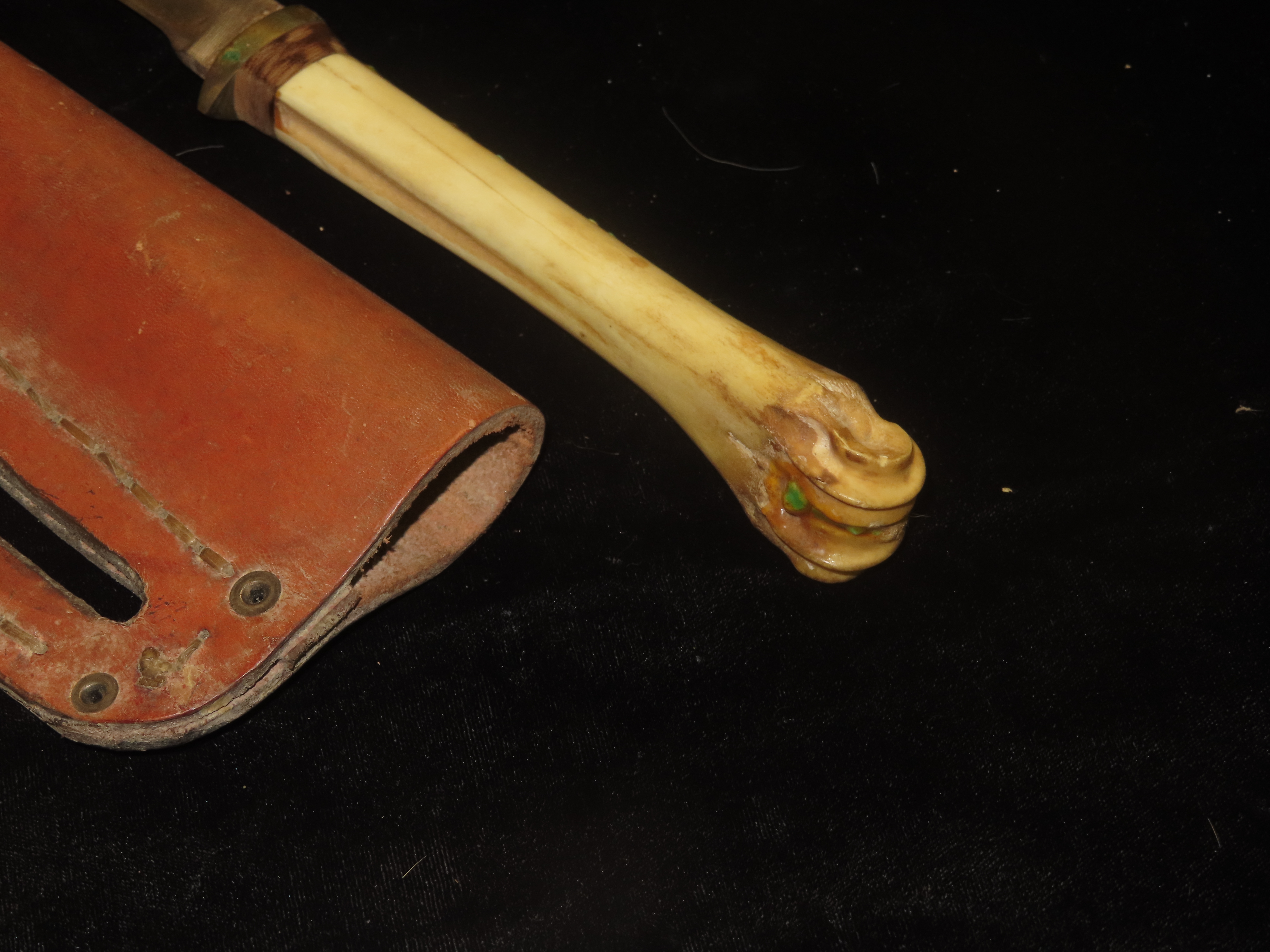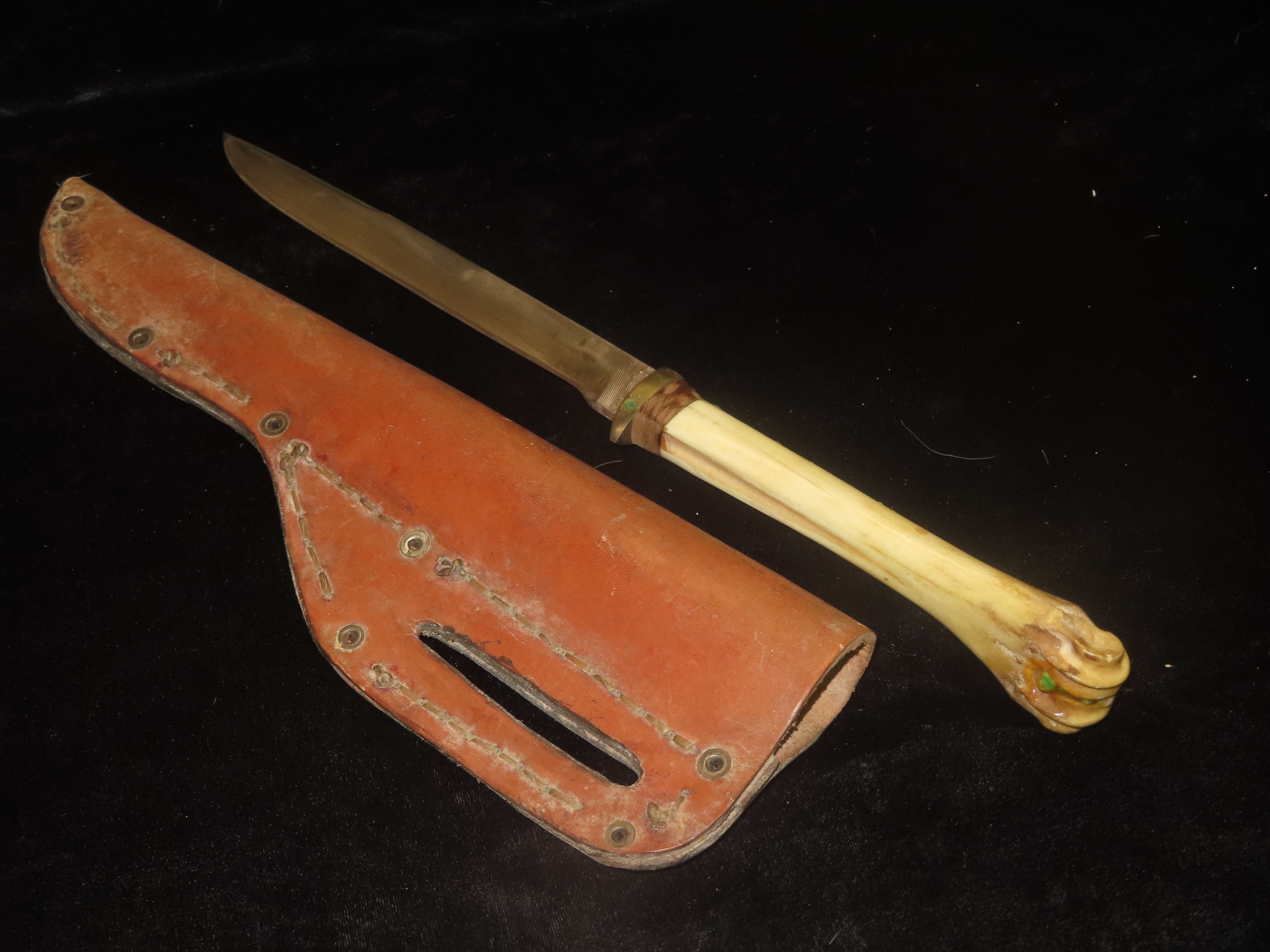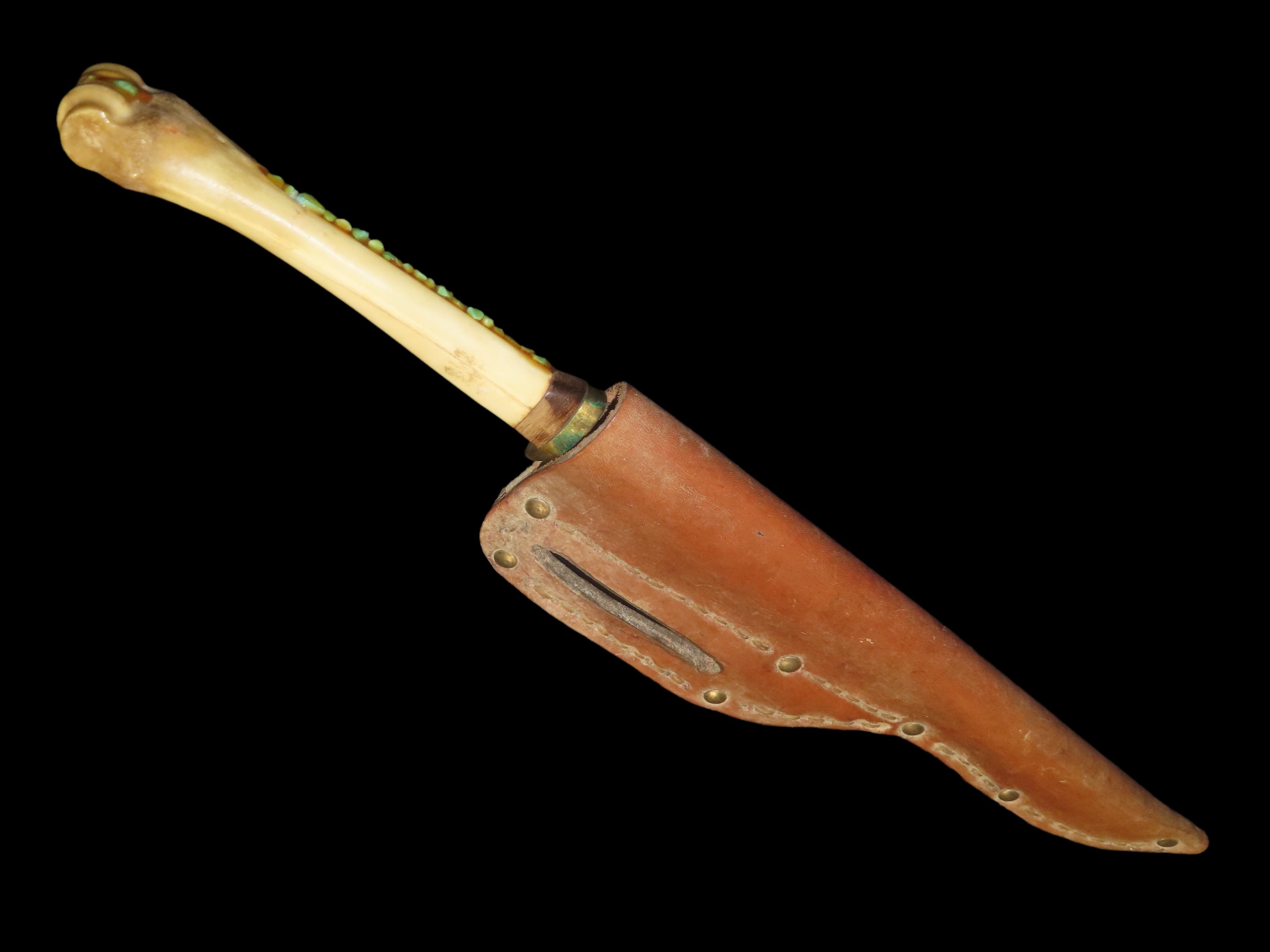Antique Handmade Long Knife Deer Leg Bone with Leather Sheath