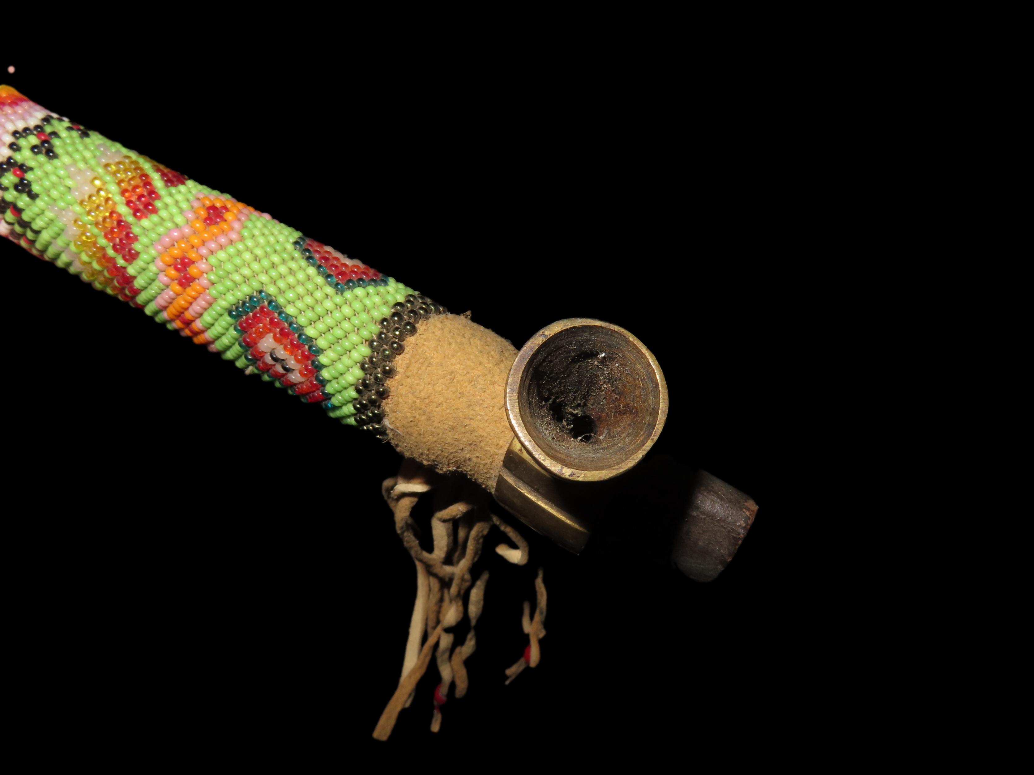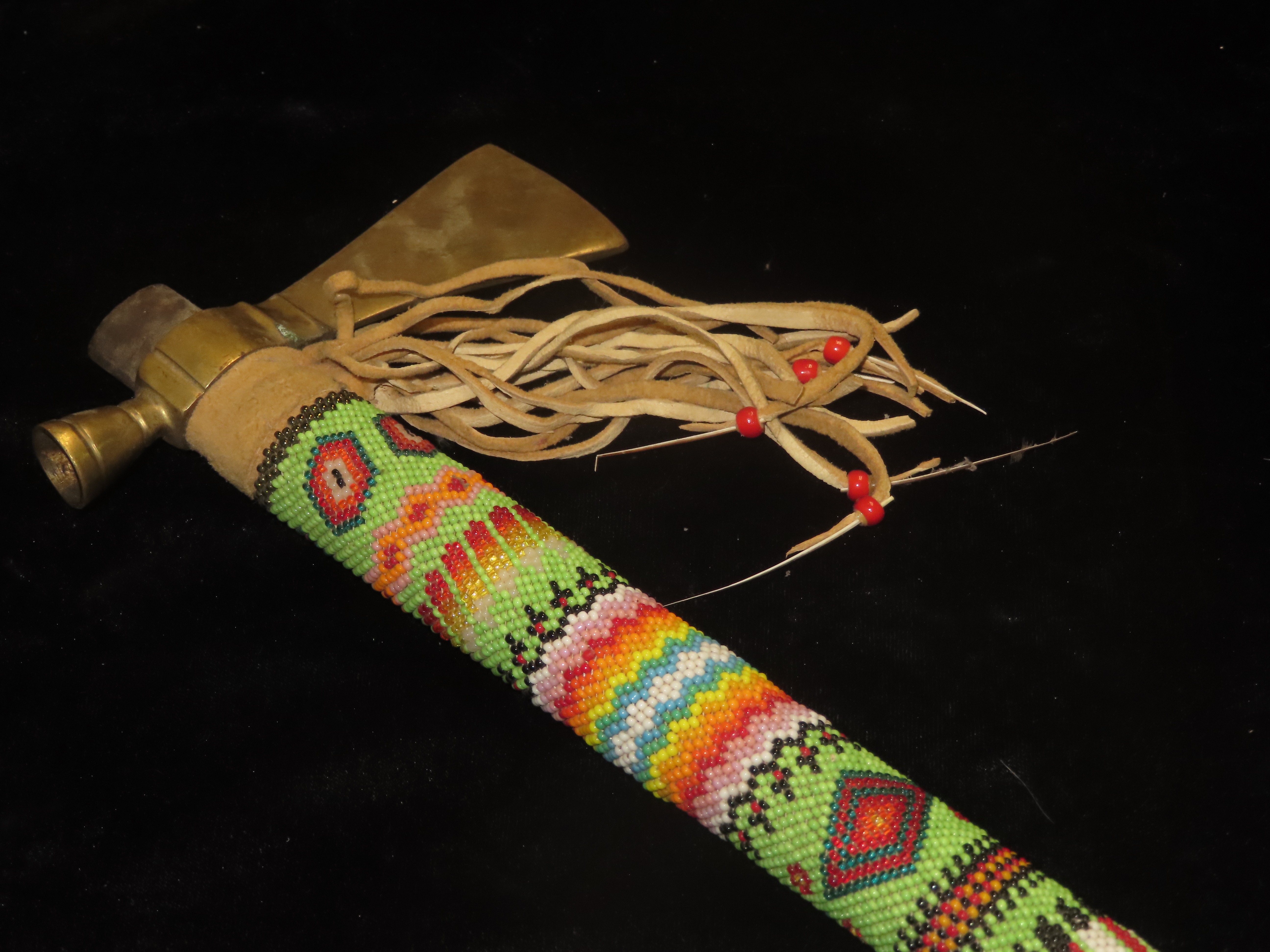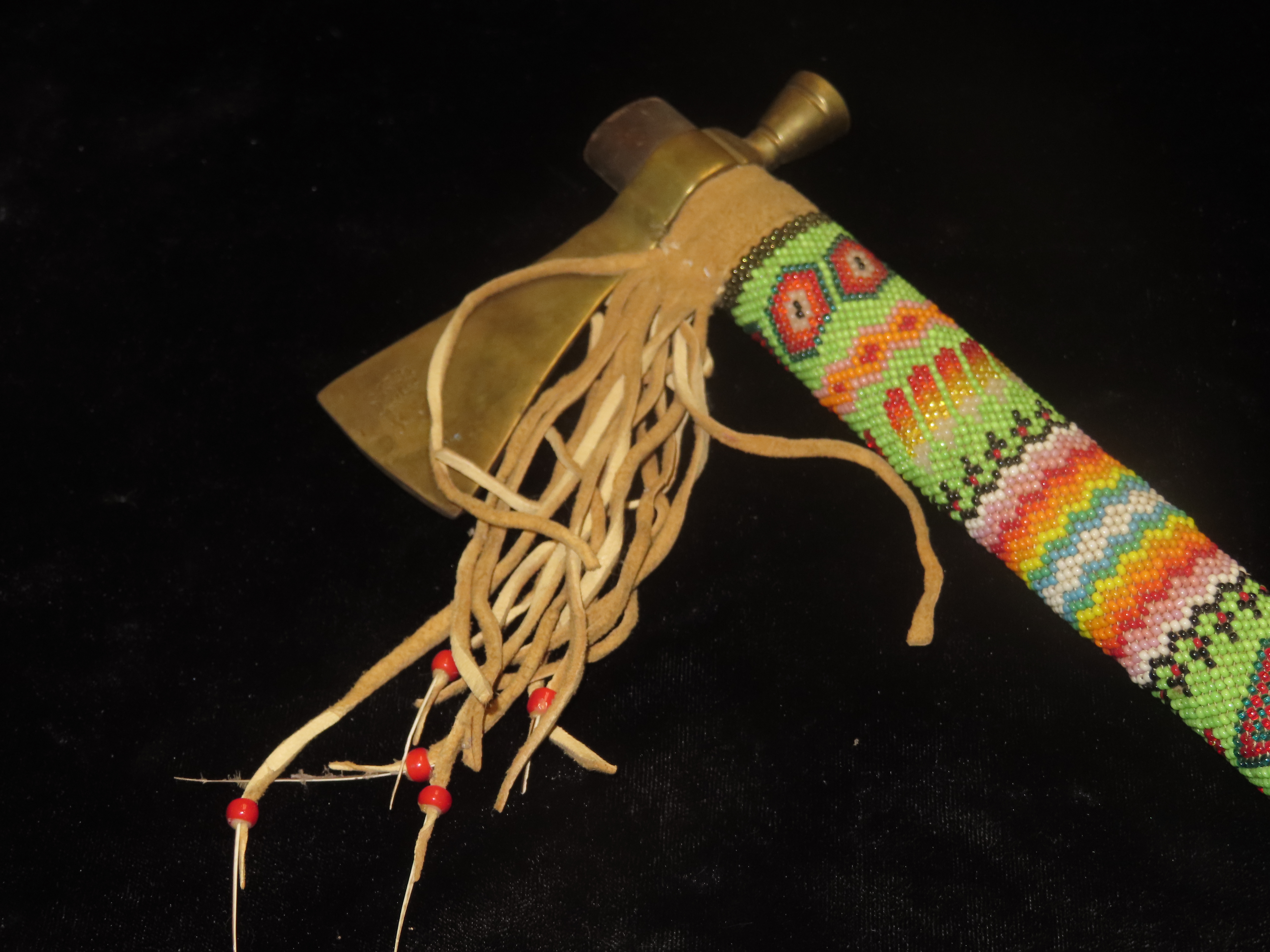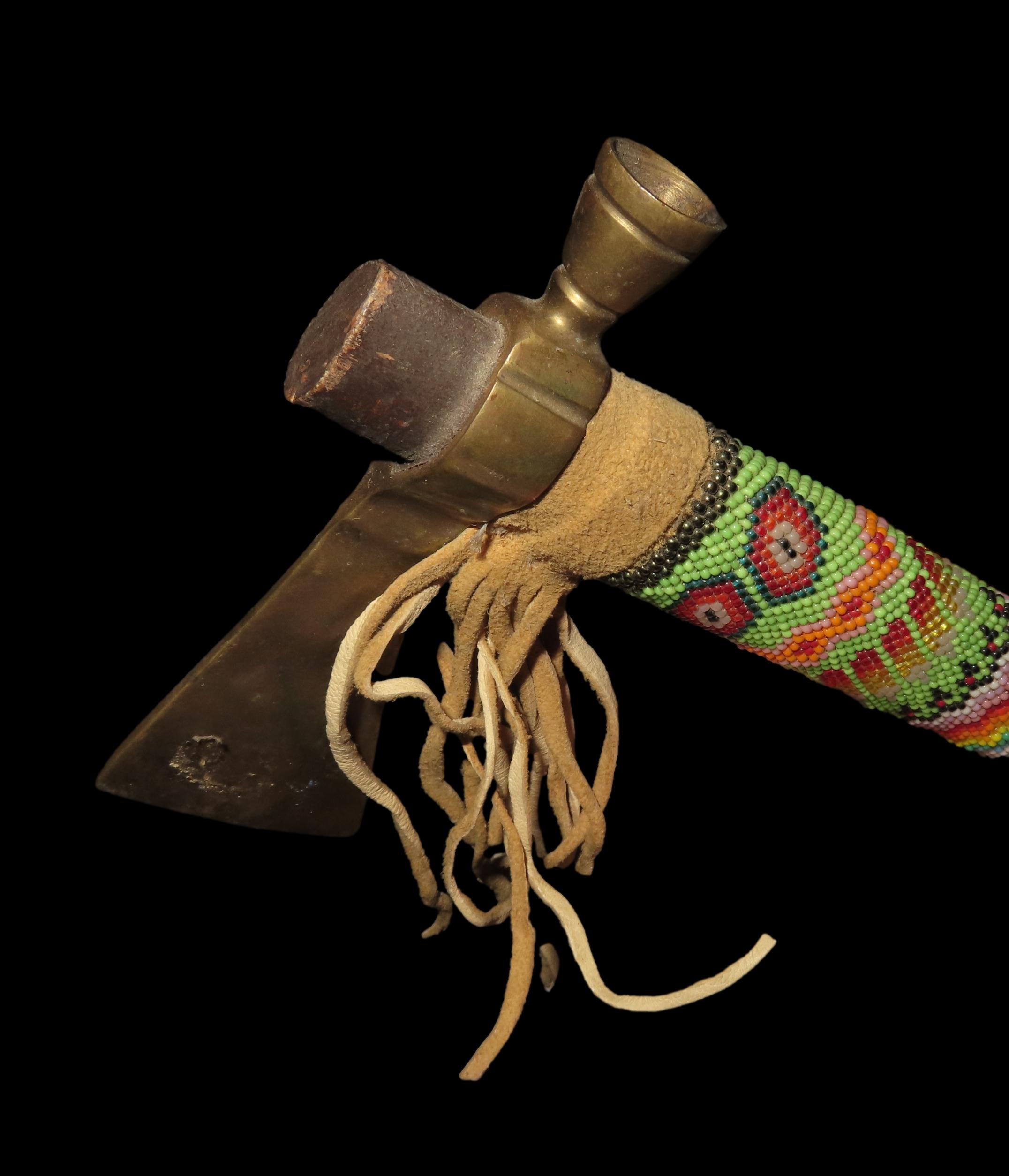 Tomahawk Pipe, Brass, Wood, and Buffalo Tooth- Intricately Beaded, Deer skin Fringe- Extraordinary Item
