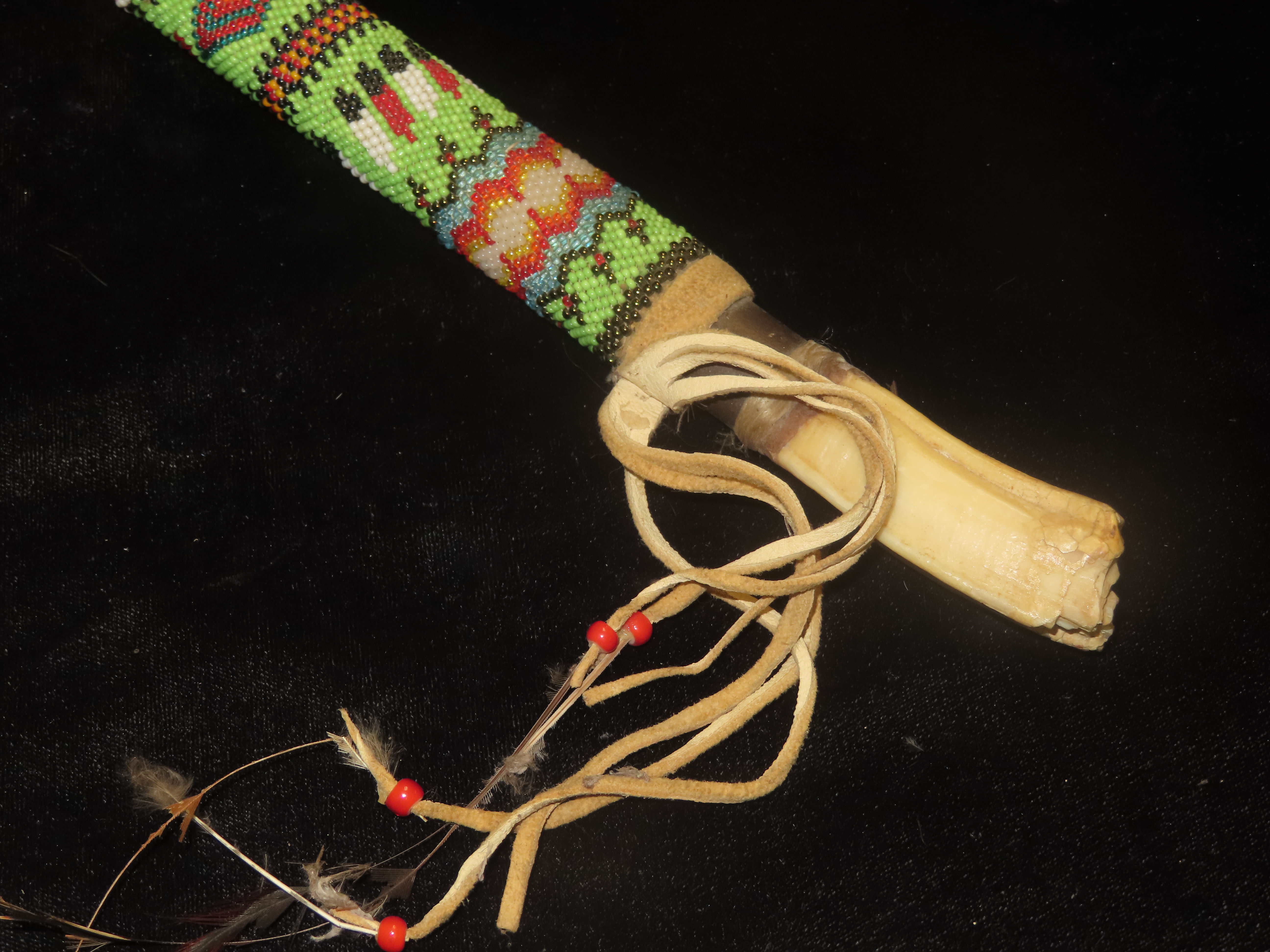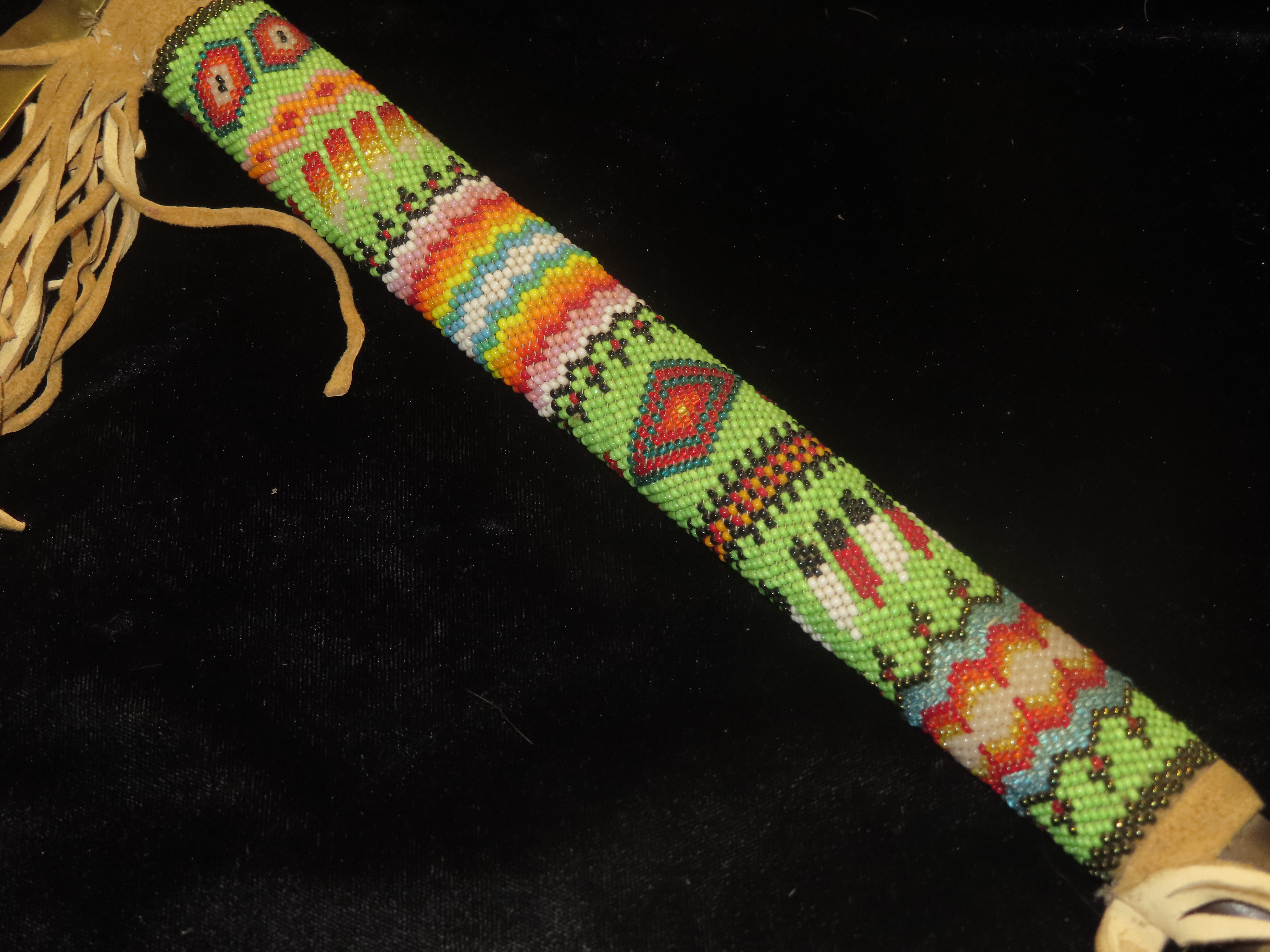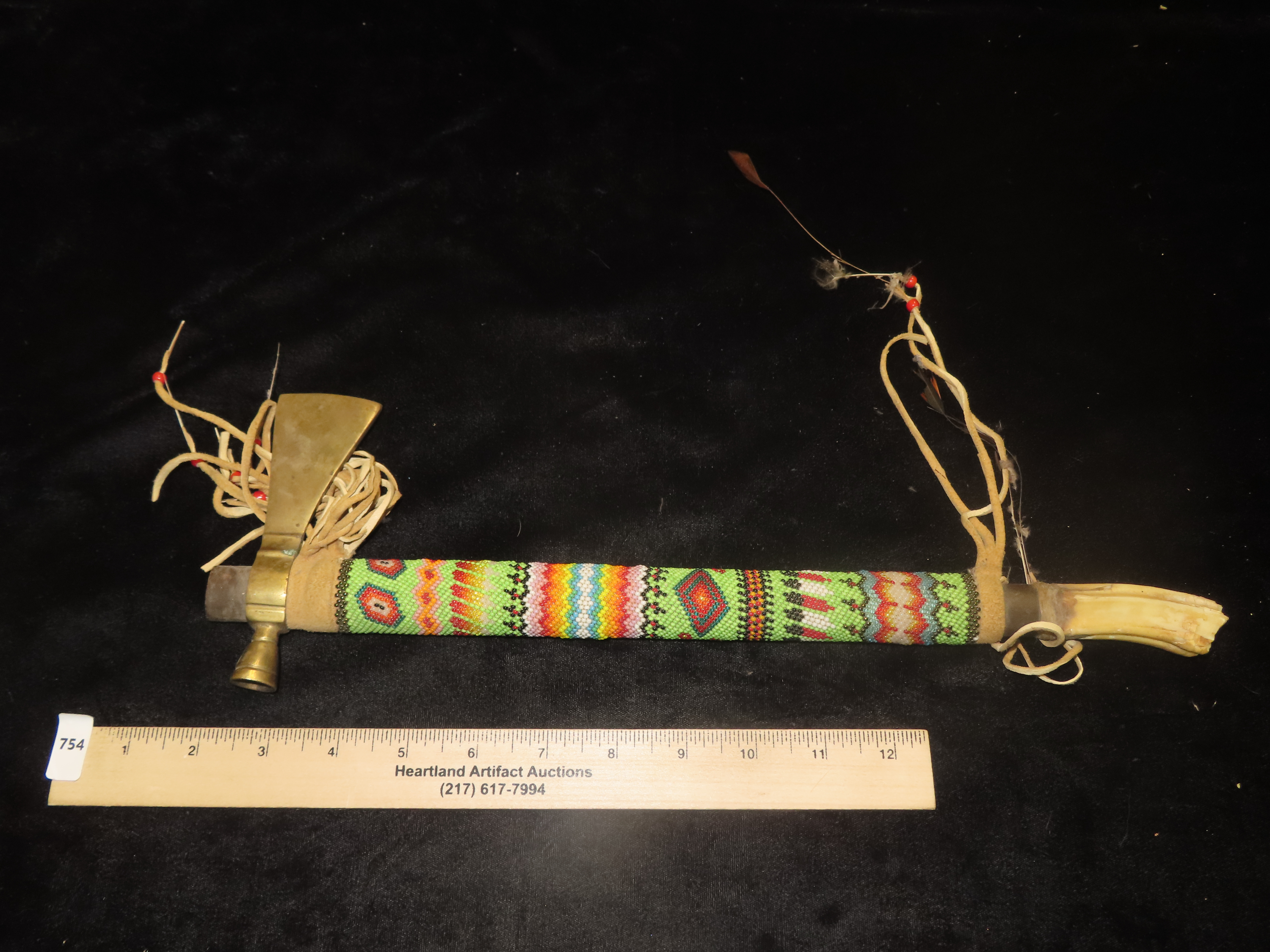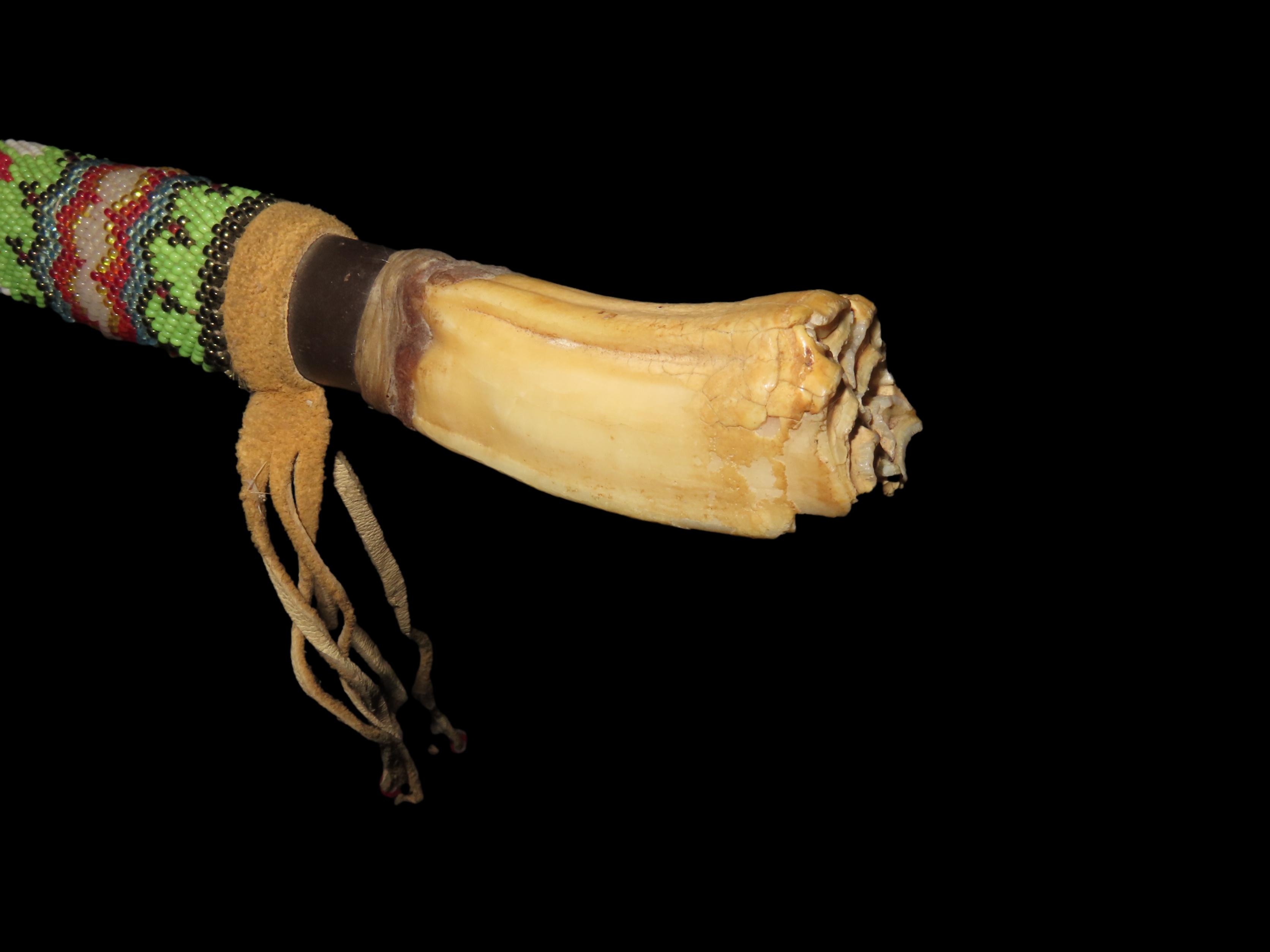 Tomahawk Pipe, Brass, Wood, and Buffalo Tooth- Intricately Beaded, Deer skin Fringe- Extraordinary Item