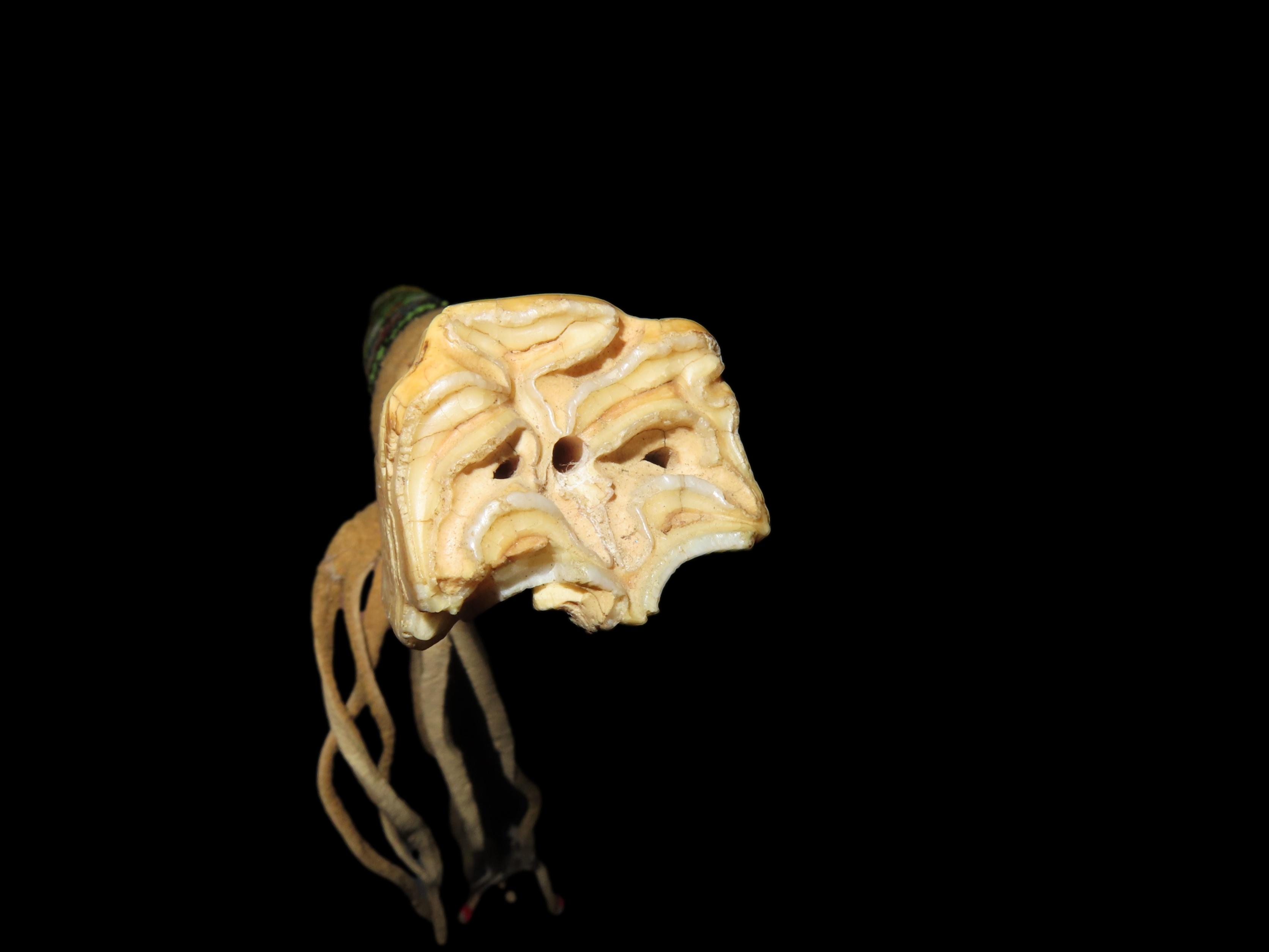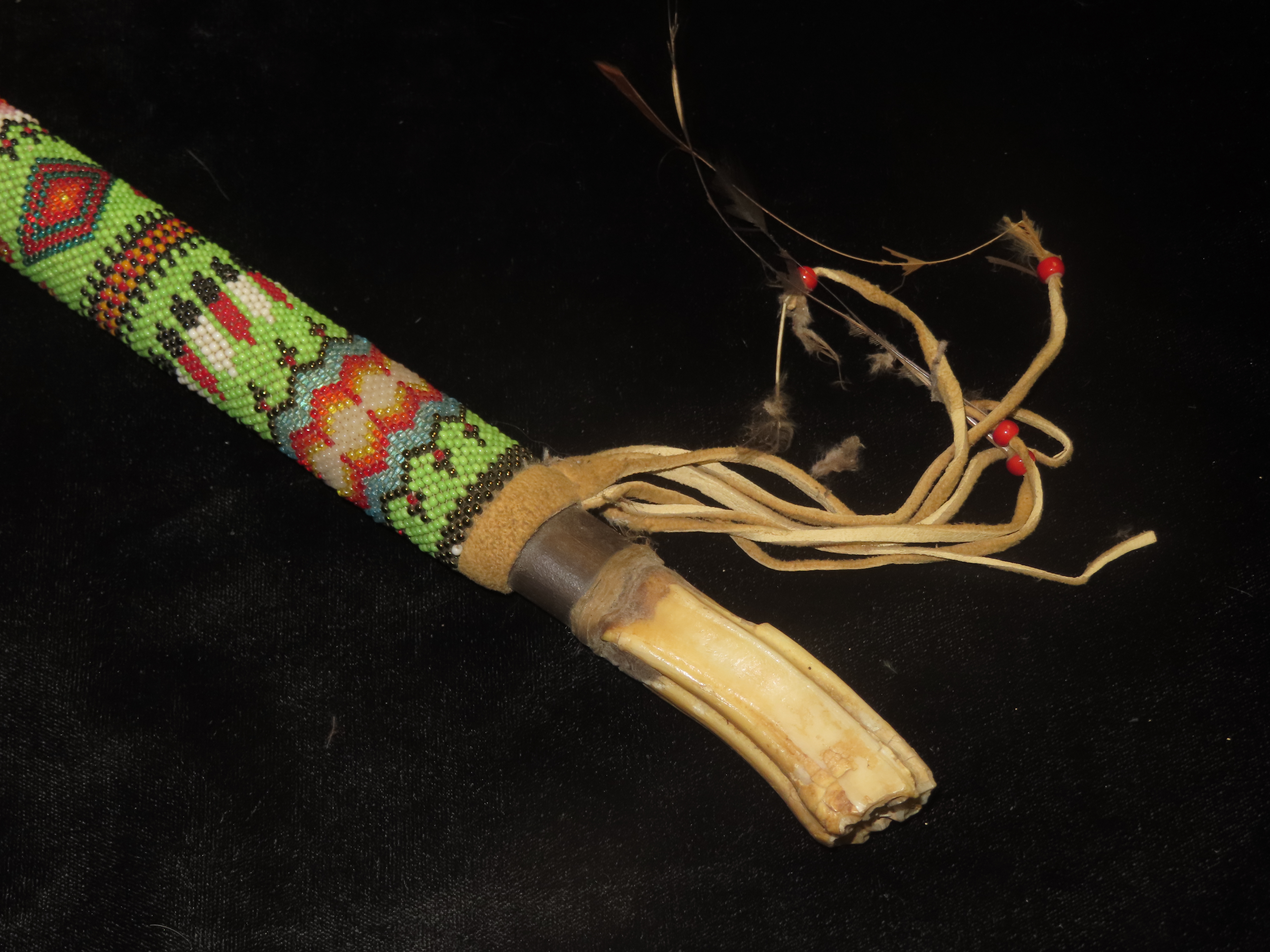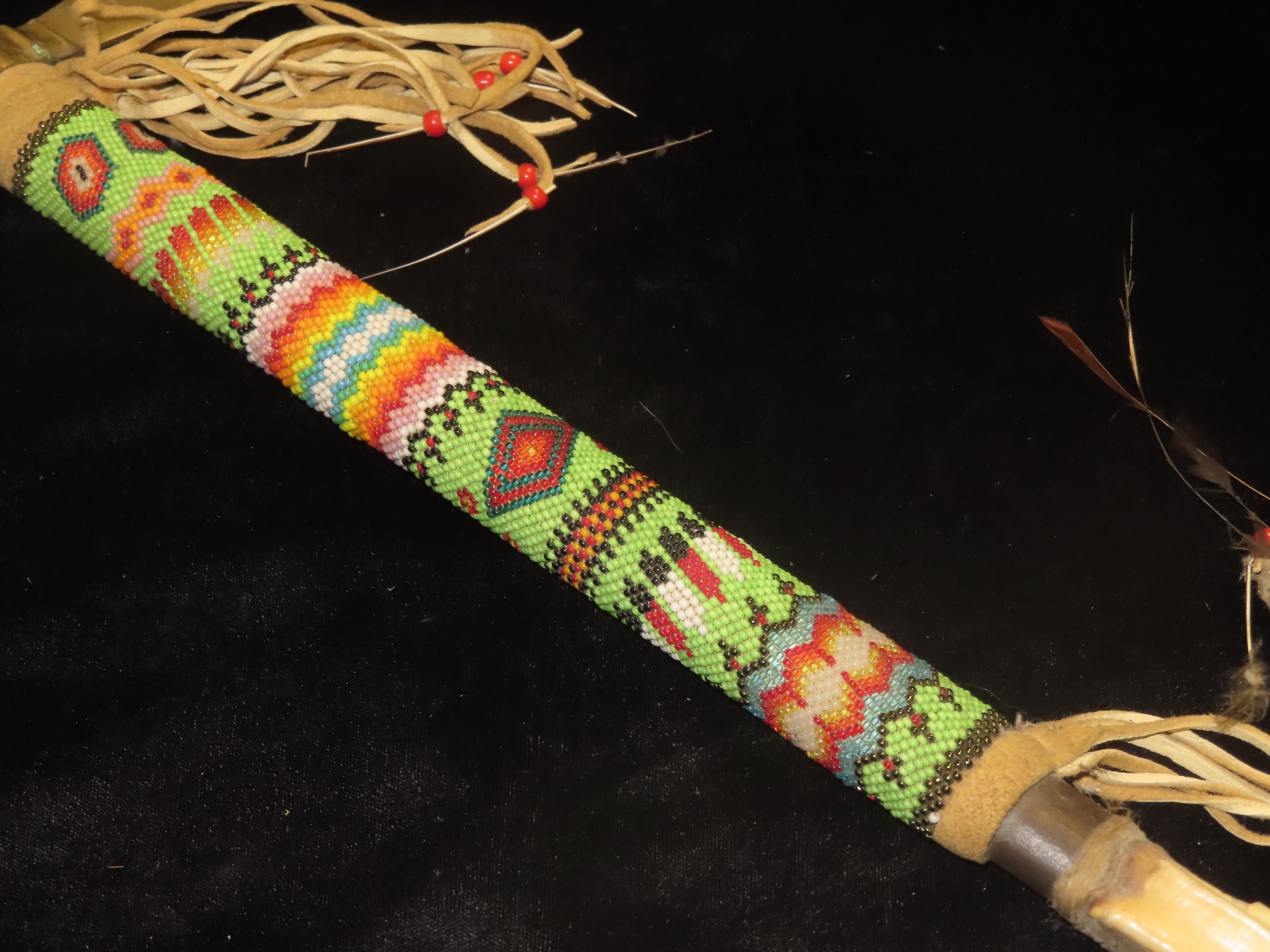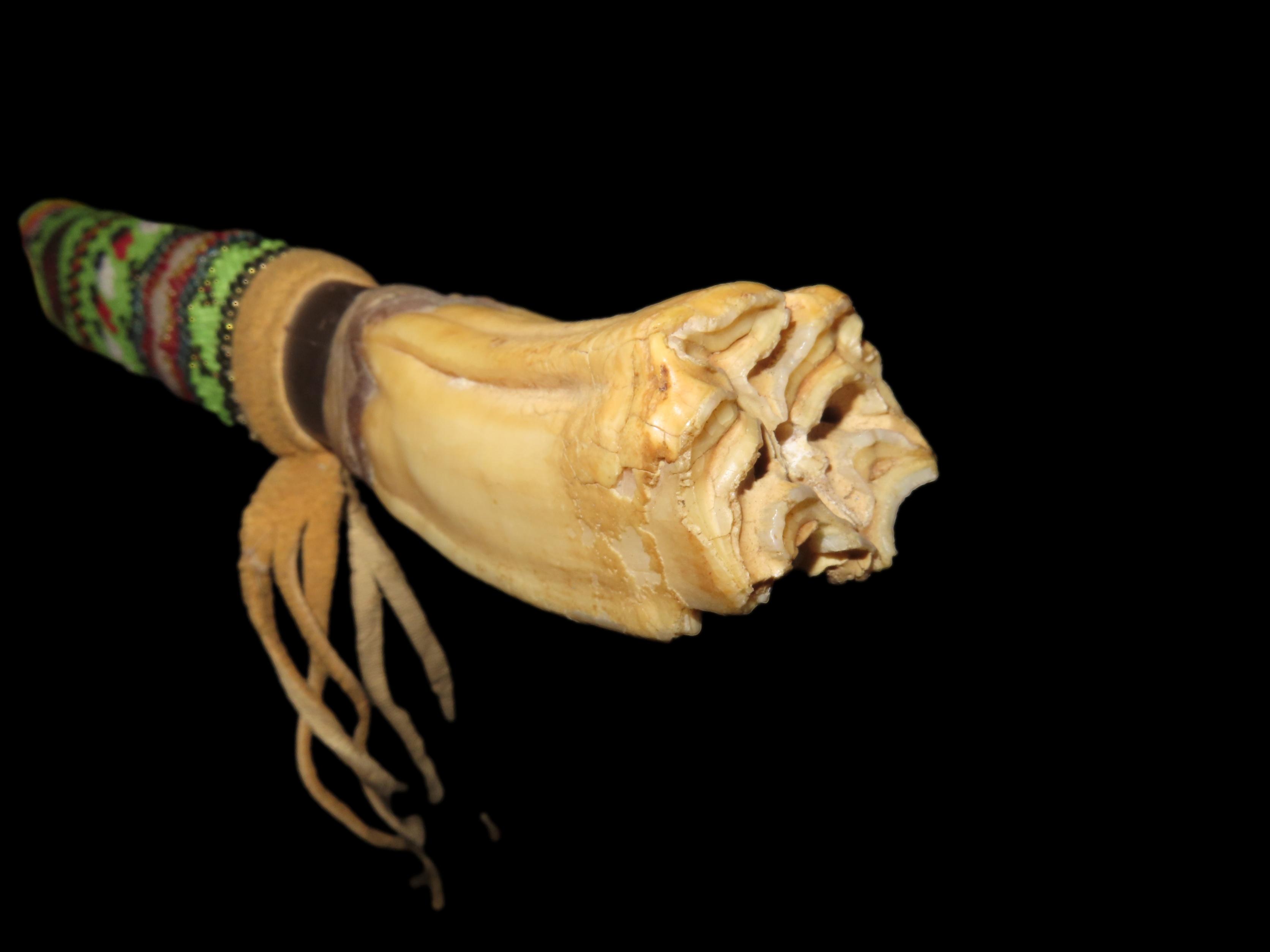 Tomahawk Pipe, Brass, Wood, and Buffalo Tooth- Intricately Beaded, Deer skin Fringe- Extraordinary Item