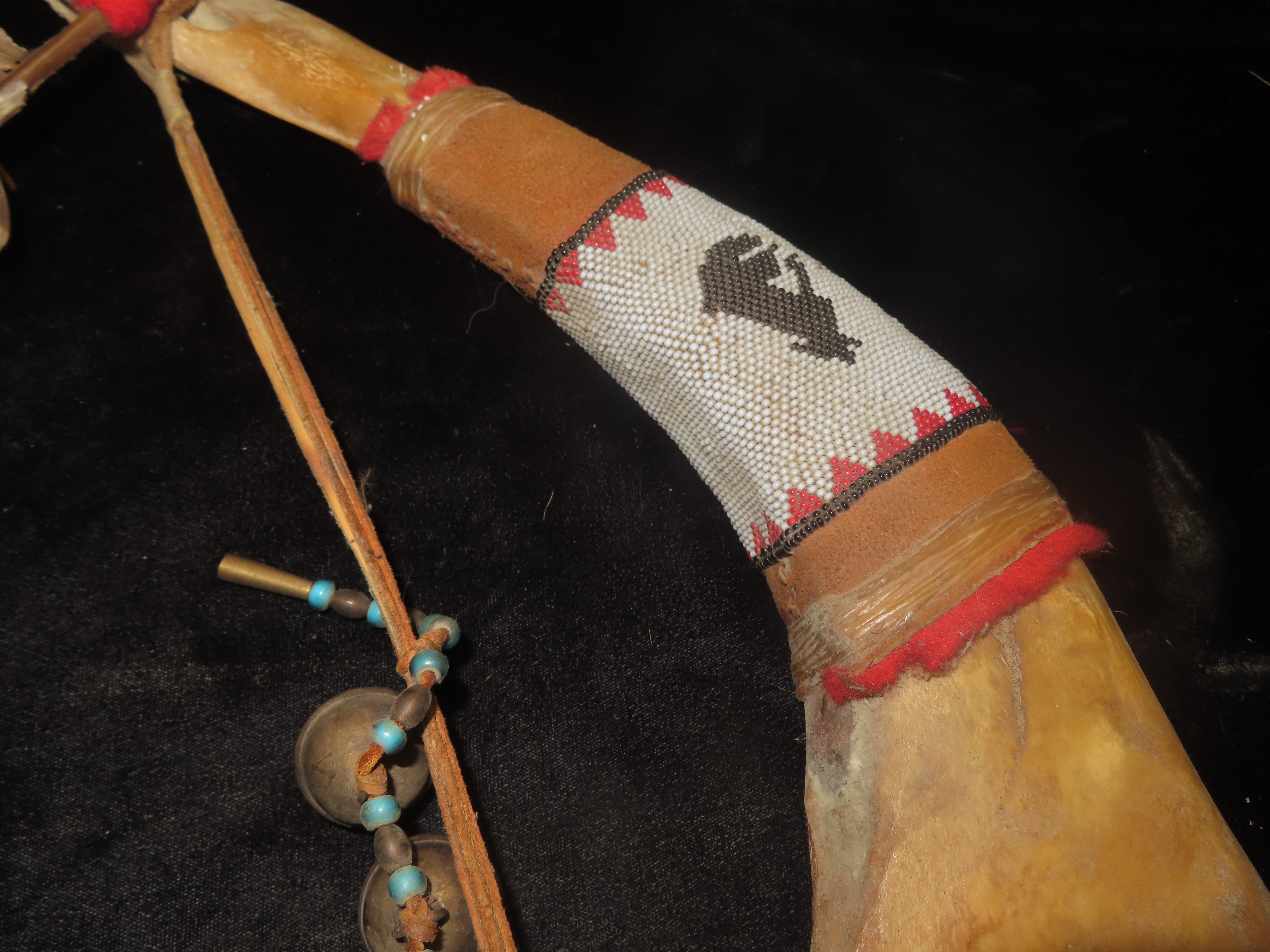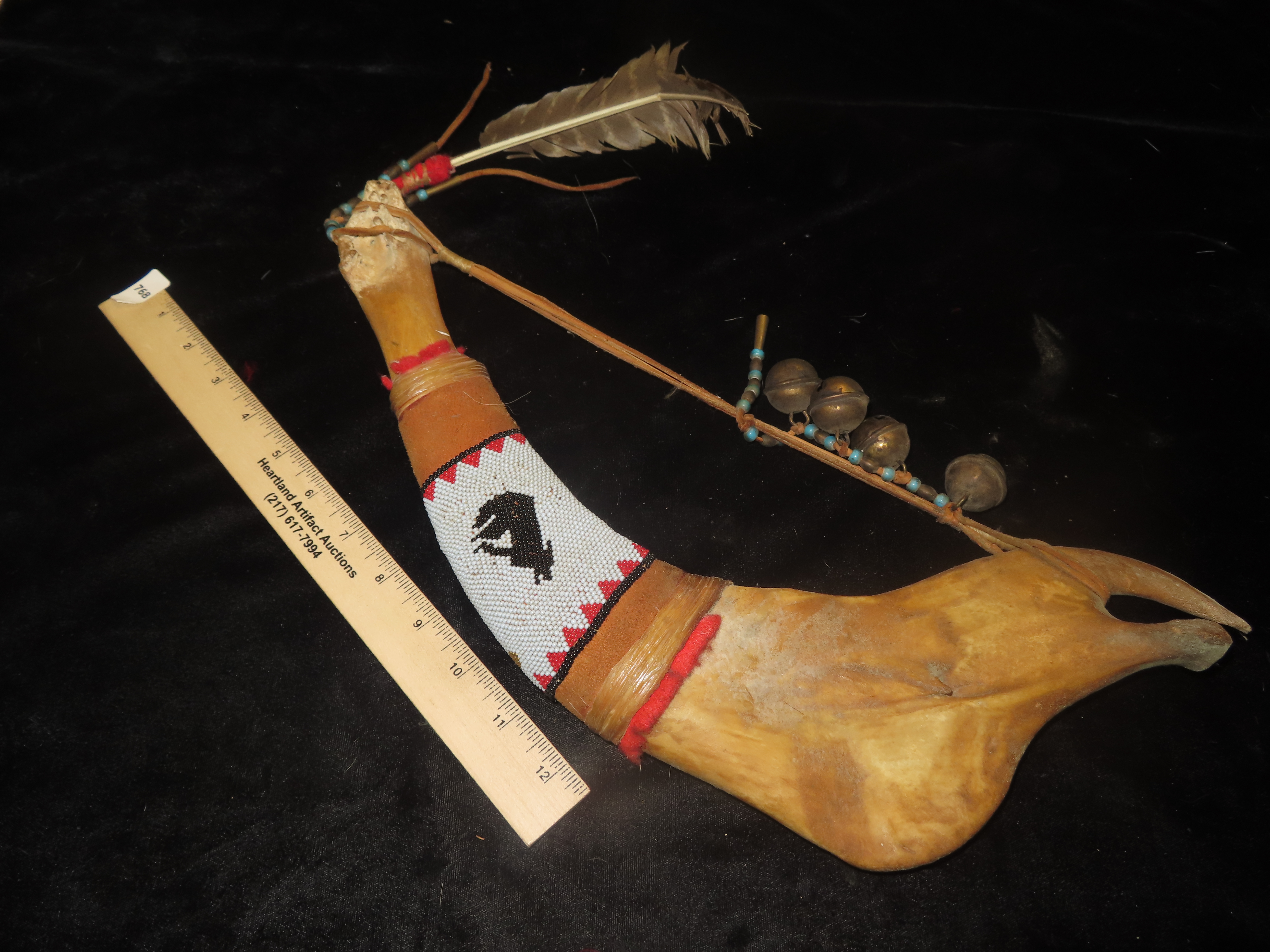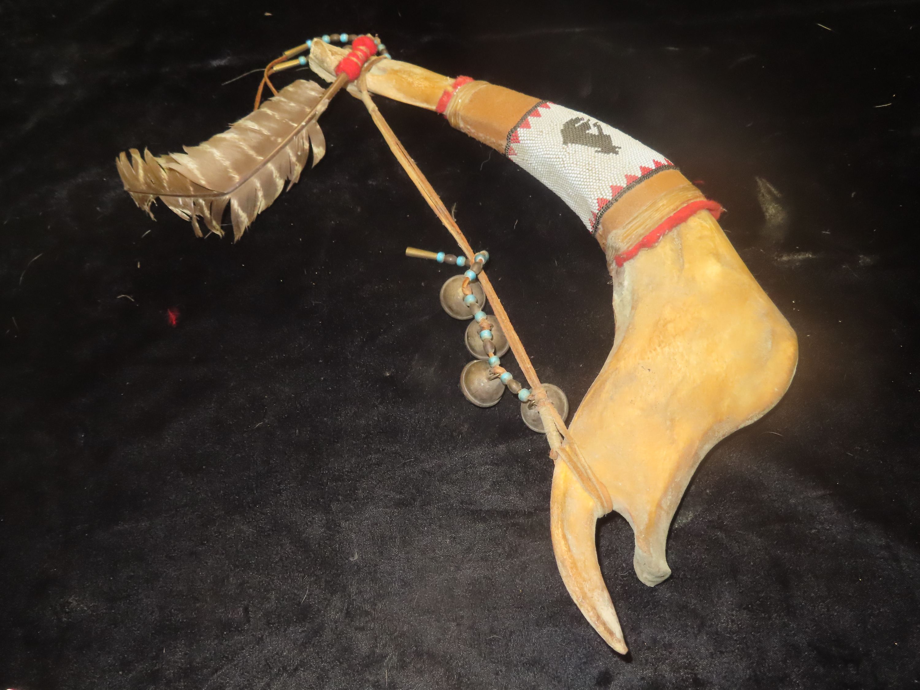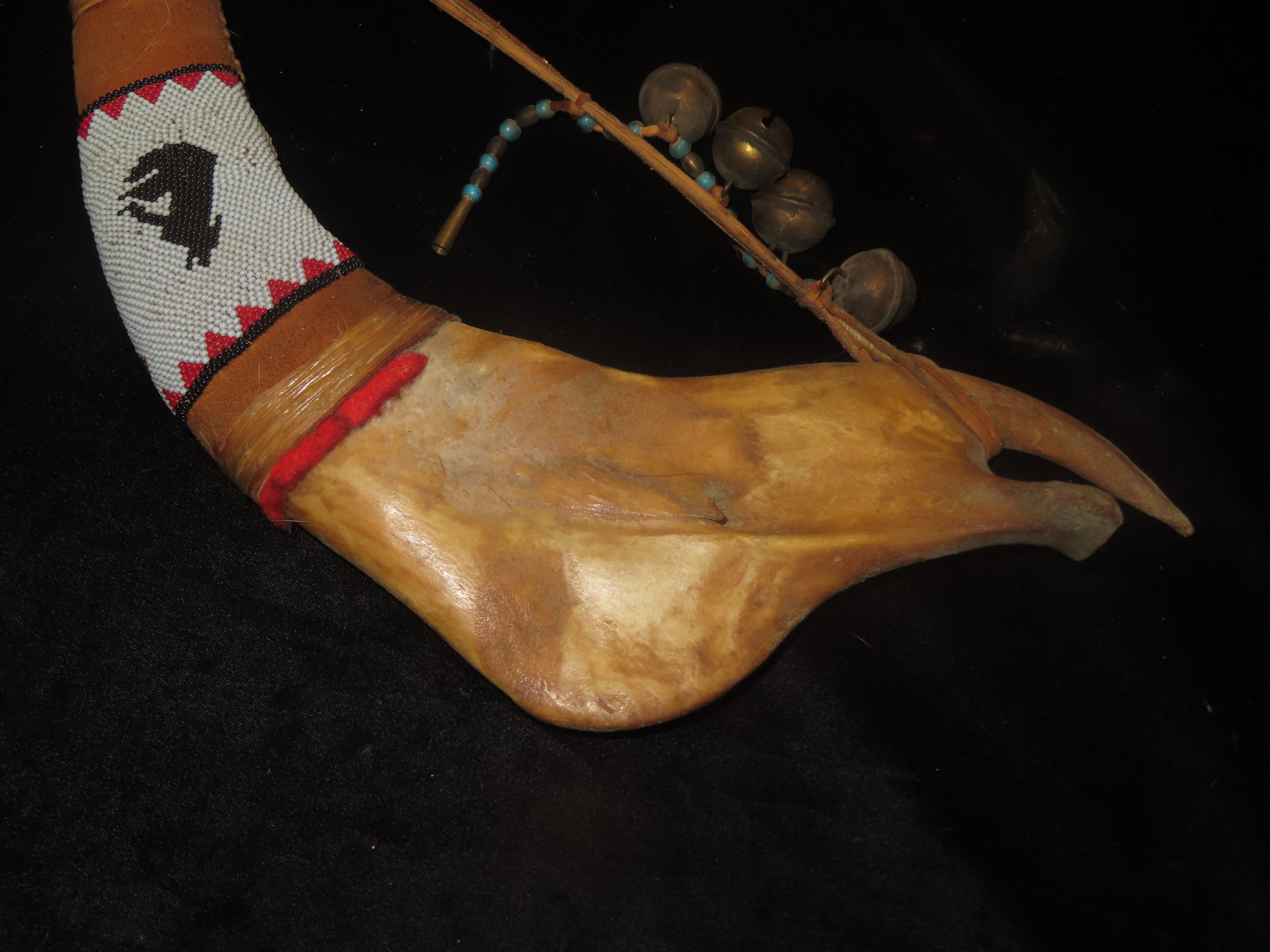 Antique Native American Style Buffalo Jaw Ceremonial Dance Rattle, Depicting Howling Wolf, Intricate Beadwork