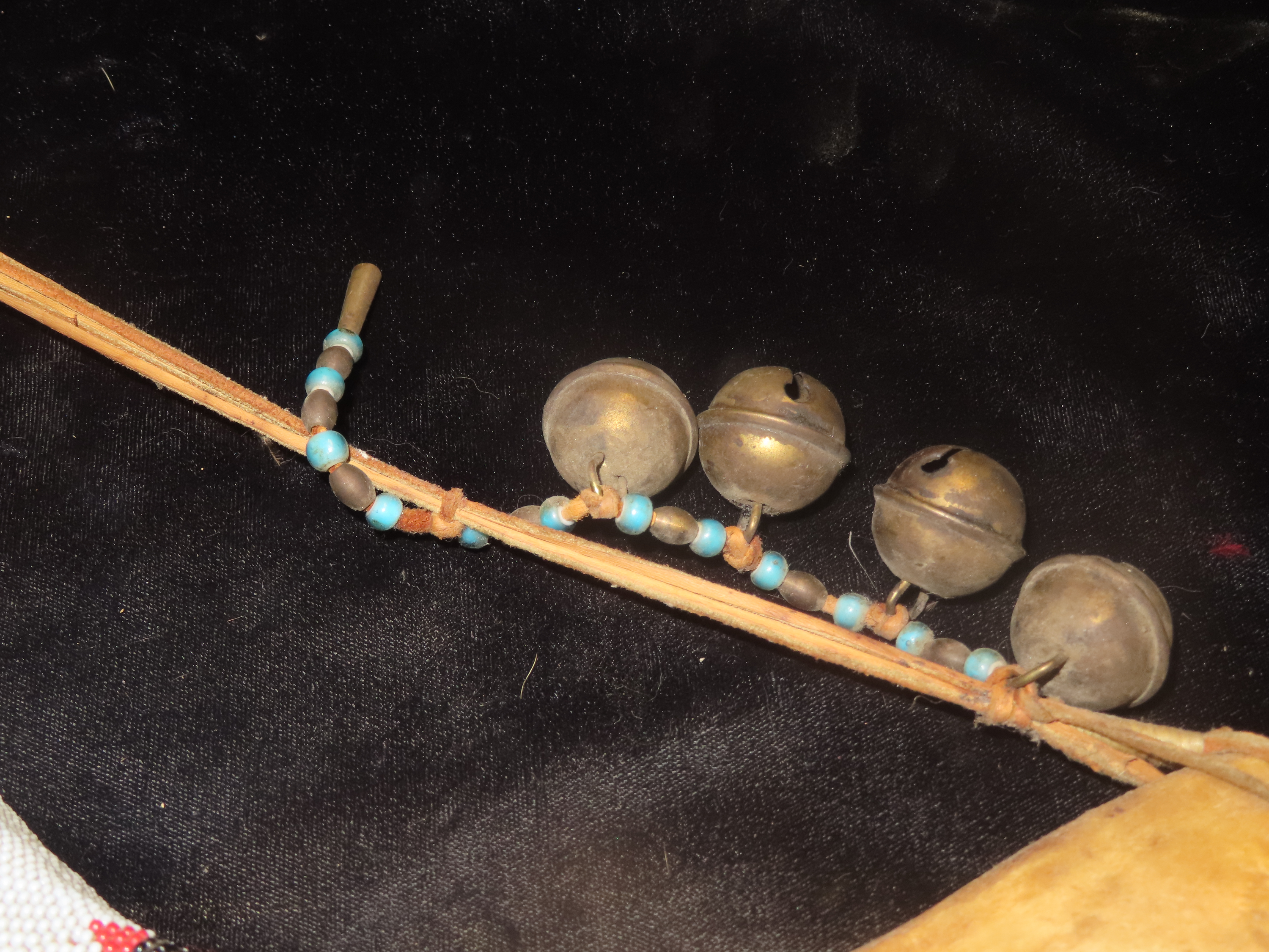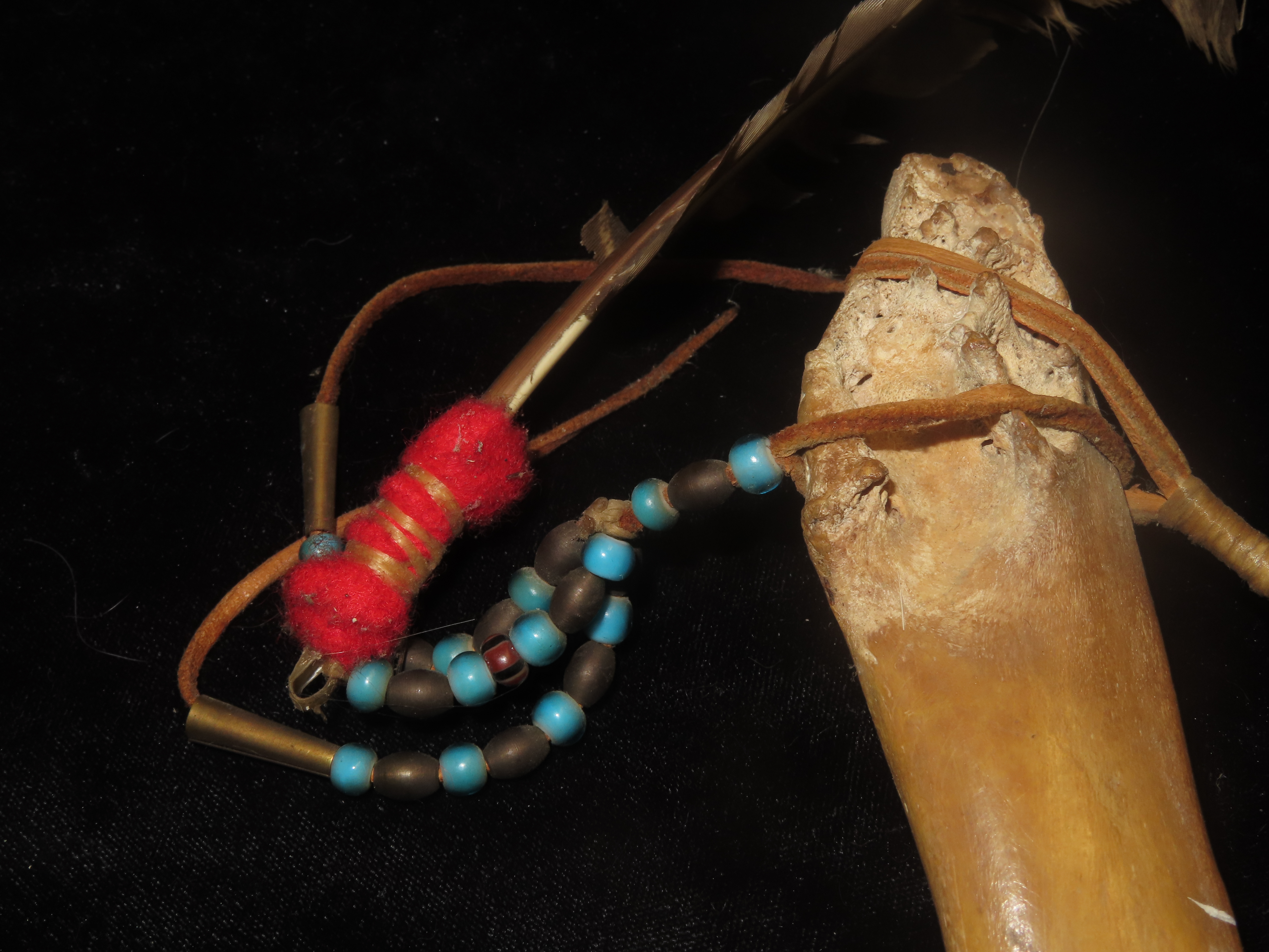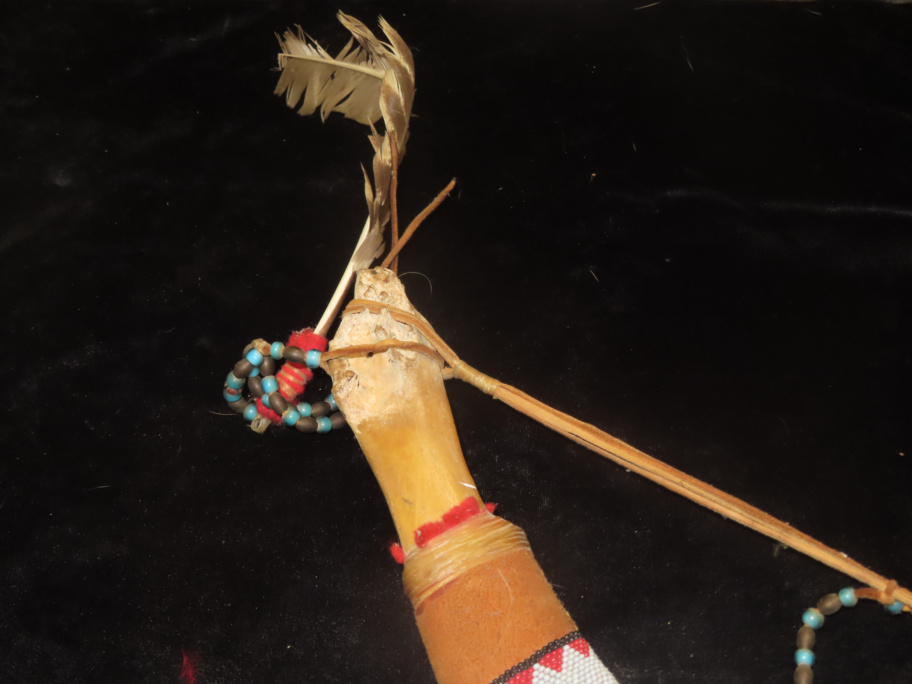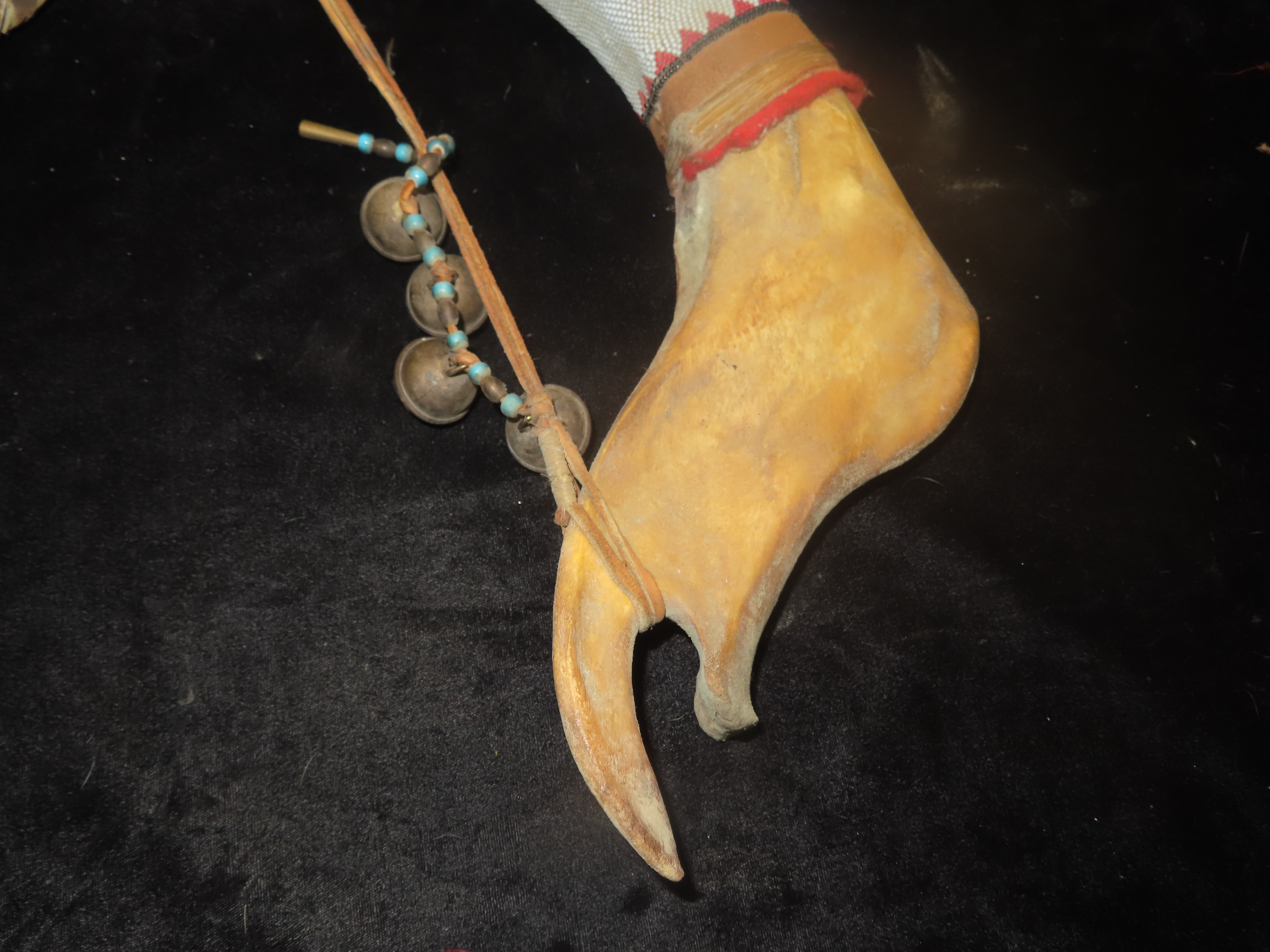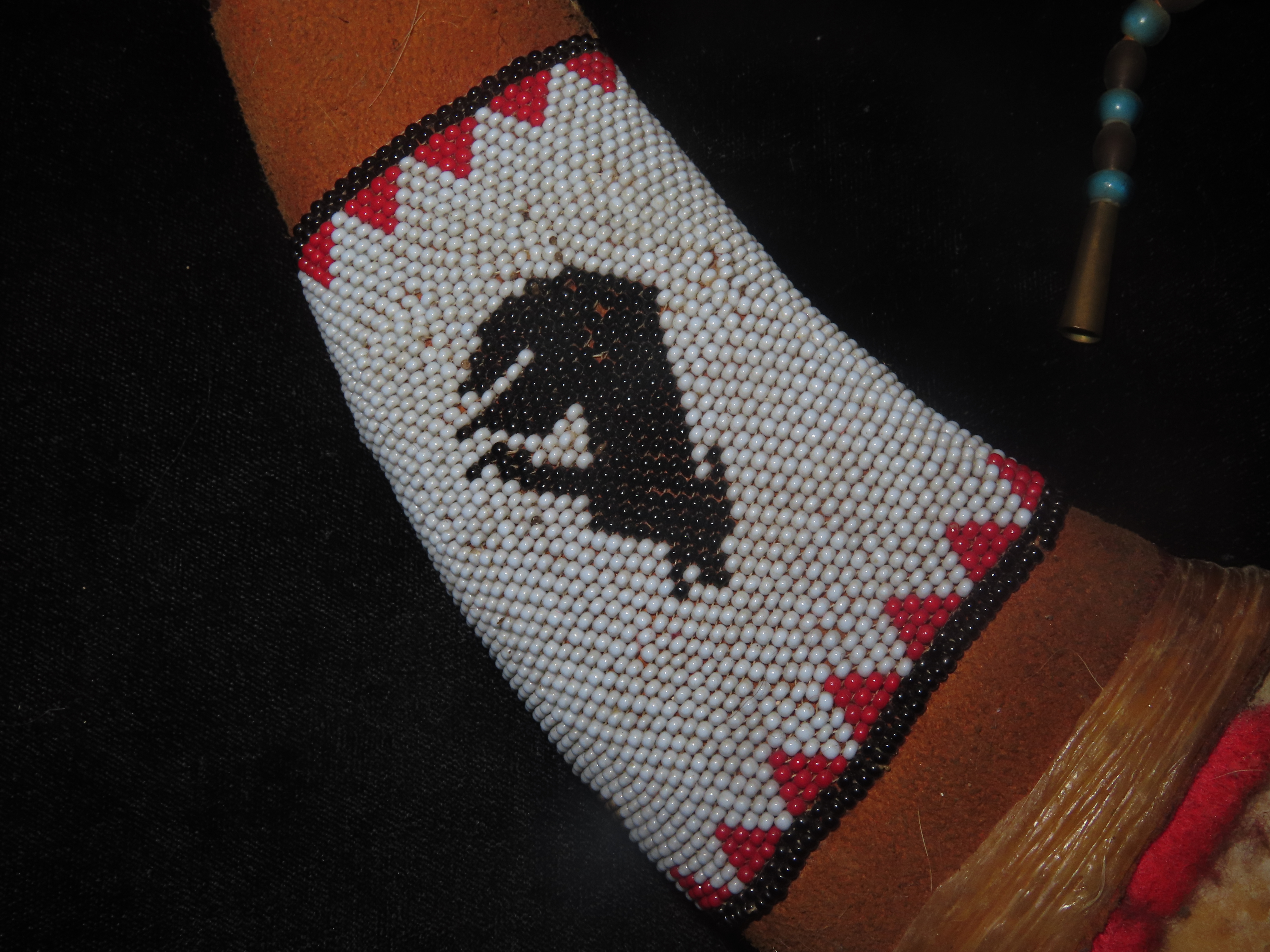 Antique Native American Style Buffalo Jaw Ceremonial Dance Rattle, Depicting Howling Wolf, Intricate Beadwork
