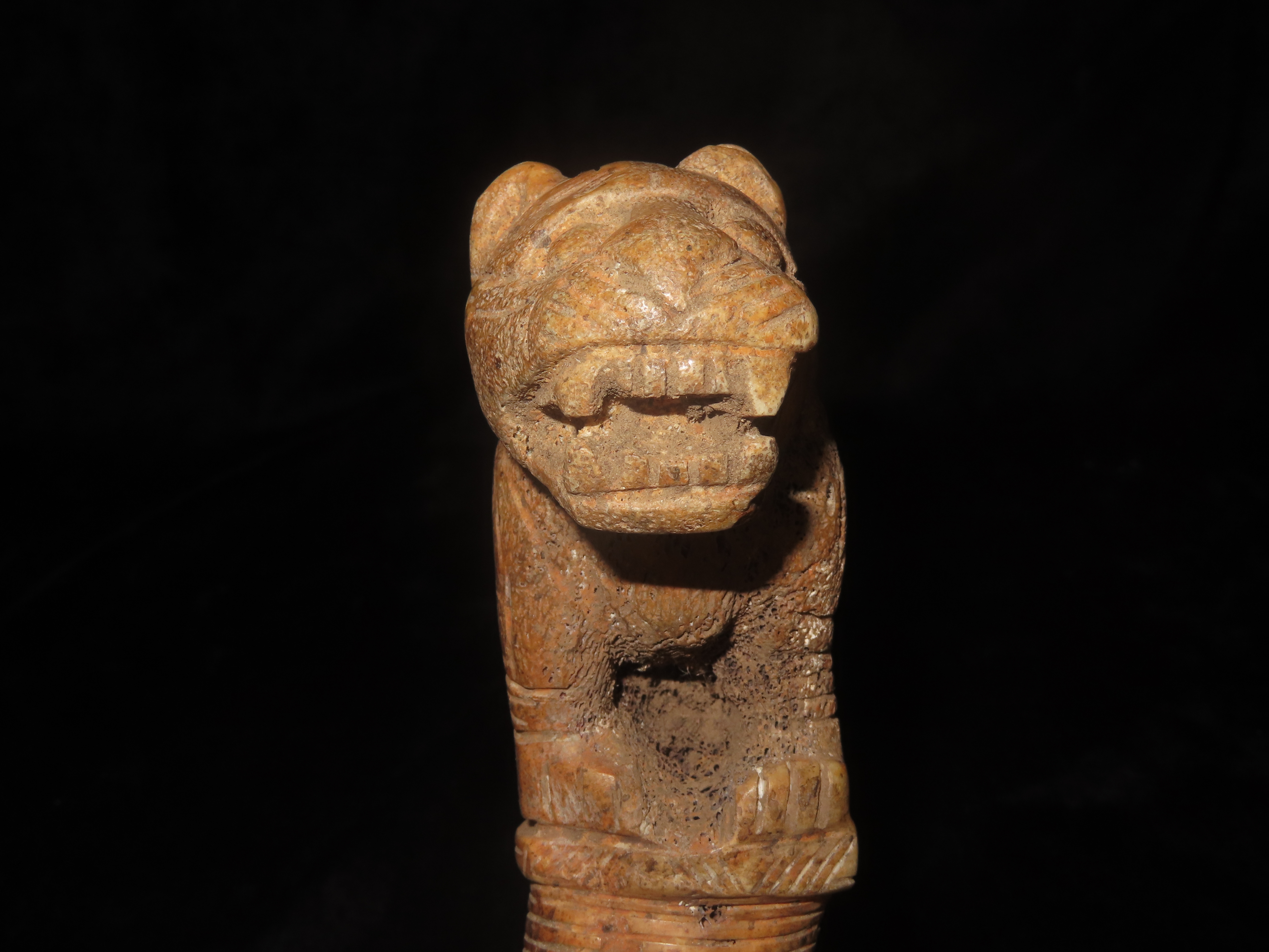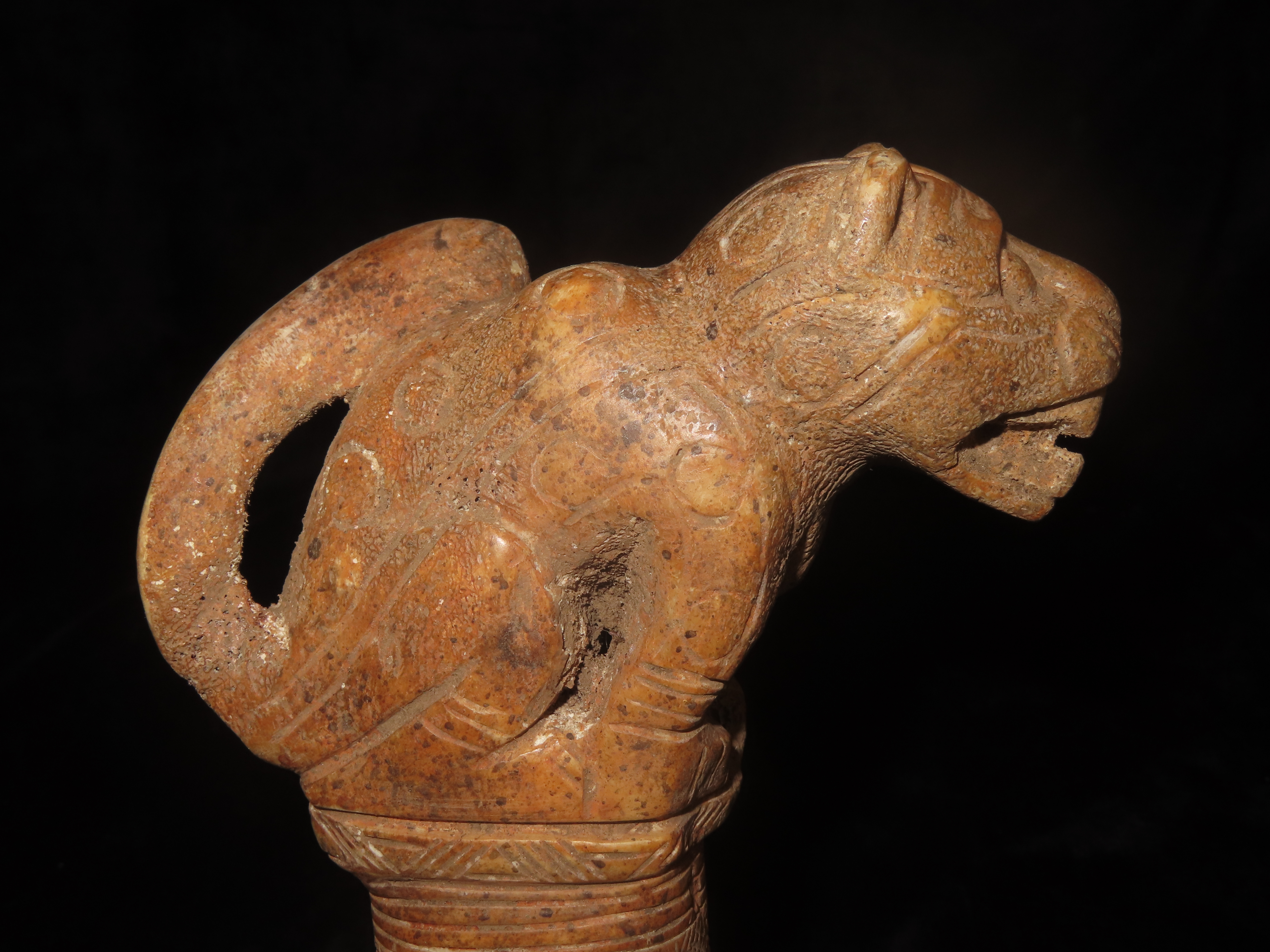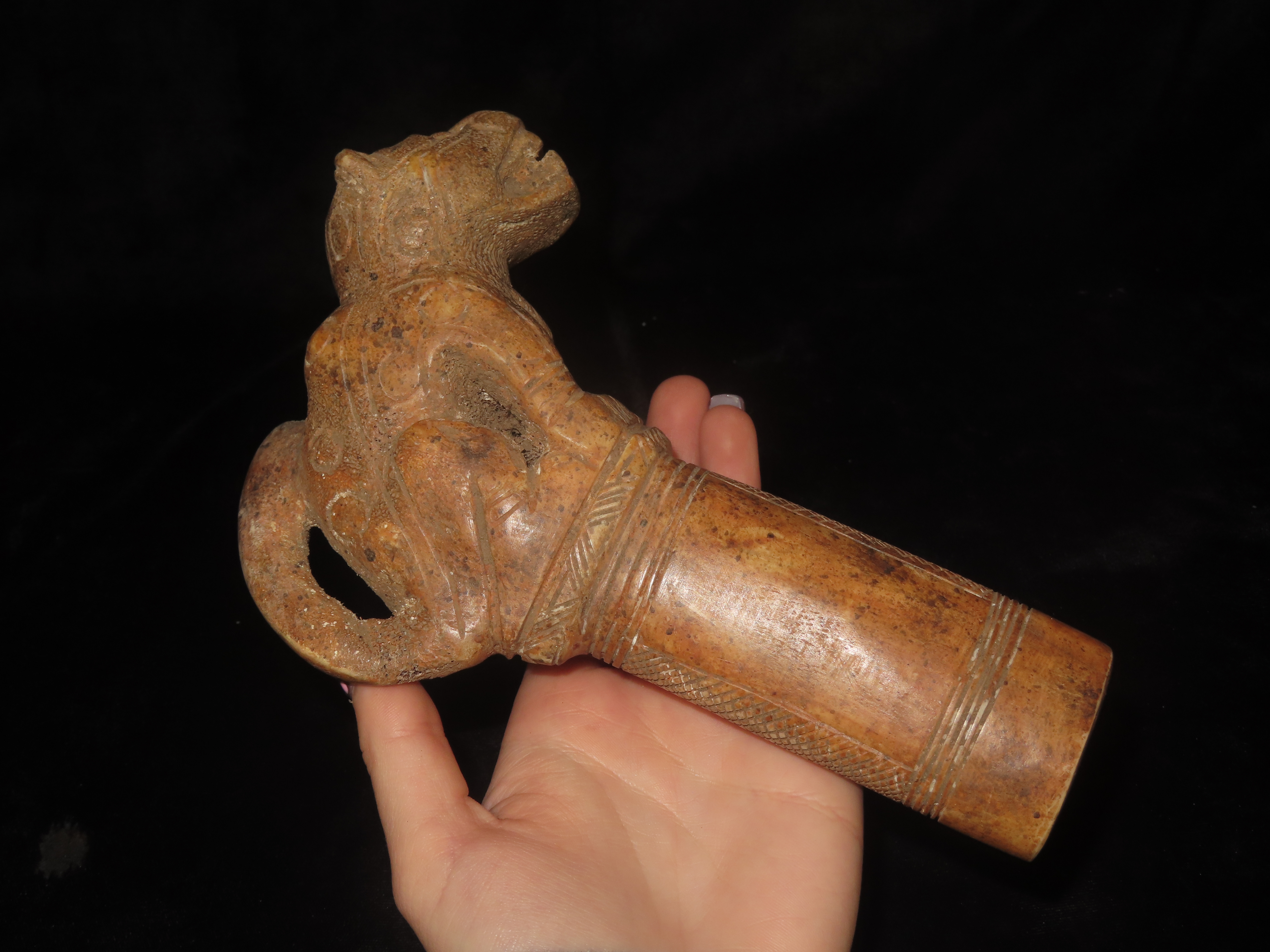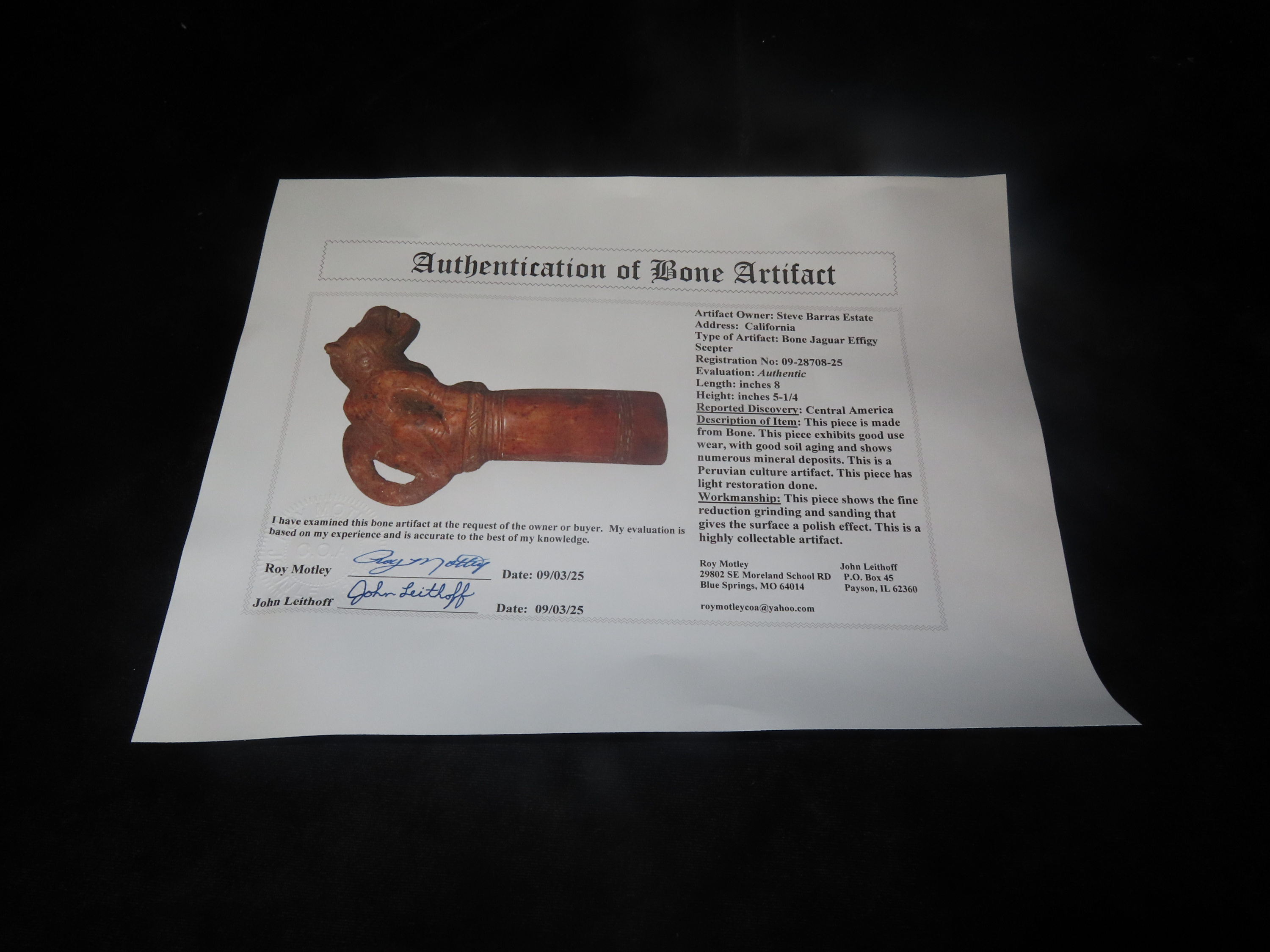 8″ X 5 1/4″ Pre Columbian Bone Scepter, Jaguar Effigy, Motley COA, Leithoff COA, Central America