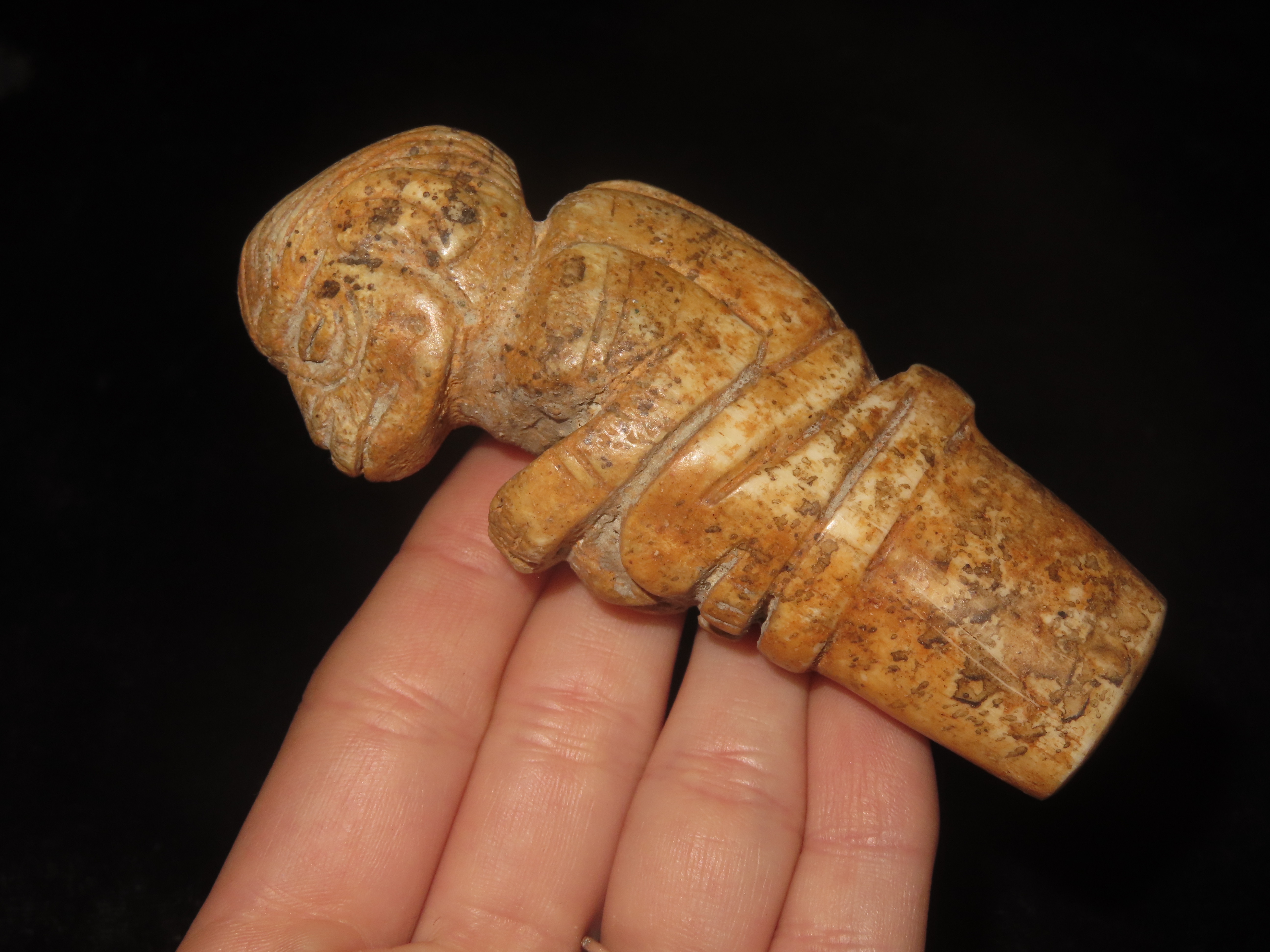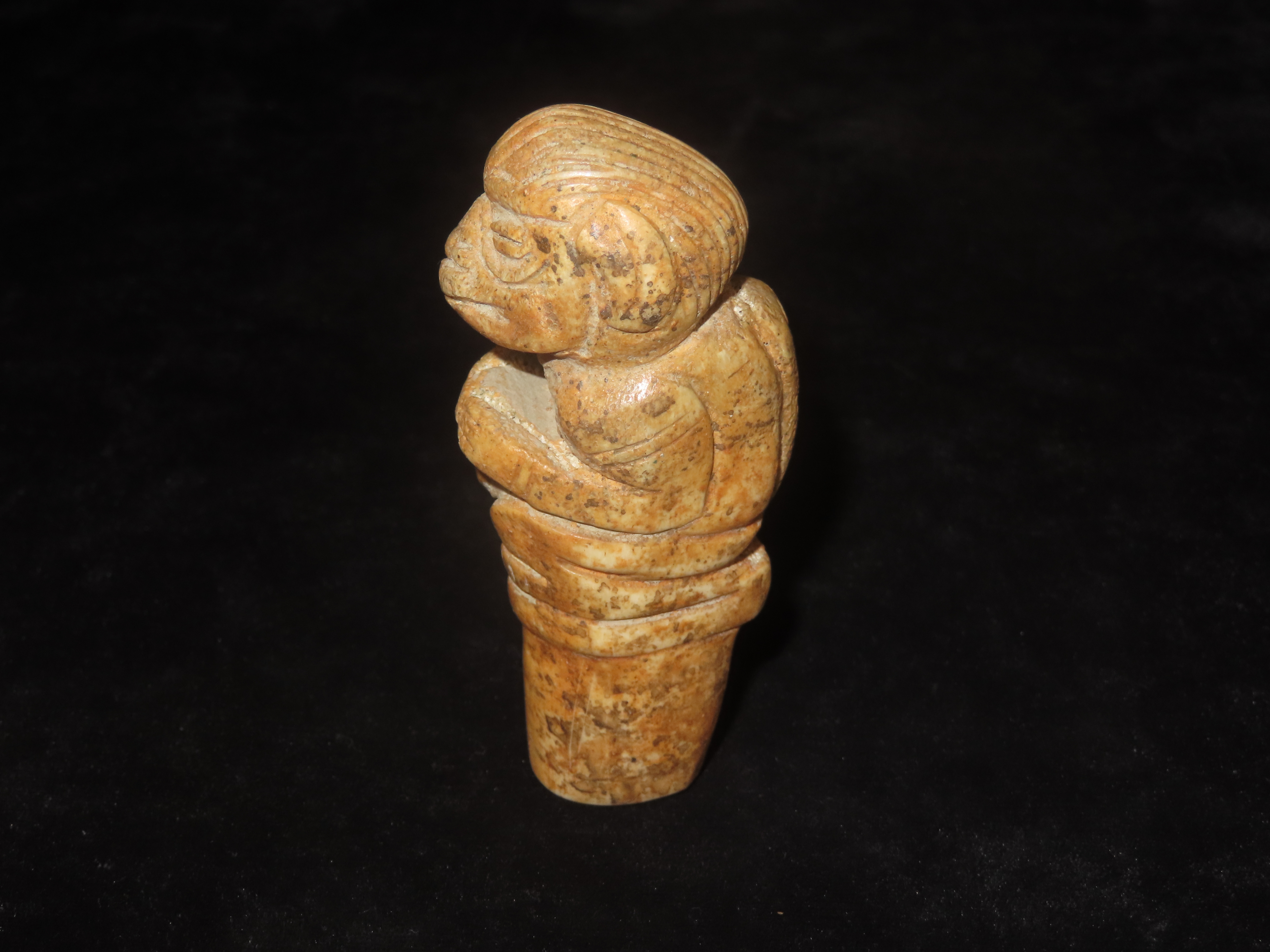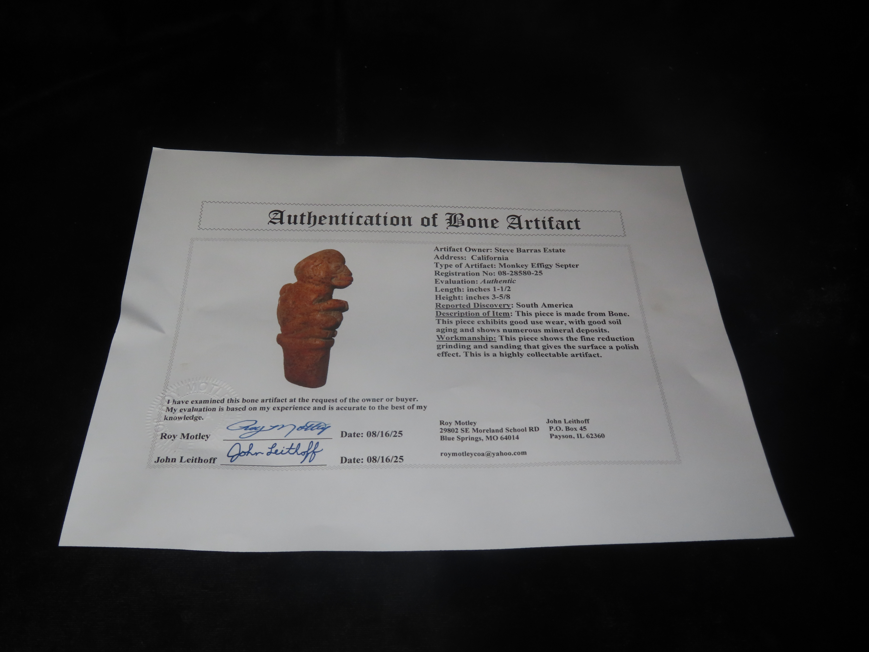 3 5/8″ x 1 1/2″ Pre-Columbian Tairona Monkey Effigy Carved Bone Scepter Finial, Motley COA, found in South America, Ex Steve Barras Collection
