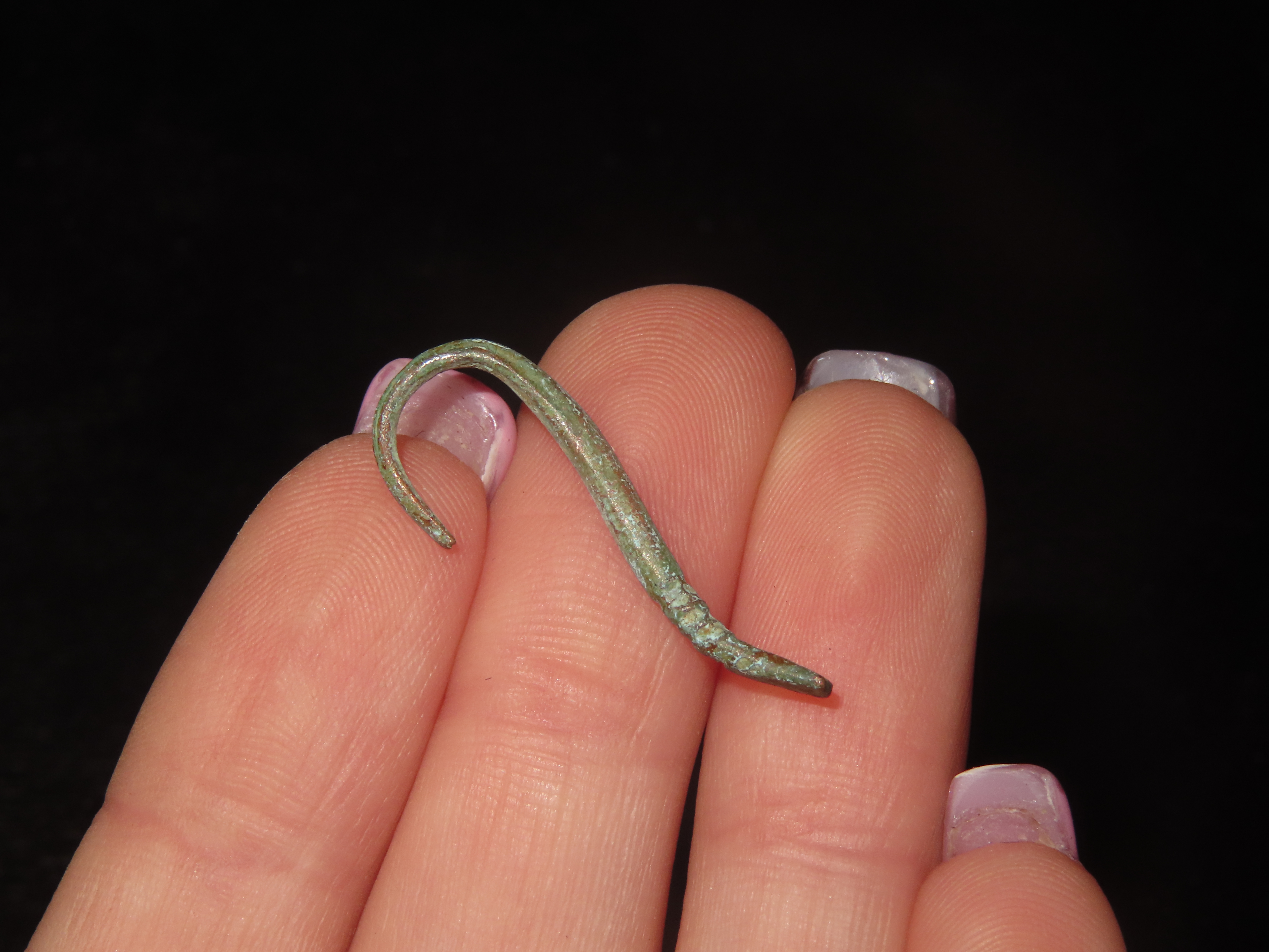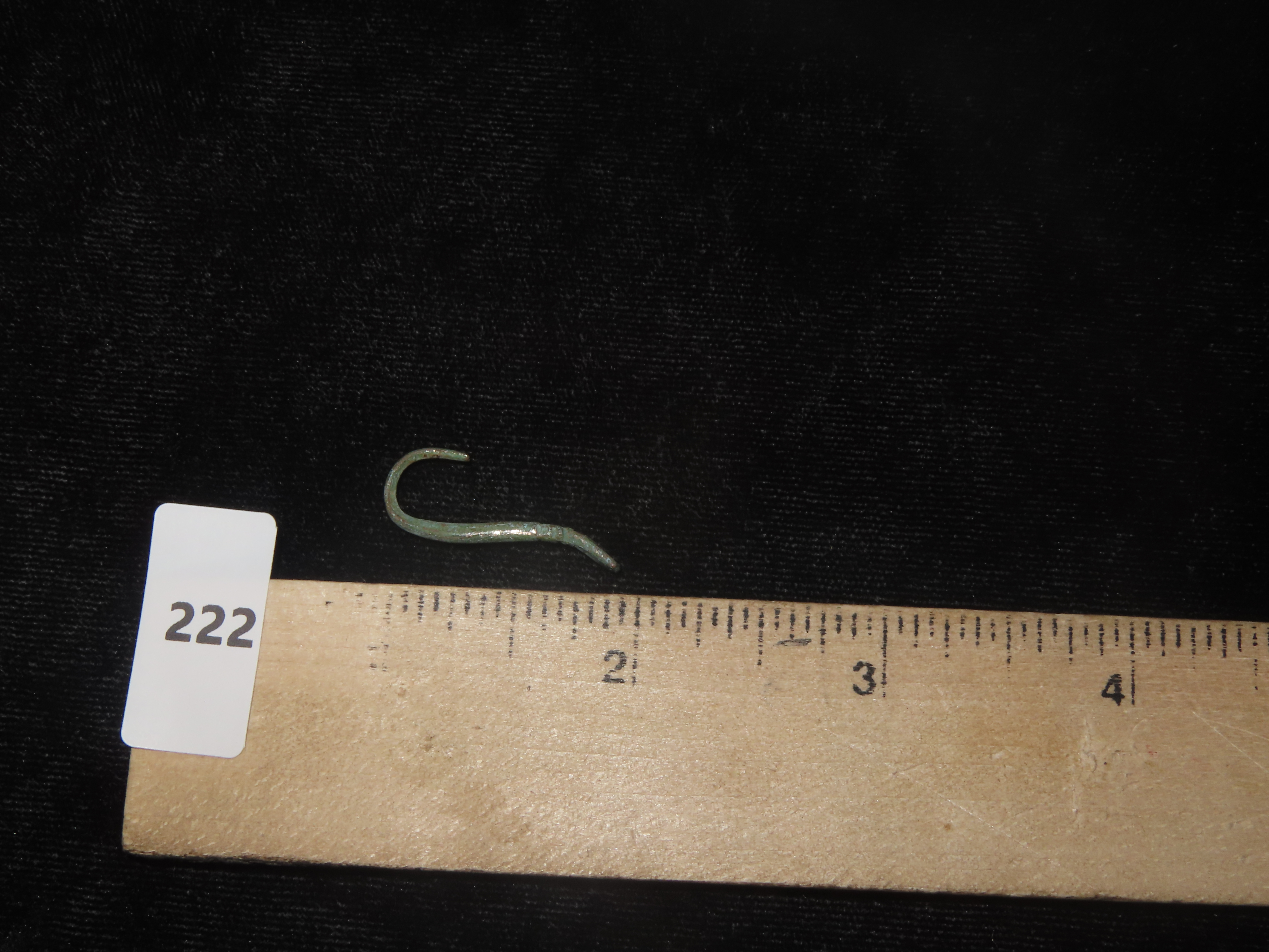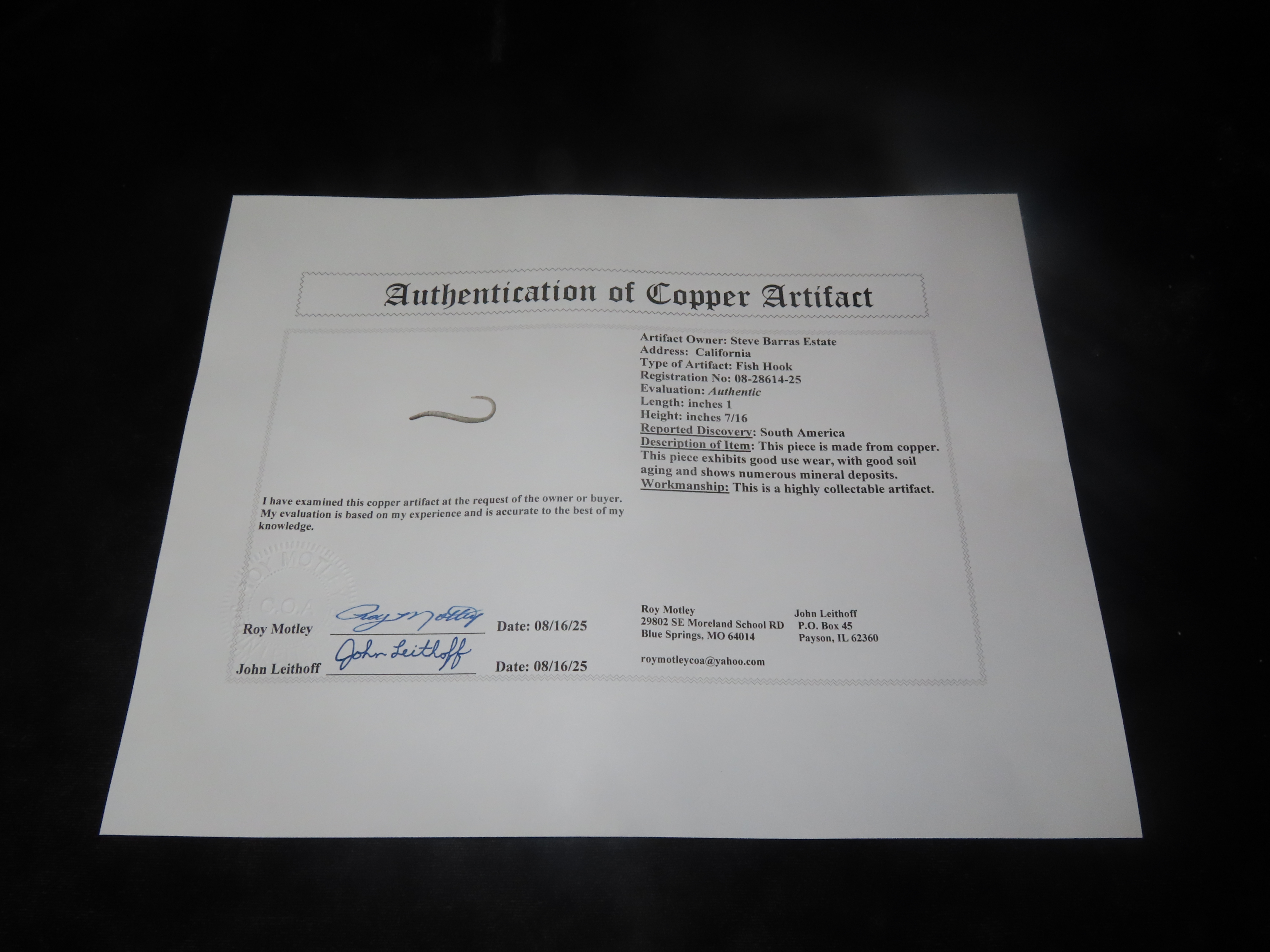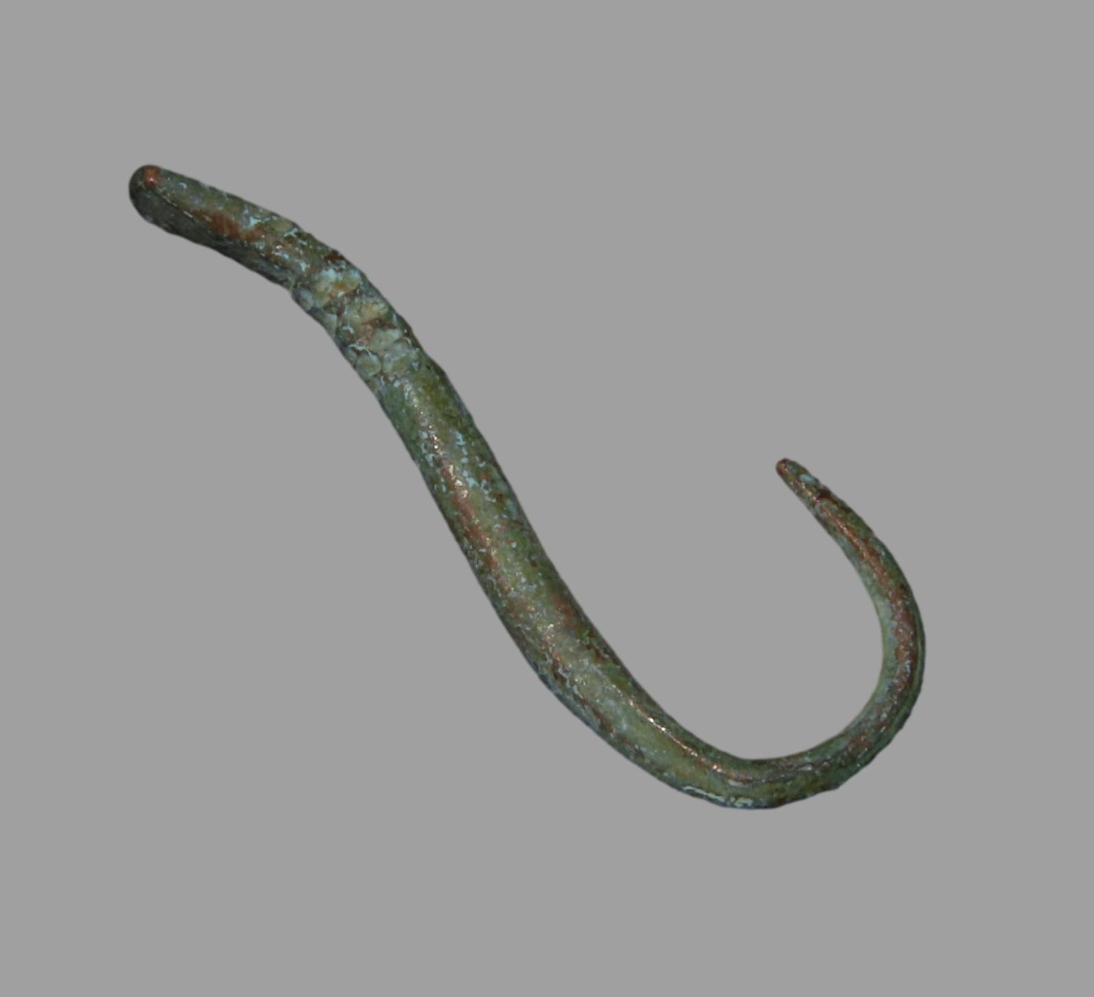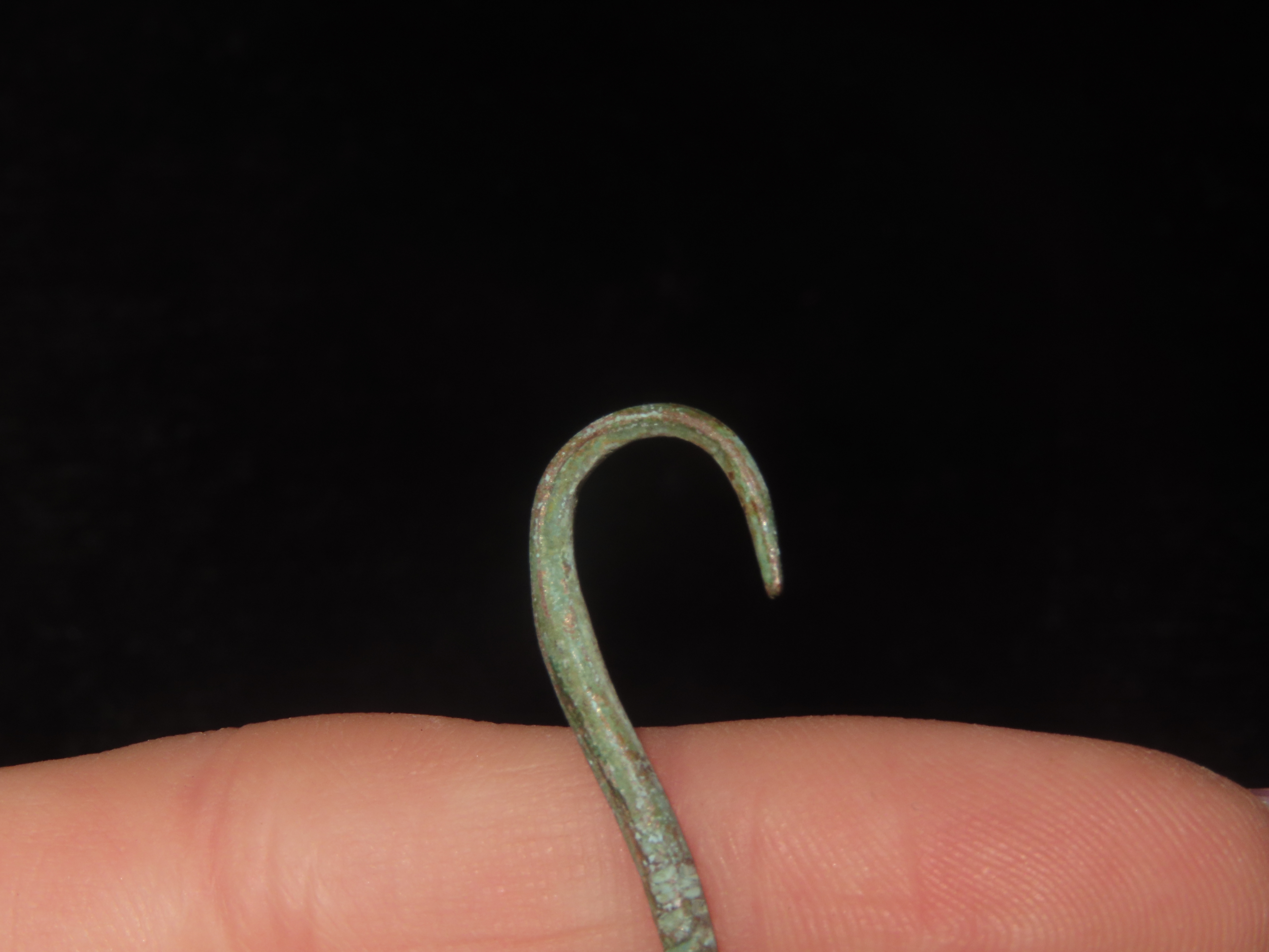 1″ x 7/16″ Pre-Columbian Copper Fish Hook, Motley COA, found in South America, Ex Steve Barras Estate