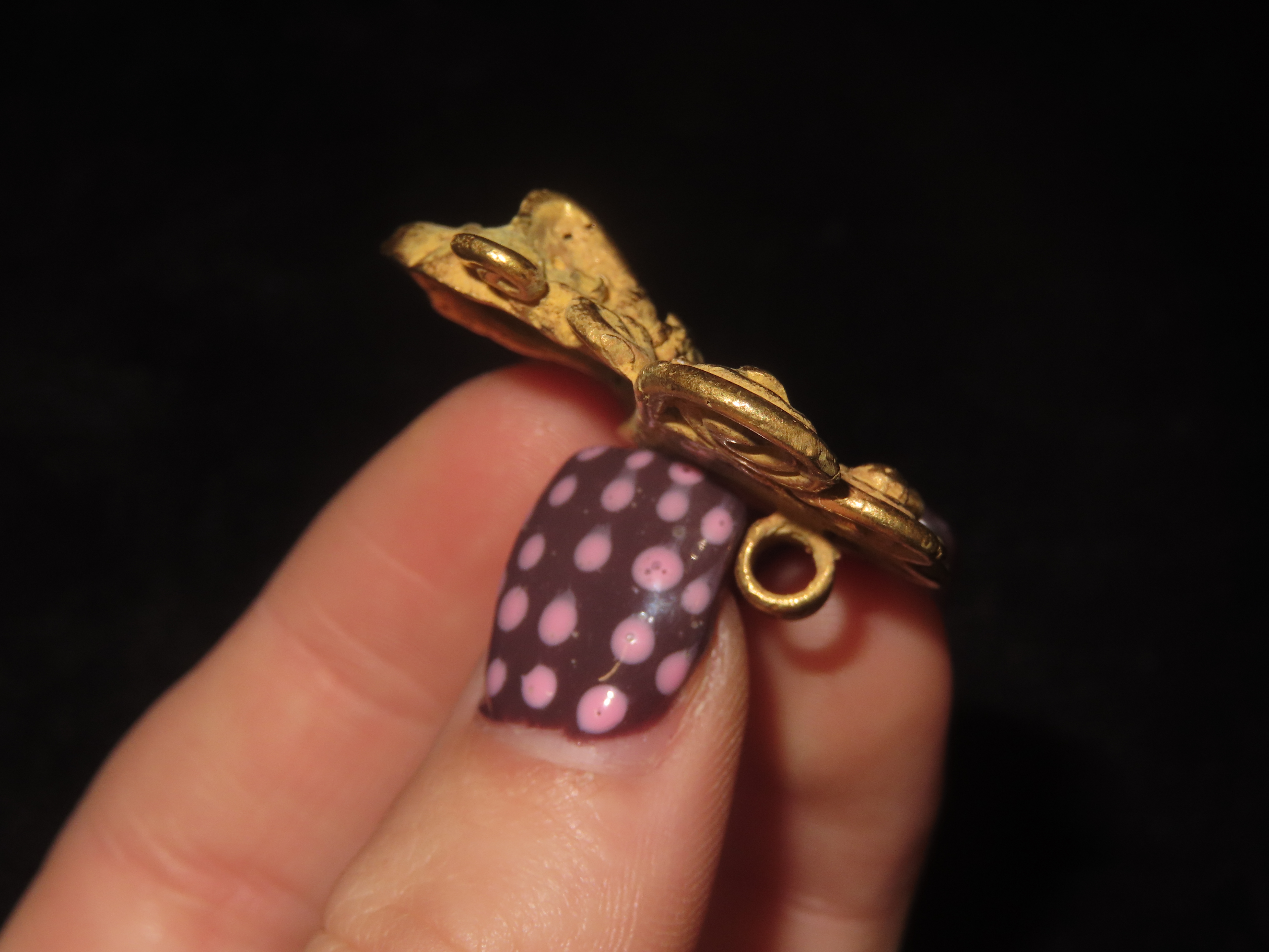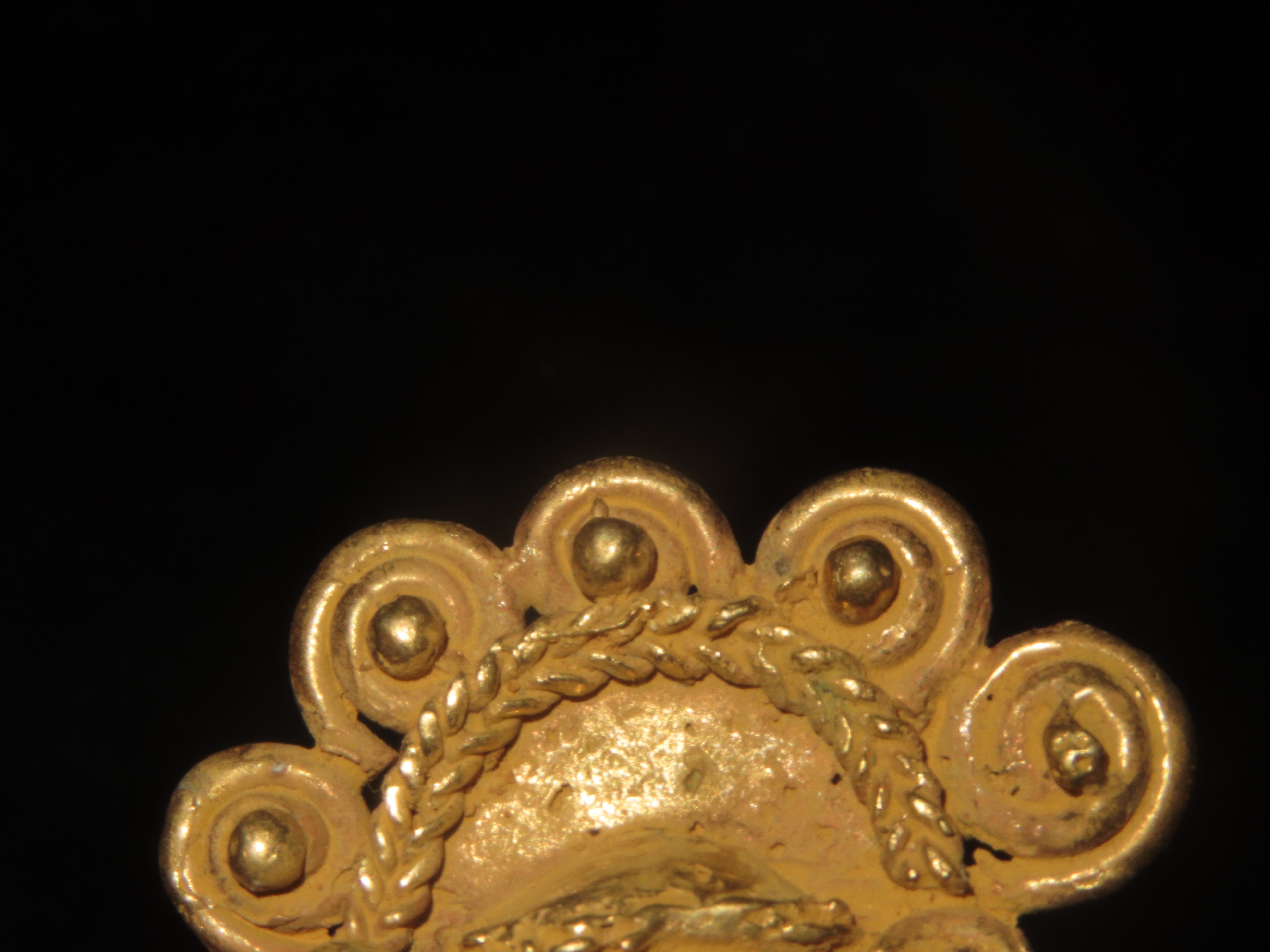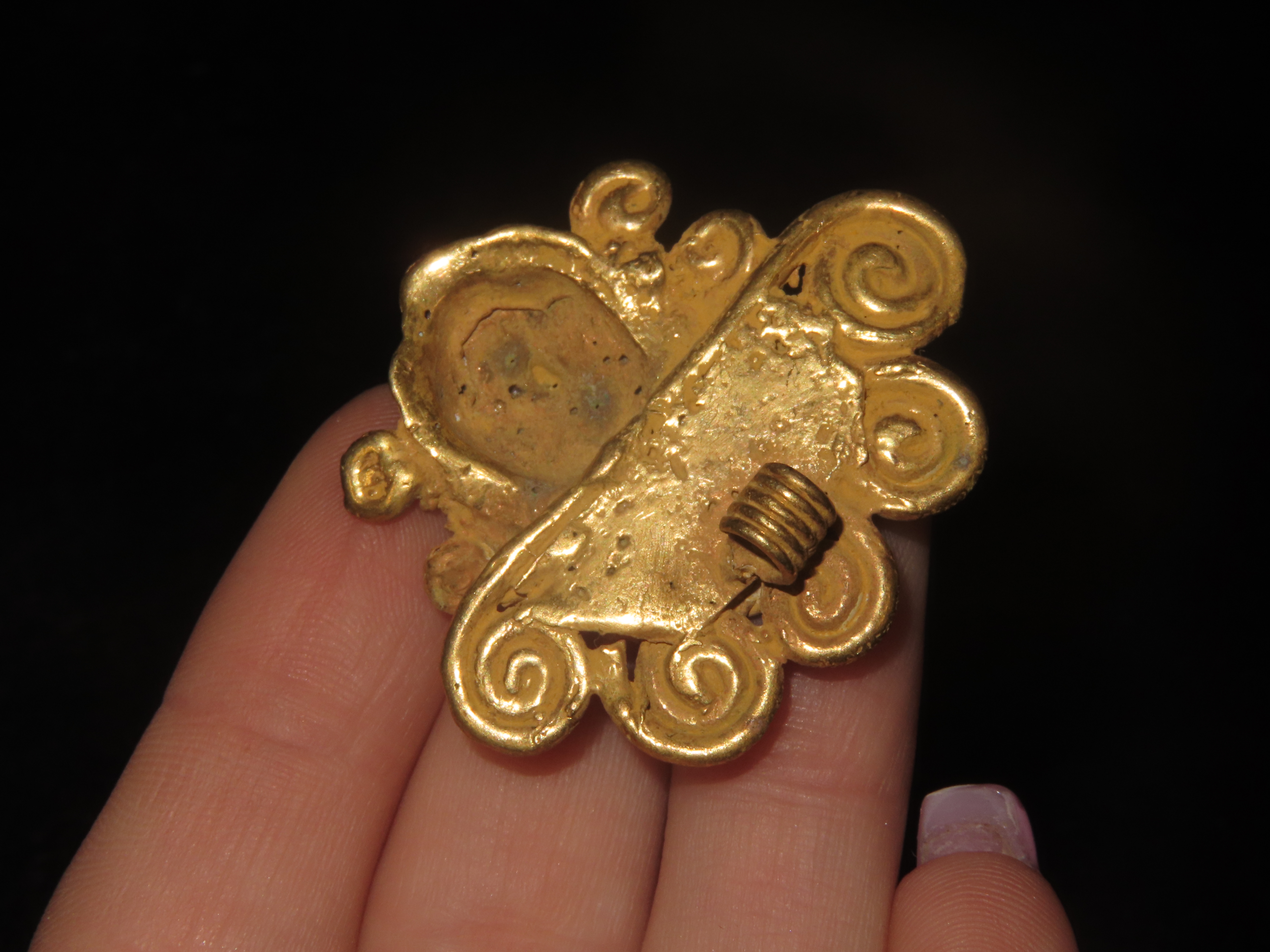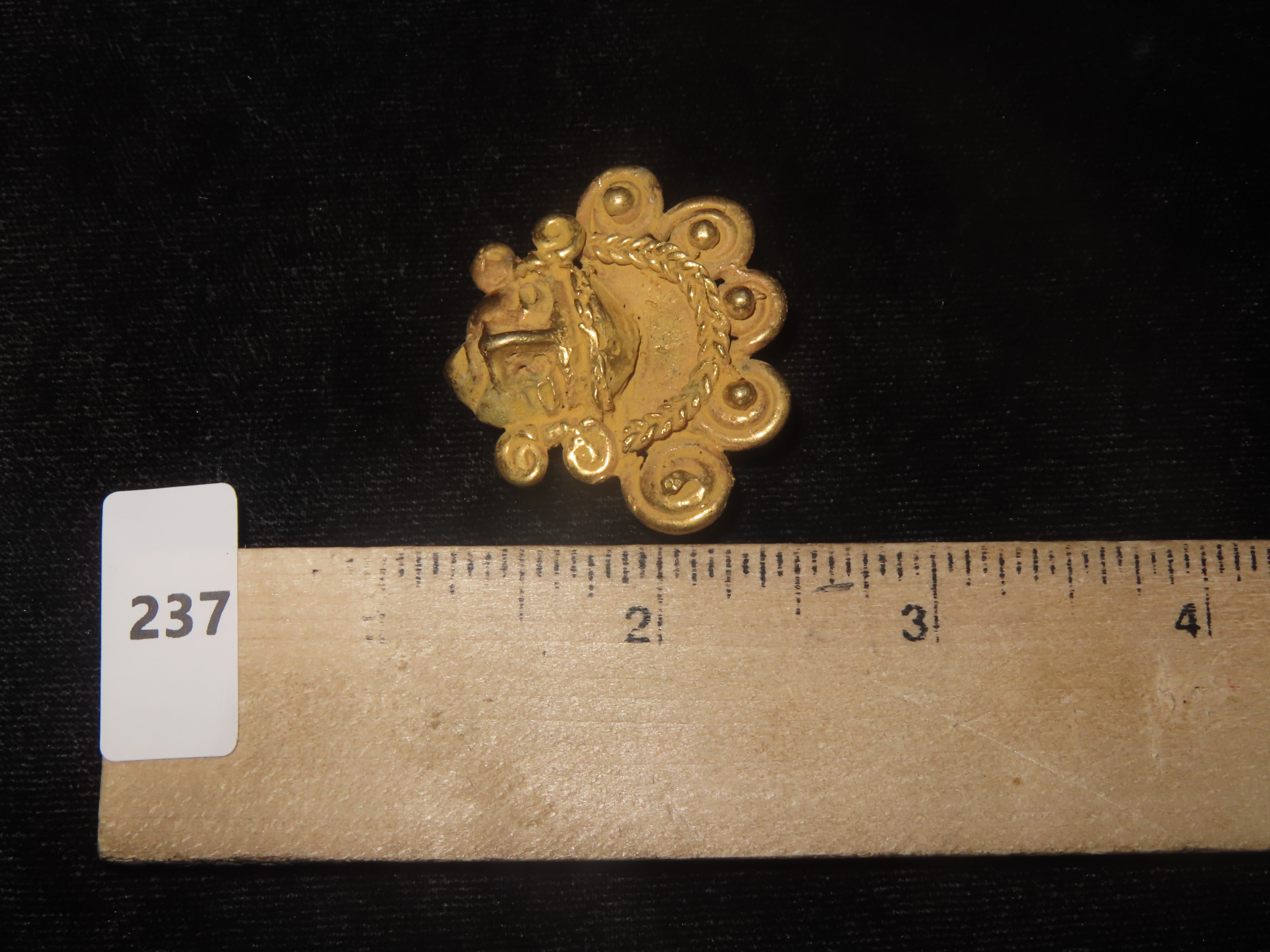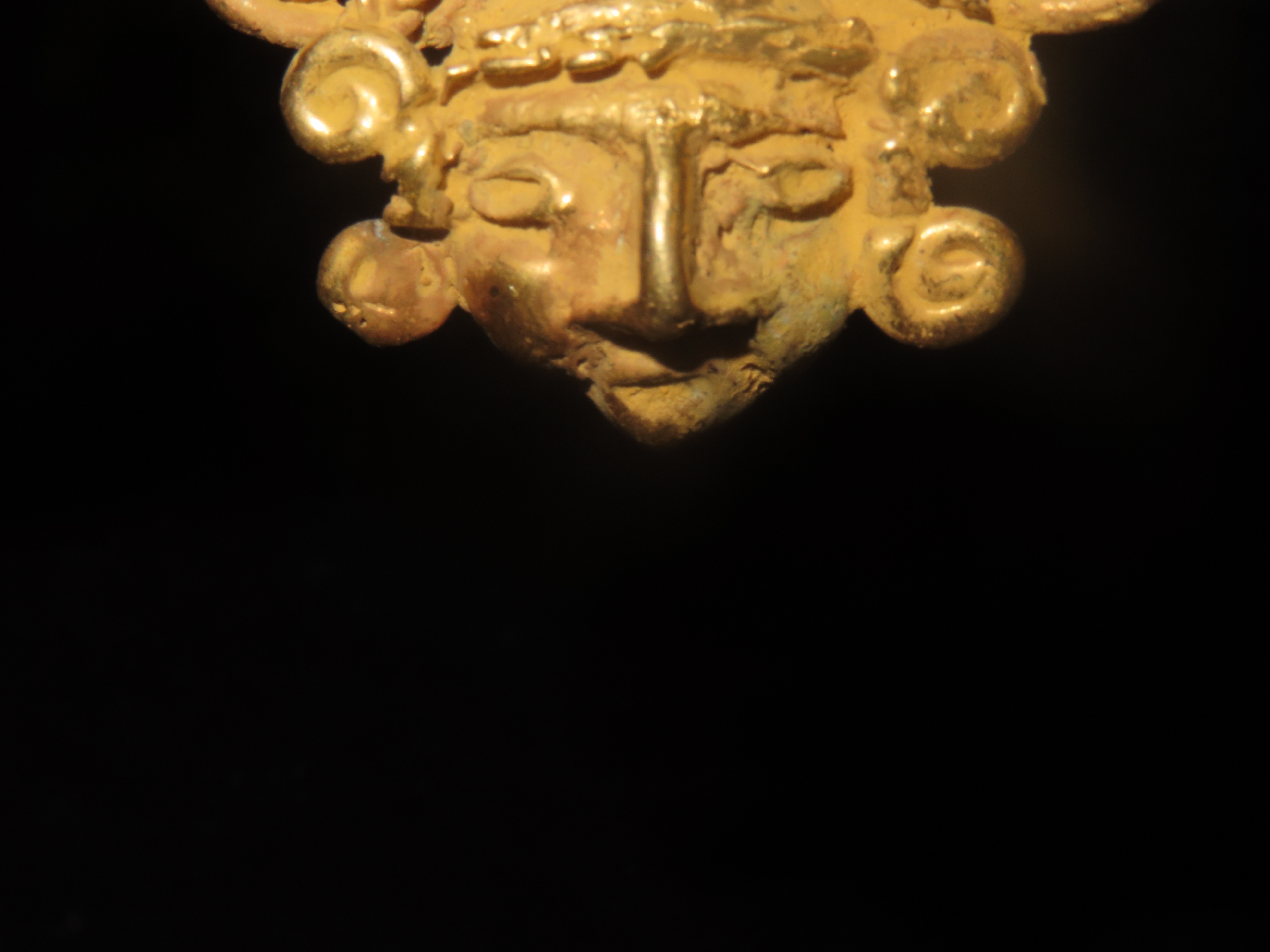 1 1/4″ Pre Columbian Tairona Tumbaga Maskette Figurine Pendant, Gold/Copper Alloy