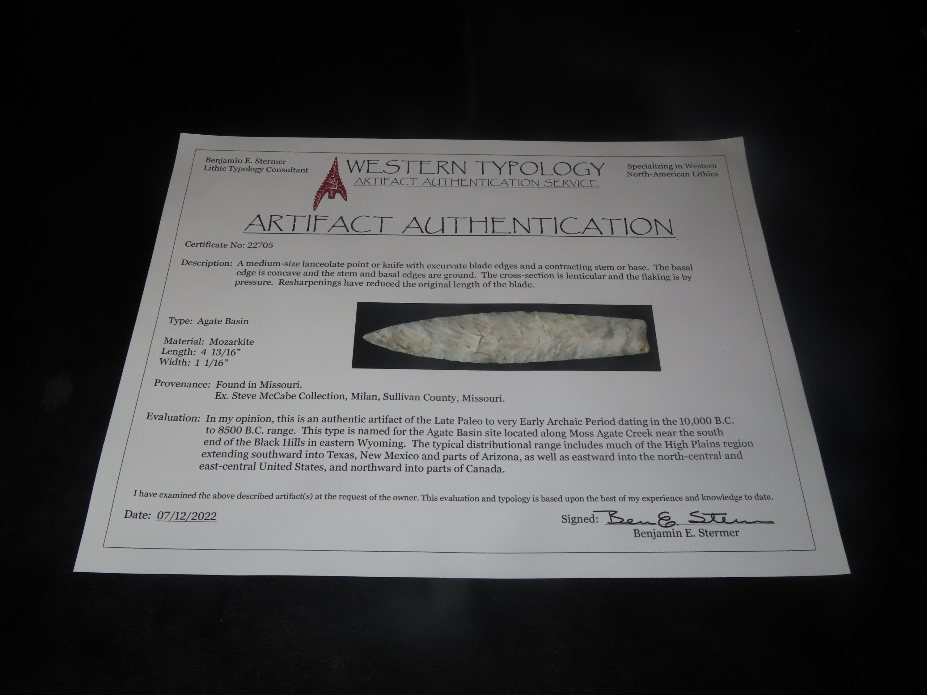4 13/16″ X 1 1/16″ Agate Basin, Mozarkite, Stermer COA, EX Steve McCabe Collection, Milan, Sullivan County, Missouri