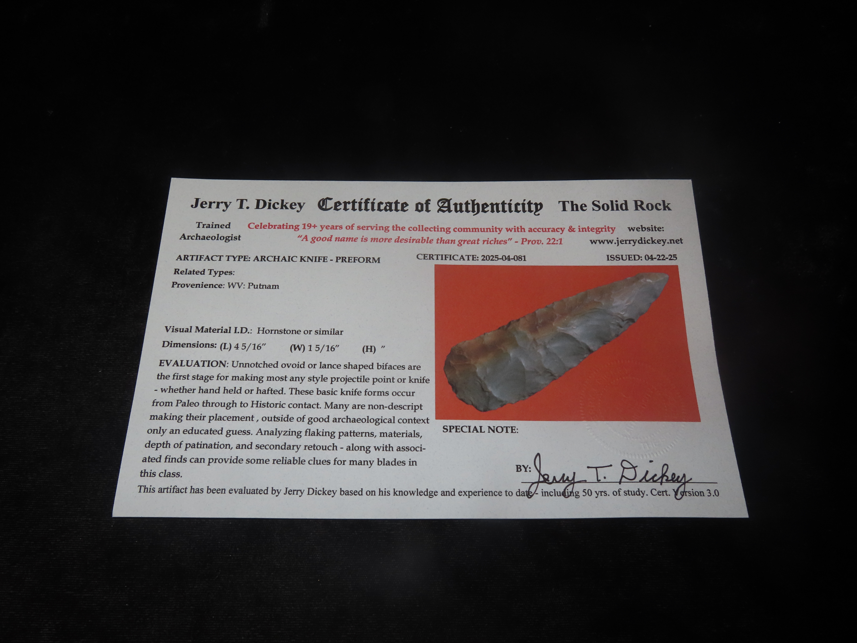 4 5/16″ X 1 5/16 Archaic Knife – Preform, Honest One or similar, Jerry Dickey COA, Putnam, West Virginia
