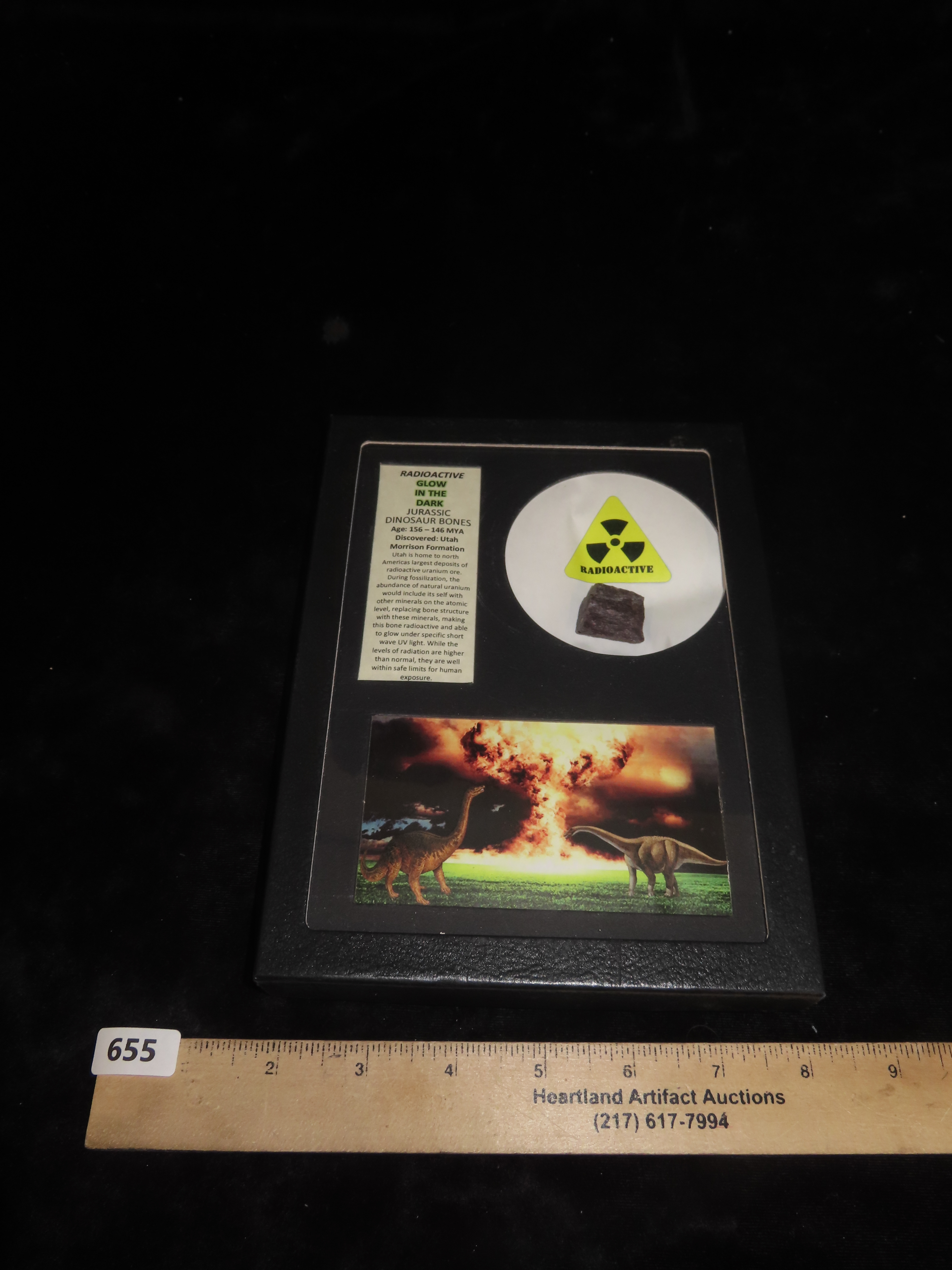 8 3/8" x 6 1/2" Case with Radioactive Glow in the Dark Jurassic Dinosaur Bone, 156 - 146 MYA, Discovered in Utah, Morrison Formation