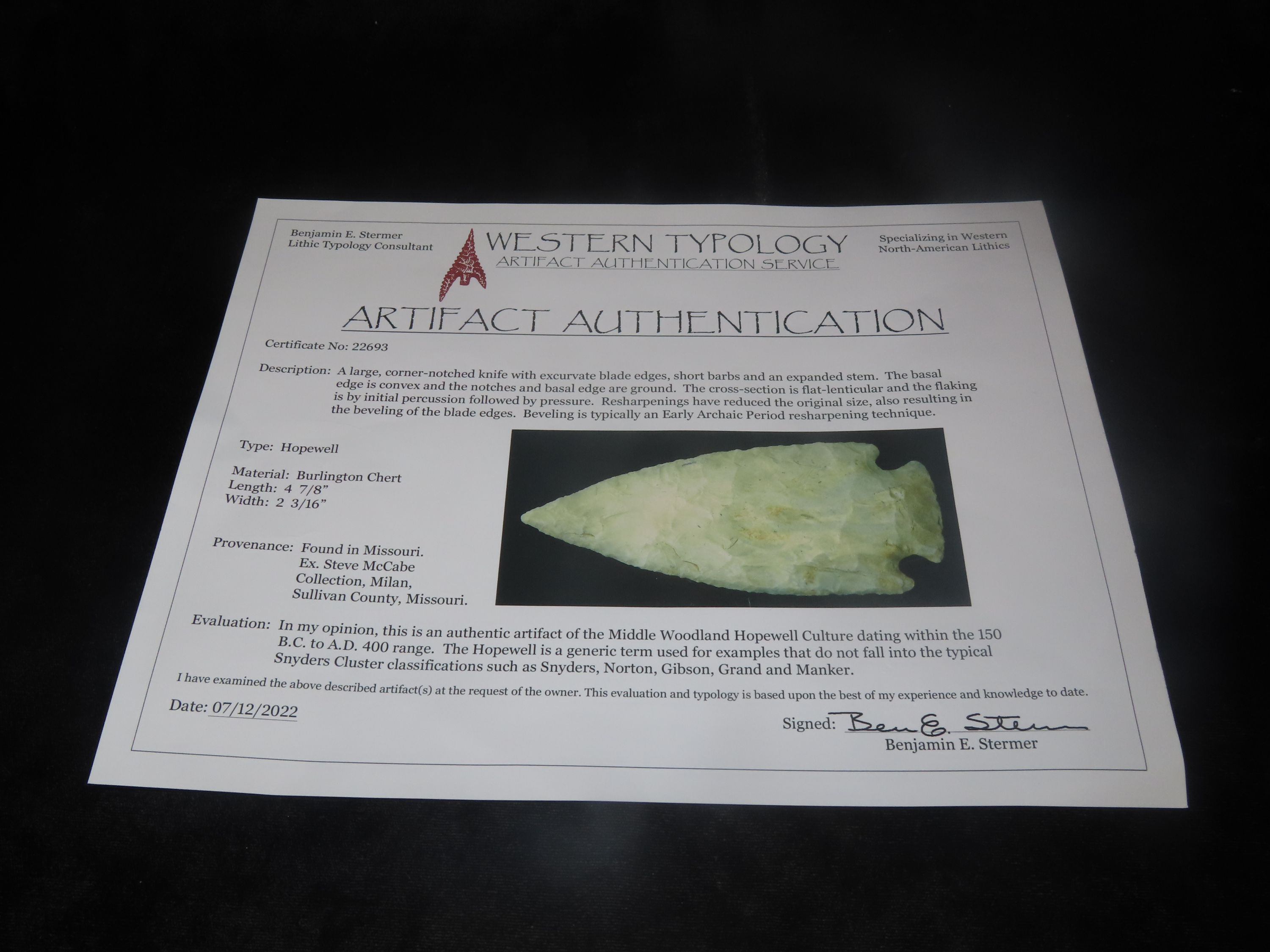 4 7/8″ X 2 3/16″ Burlington, Chert, Hopewell, Stermer COA, Found in Missouri, EX Steve McCabe
