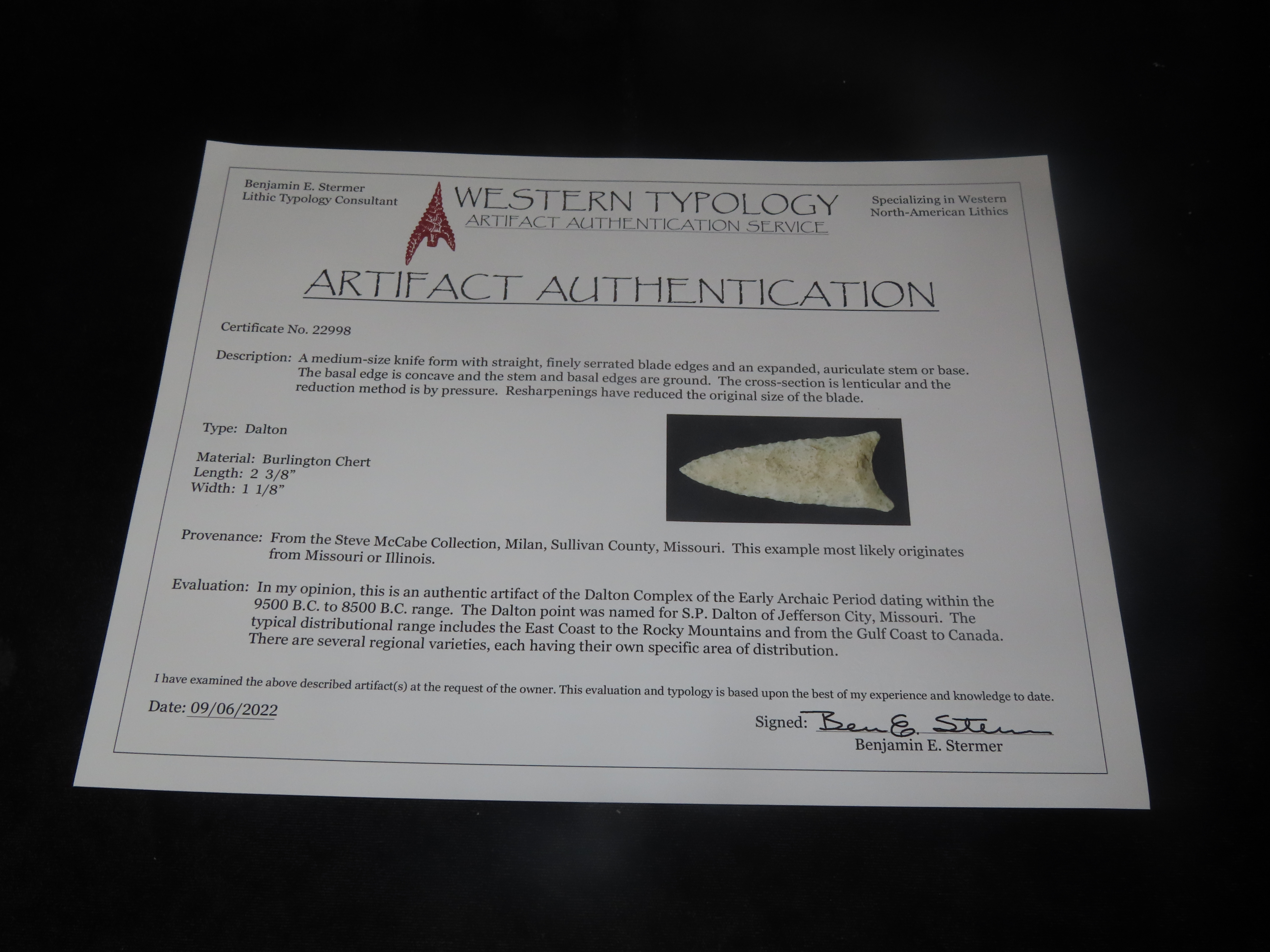 2 3/8" X 1 1/8" Burlington Chert, Dalton, Stermer COA, EX Steve McCabe Collection, Milan, Sullivan County, Missouri
