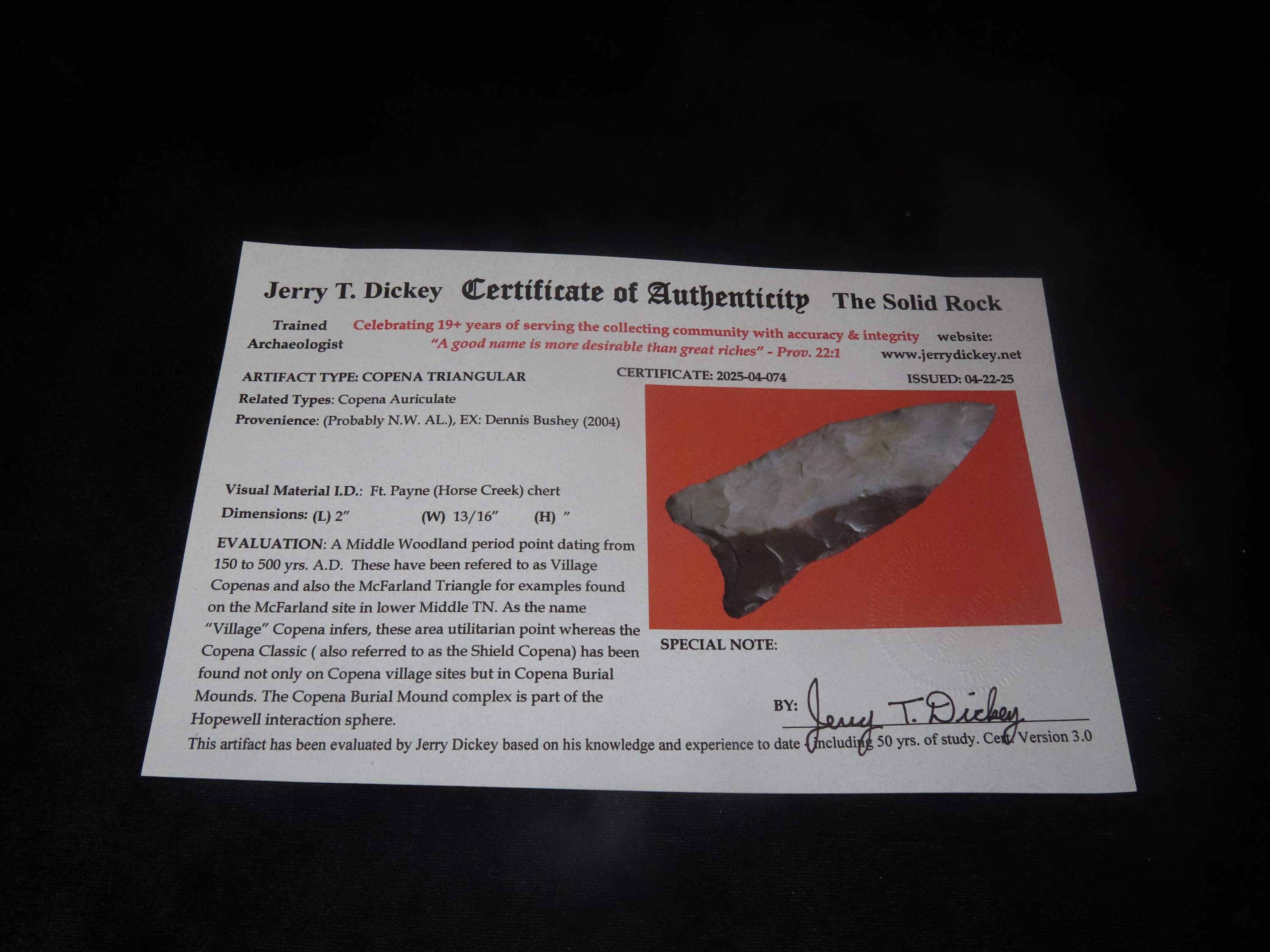 2″ X 13/16″ Copena Triangular, Ft. Payne (Horse Creek chert), Jerry Dickey COA, EX Dennis Bushey (2004), Found in Northwest Alabama