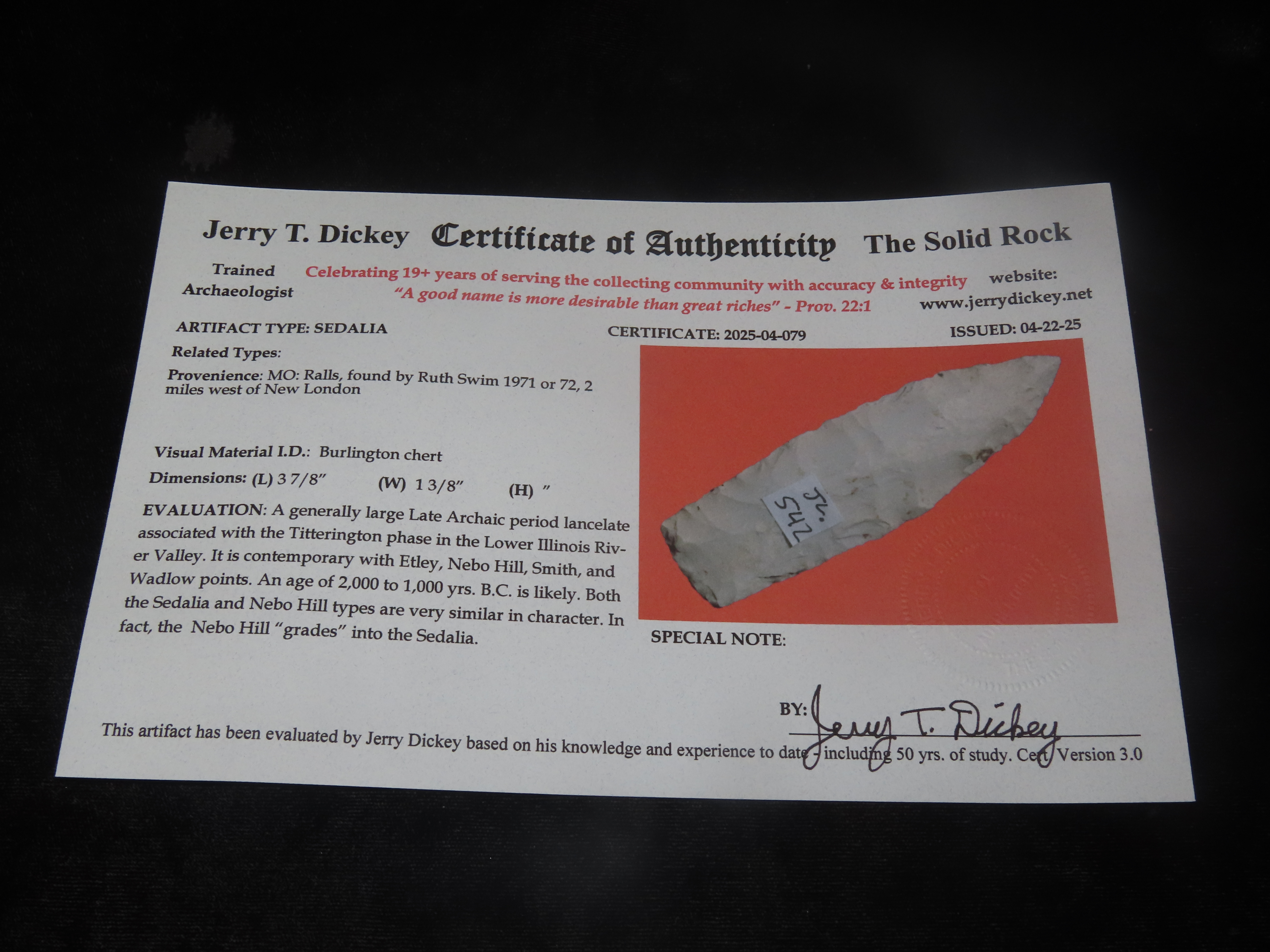 3 7/8″ X 1 3/8″ Sedalia, Burlington Chert, Jerry Dickey COA, Found by Ruth Swim 1971-72, Found in Ralls Co., MO