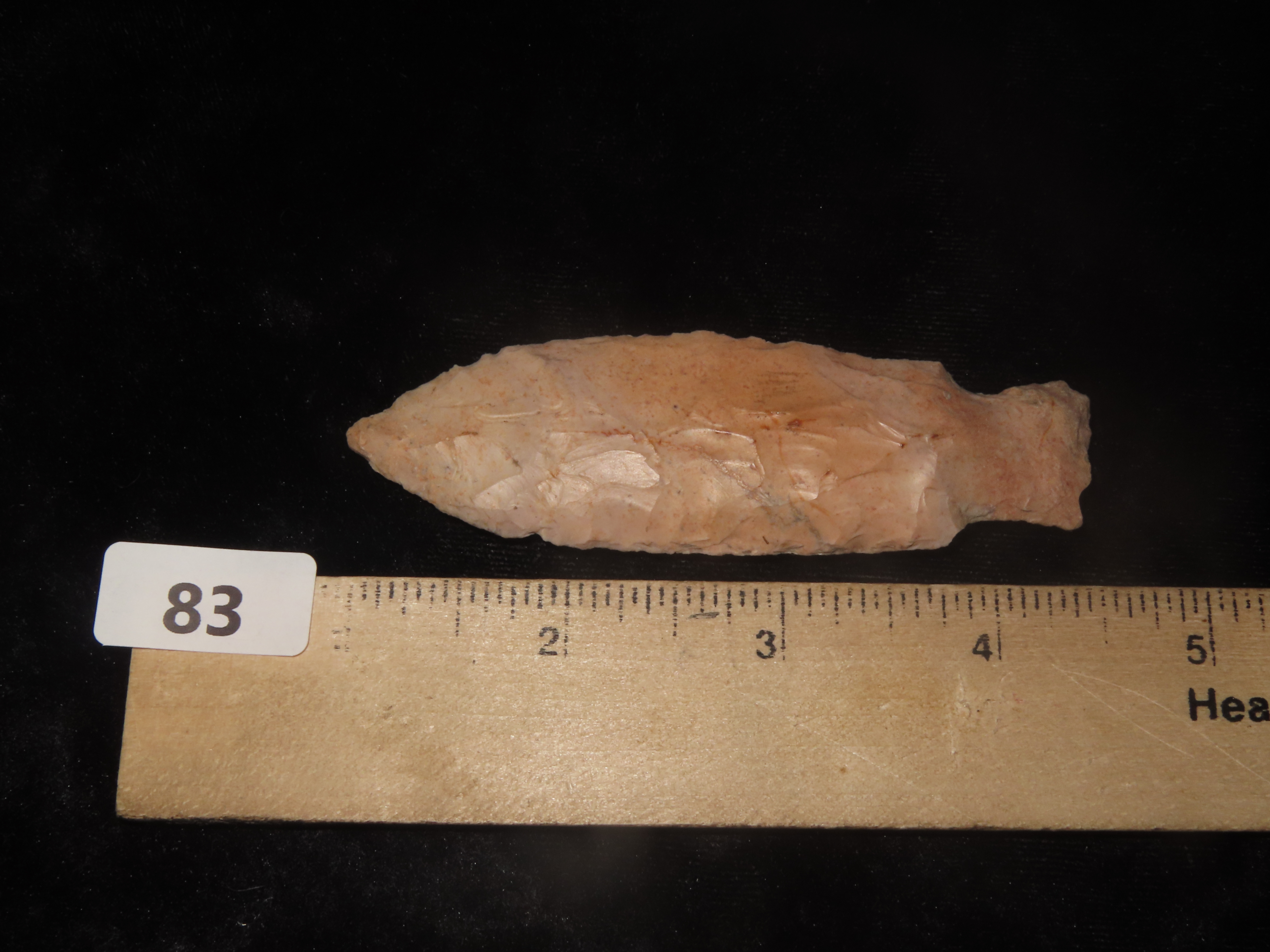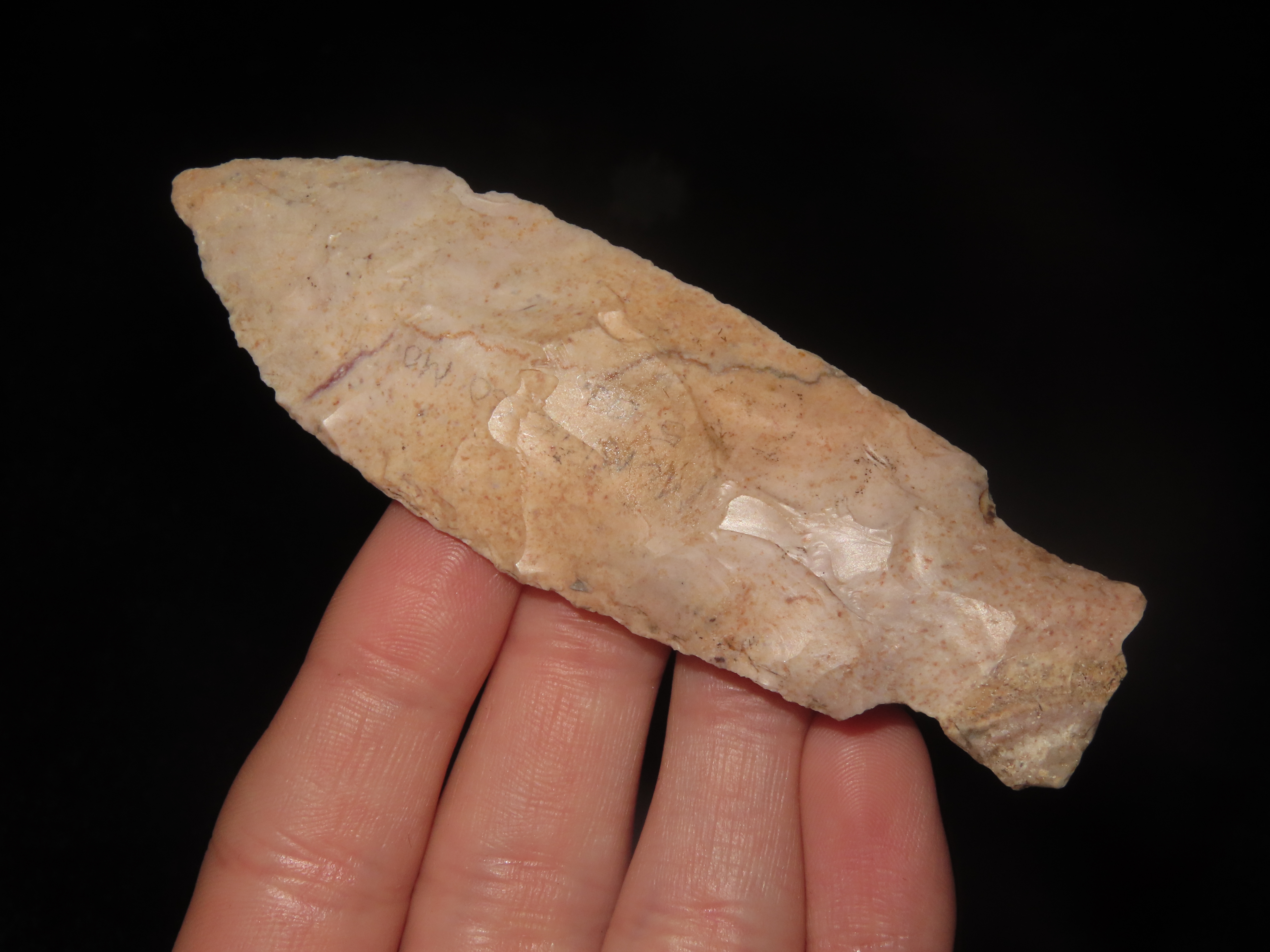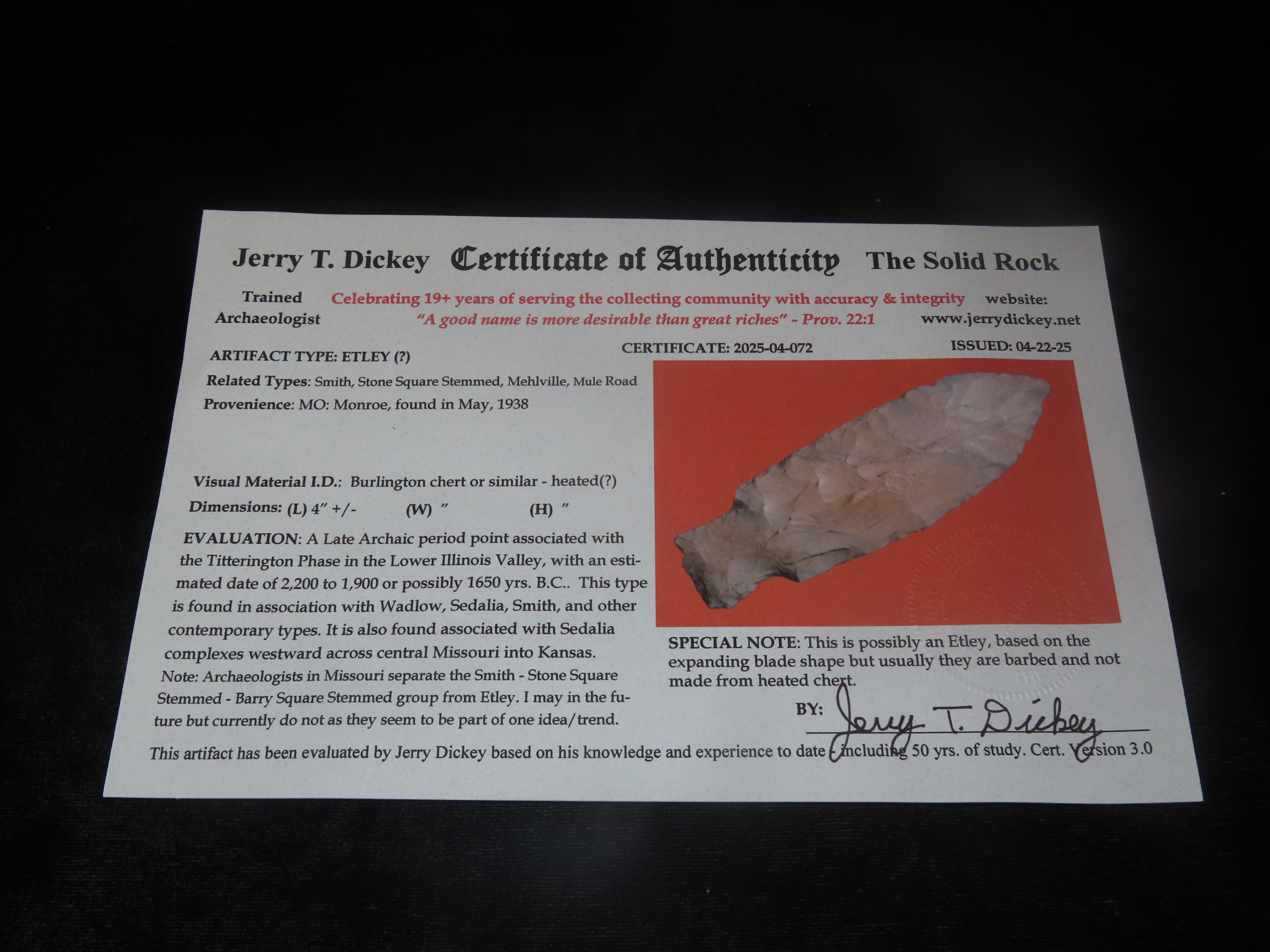 4″ Etley, Burlington chert (heated), Jerry Dickey COA, Found in May 1938, Found in Monroe Co., MO
