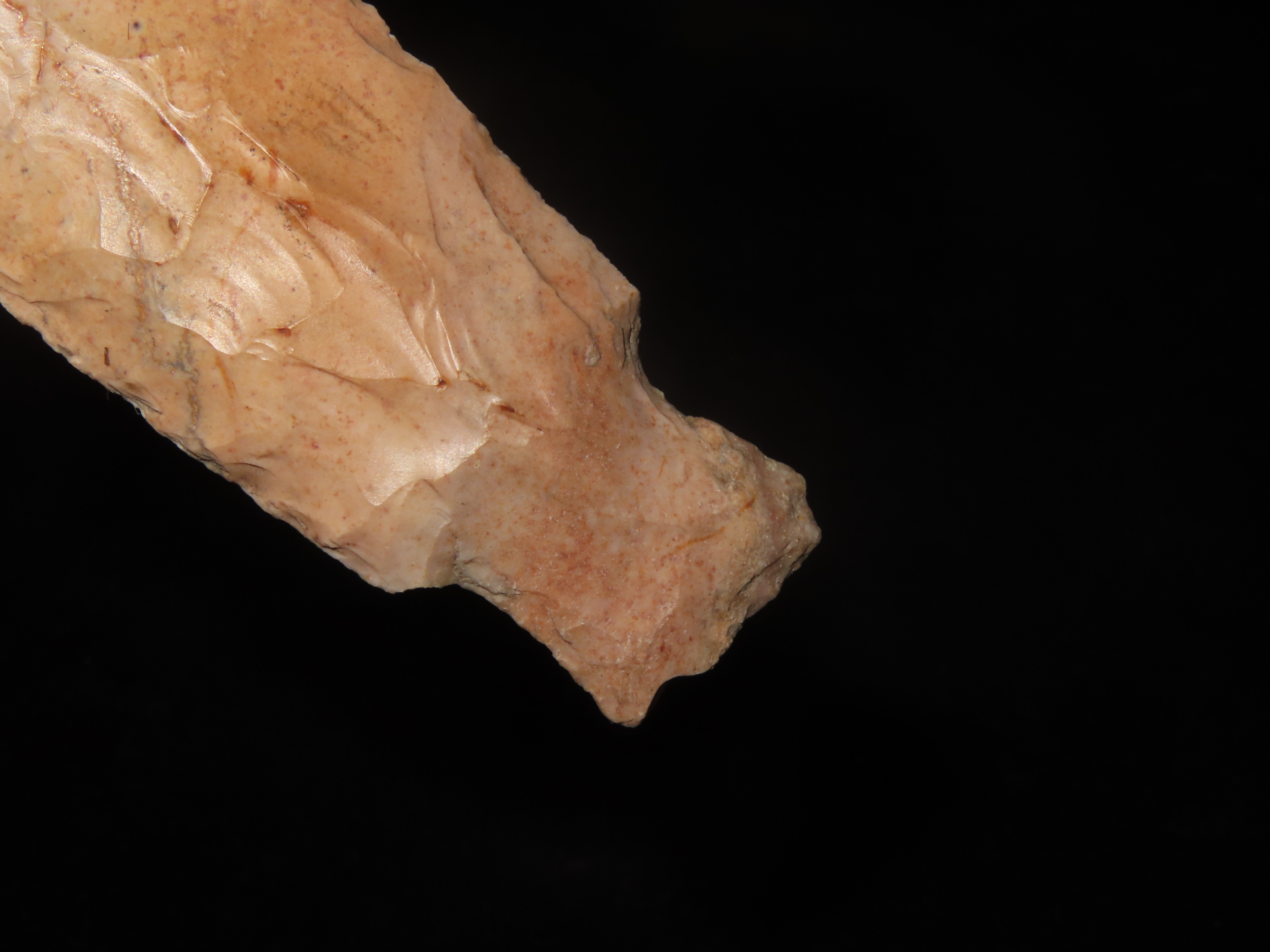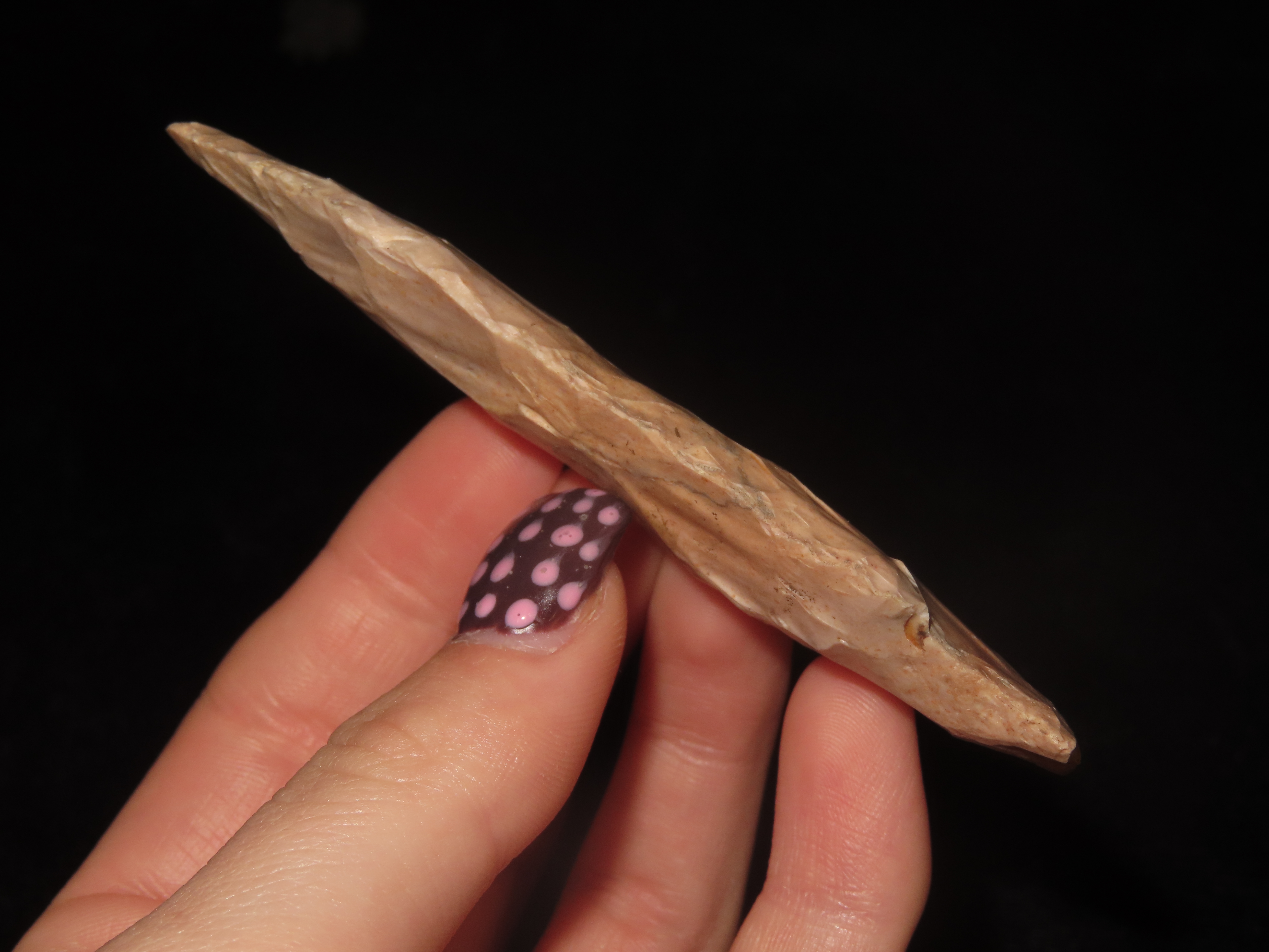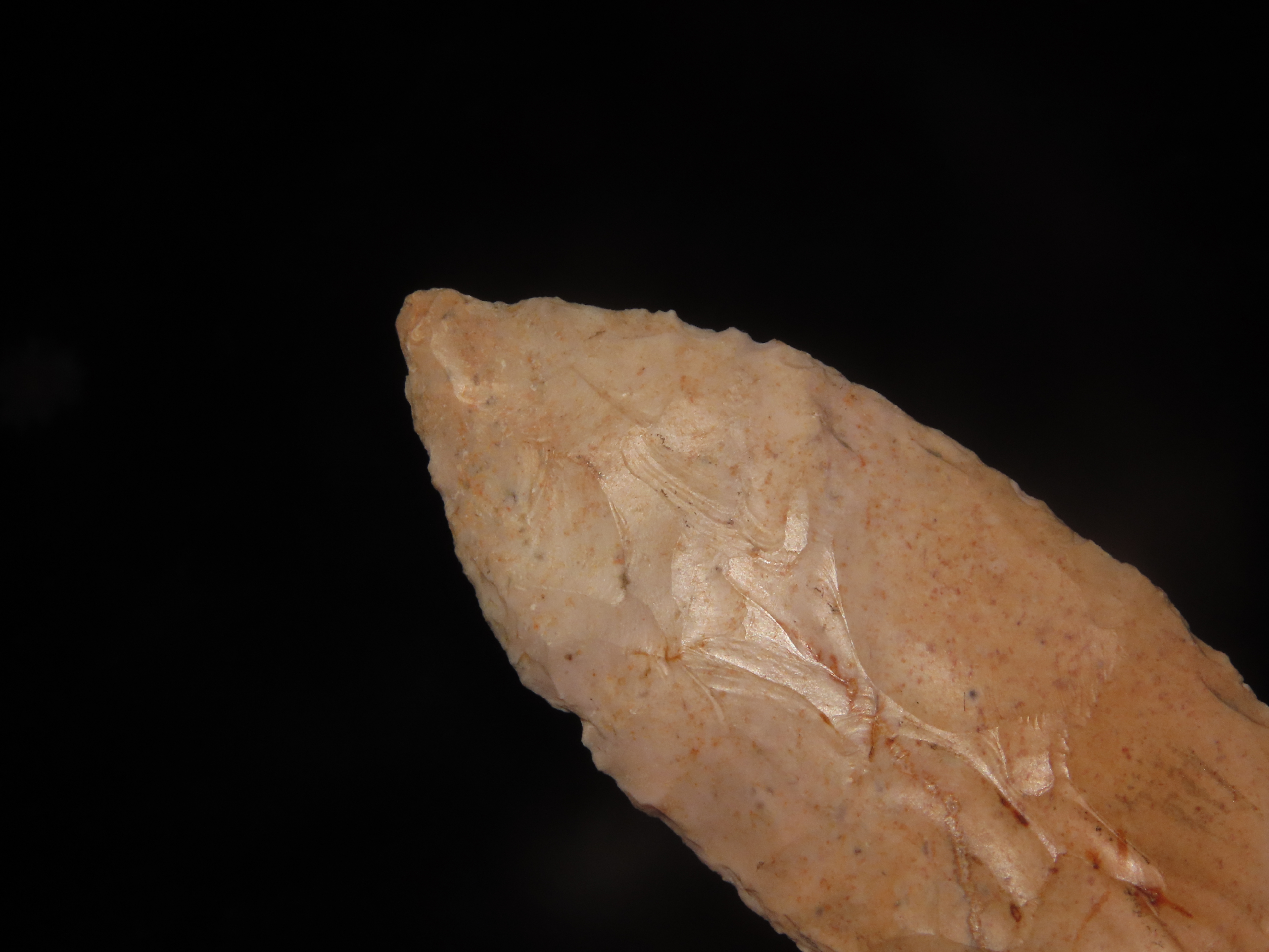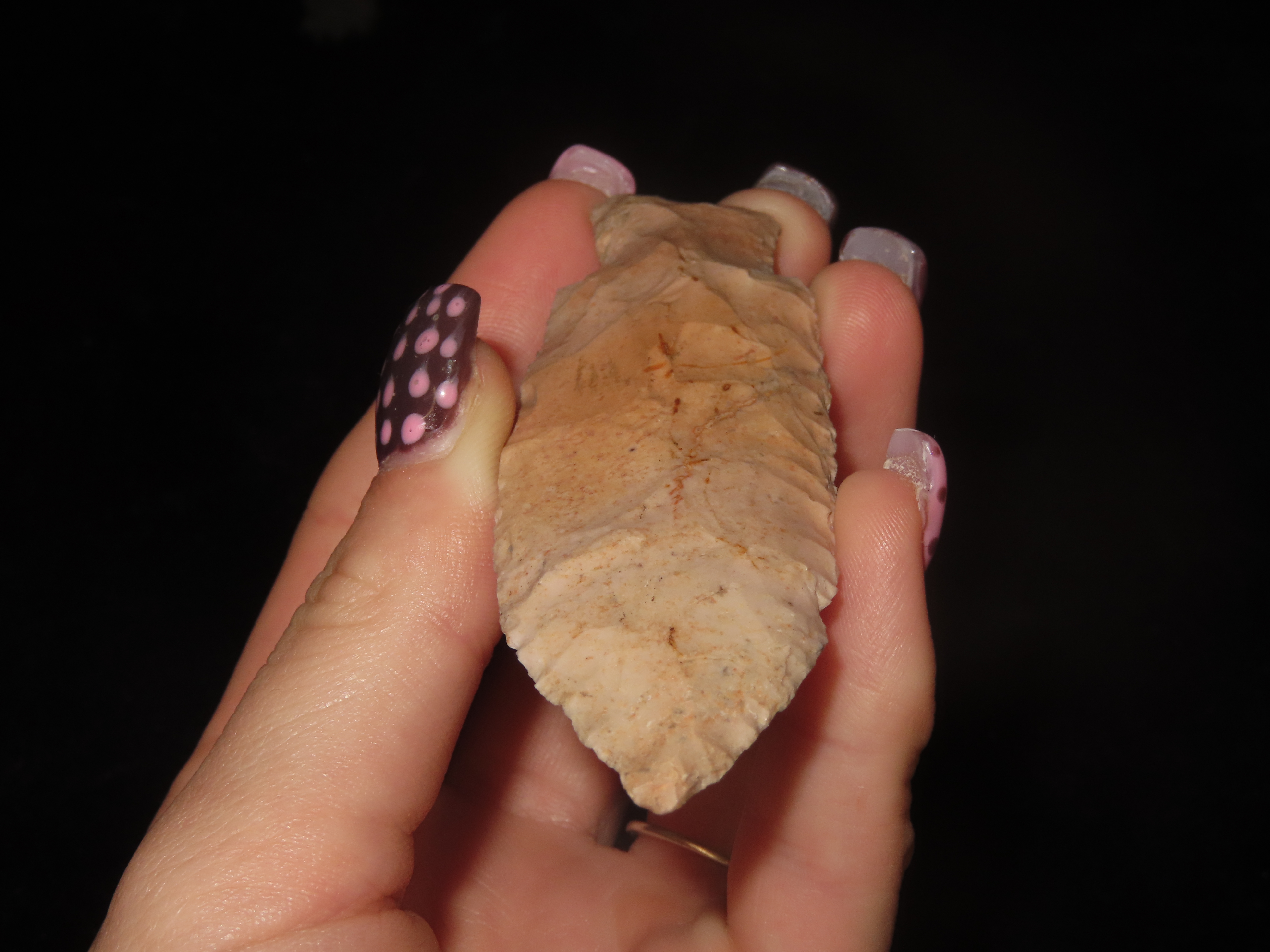 4″ Etley, Burlington chert (heated), Jerry Dickey COA, Found in May 1938, Found in Monroe Co., MO