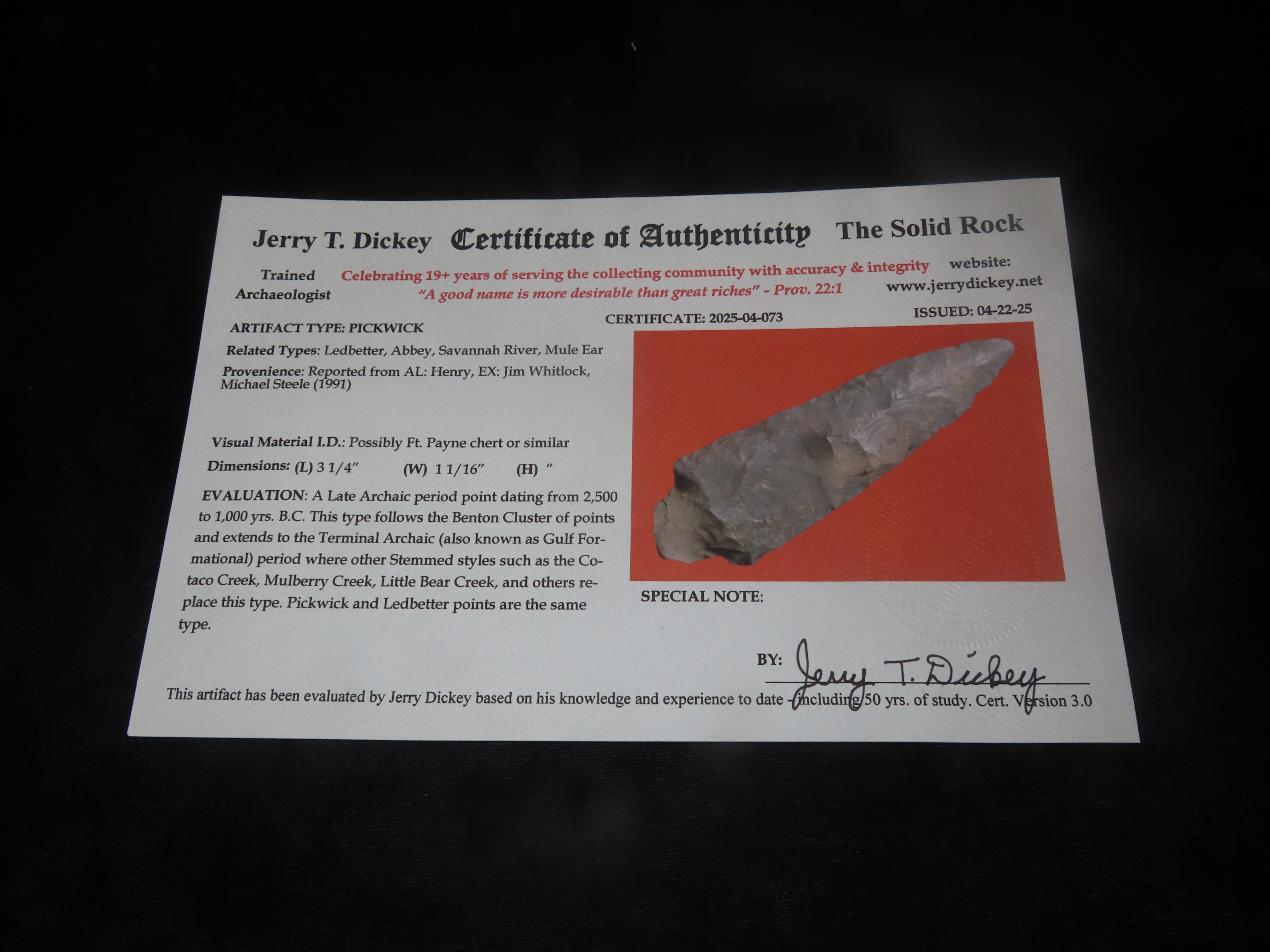 3 1/4″ X 1 1/16″ Pickwick, Ft. Payne chert, Jerry Dickey COA, EX Jim Whitlock, Michael Steele (1991), Found in AL