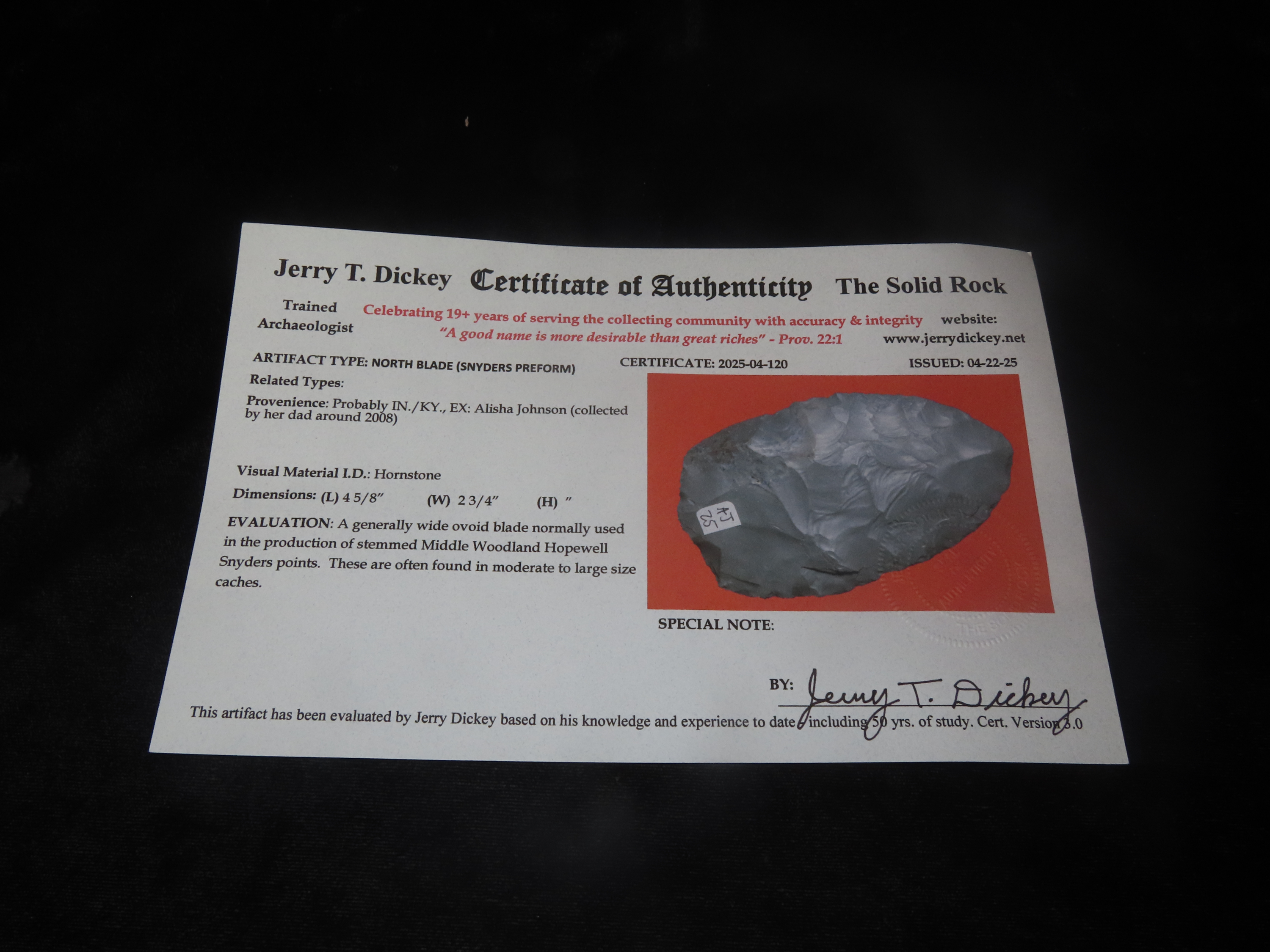 4 5/8″ X 2 3/4″ North Blade Snyders Preform, Hornstone, Jerry Dickey COA, EX Alisha Johnson, Found in IN or KY